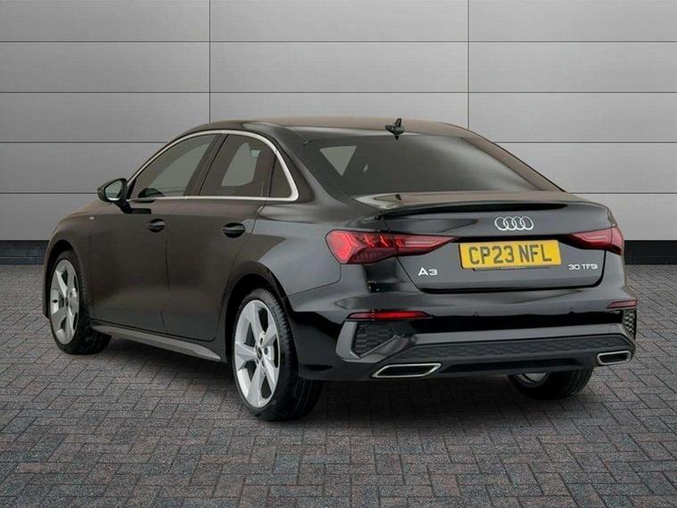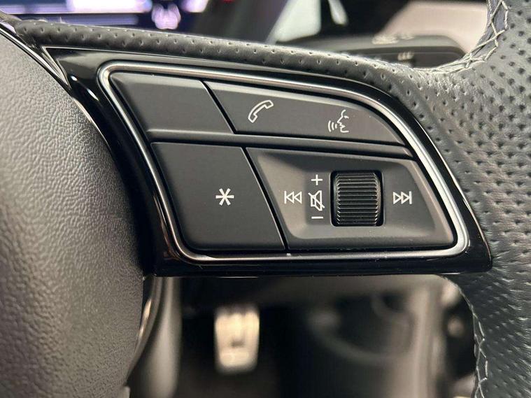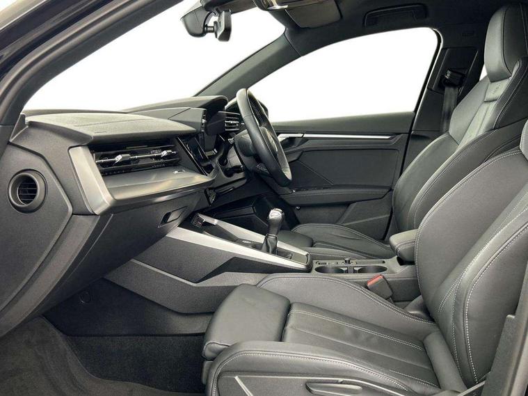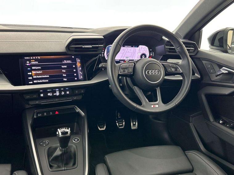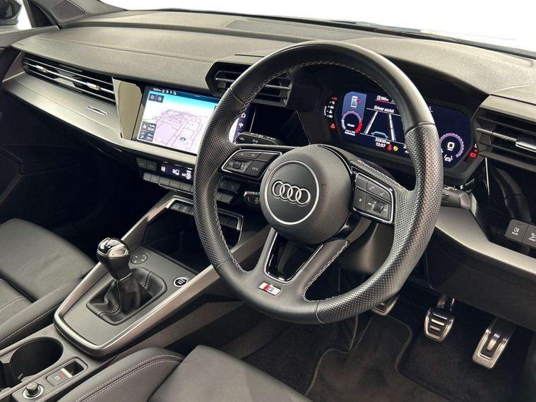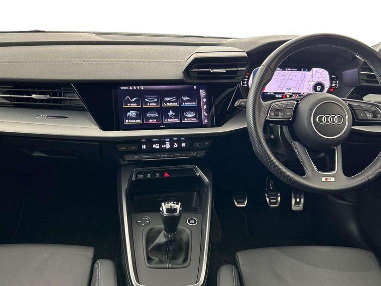 Audi drive select (Auto, Comfort, Dynamic and Individual), Audi smartphone interface, Audi Virtual Cockpit - 10.25" digital and colour instrument cluster, Automatic start/stop system with recuperation, Bluetooth interface, Camera based traffic sign recognition, Collision avoidance assistant, Cruise control + speed limiter, e-Call (emergency call), Electromechanical power speed sensitive steering, Lane departure warning system, MMI Navigation Plus with high resolution 10.1" colour touch screen display, Rear parking sensors, Service indicator, Trip computer, Voice control system with natural language interaction, Sports suspension, 2xUSB-C connection with data and charging functions, 6 passive loudspeakers, CD player, DAB Digital radio, 3rd brake light, Acoustic glass windscreen, Aluminium window trim, Auto dimming frameless rear view mirror, Body colour exterior mirrors, Electrically adjustable/heated/folding/auto dimming door mirrors with integrated LED indications + kerb view function for passenger side, Front electric windows, Illuminated door sills with aluminium inserts at the front with S logo, LED daytime running lights, LED headlights with LED rear lights and dynamic rear indicators, Light and rain sensors, Model and engine designation badges at rear, Privacy glass - dark tinted rear window, rear door and side windows, Rear boot, Rear electric windows, Rear side wing doors, S line bumpers, S roof spoiler, 12V socket and storage compartment in front centre console, 3 seat bench in 2nd row, 3 spoke leather multifunction steering wheel, 4 way electrically adjustable lumbar support for driver and front passenger, 60/40 split folding rear seat bench, Black cloth headlining, Dual zone electronic climate control, Front and rear centre armrest in artificial leather, Front and rear headrests, Front/rear floor mats, Height and reach adjustable steering wheel, Interior lighting - glove compartment light and right hand side, Luggage compartment floor covering, Manual boot compartment lid, Manually adjustable front seats, Seat side bolsters, Single front passenger seat, Stainless steel pedals and front footrest in black, Twin leather upholstery with front sports seats S embossed logo, Aluminium interior elements pack - A3, LED interior lighting pack - A3 Saloon, S line styling pack - A3 Saloon, 3x3 point rear seat belts, Driver and front passenger airbag with passenger airbag deactivation, Electronic Stabilisation Control (ESC) including ABS, ASR and EDL, First aid kit with warning triangle and 2 safety vests, Front side airbags with head airbags and interaction airbag, Pre-sense front with pedestrian and cyclist detection, Seatbelt monitoring, Tyre pressure loss indicator, Anti theft alarm, Anti-theft wheel bolts, Electronically operated child locks, Immobiliser, Remote control central locking, Aluminium air vent surrounds, Dark spectrum aluminium inlays, accent surfaces in the dashboard and centre console in platinum grey silk effect paint finish,