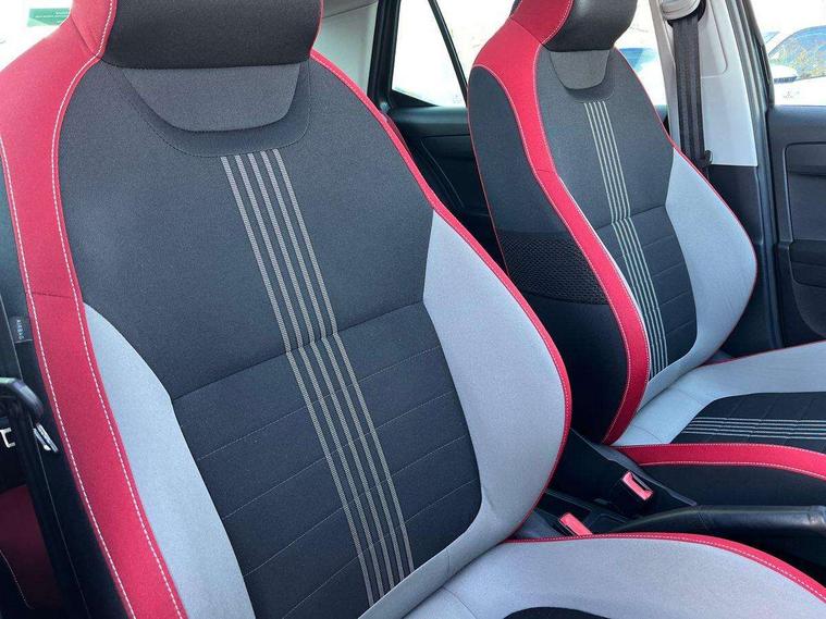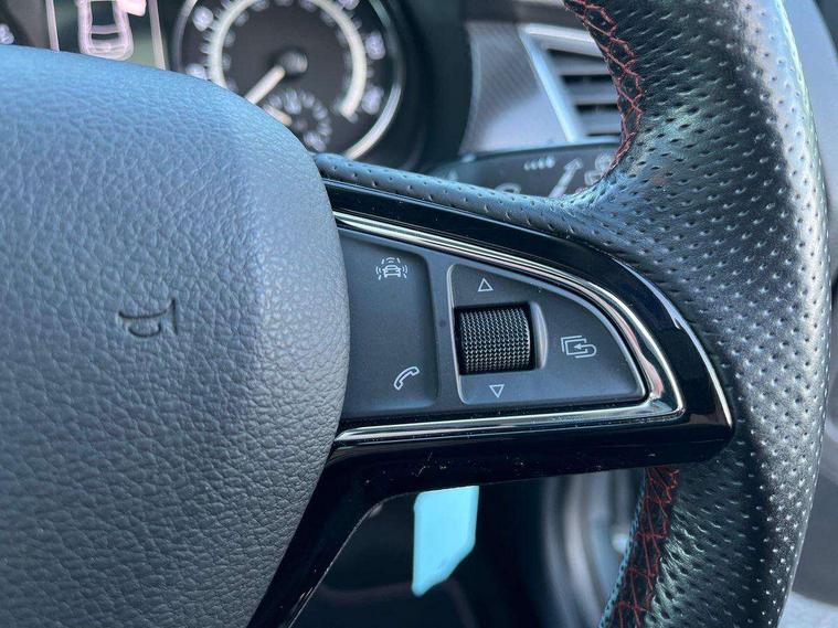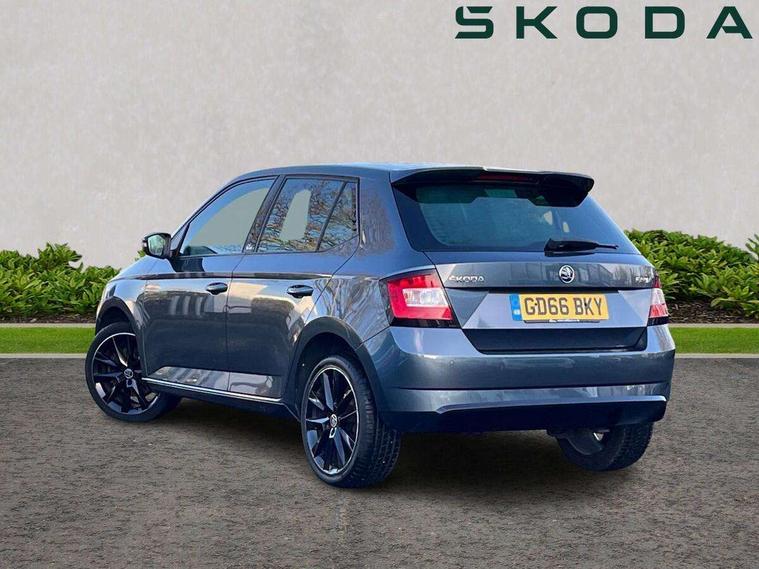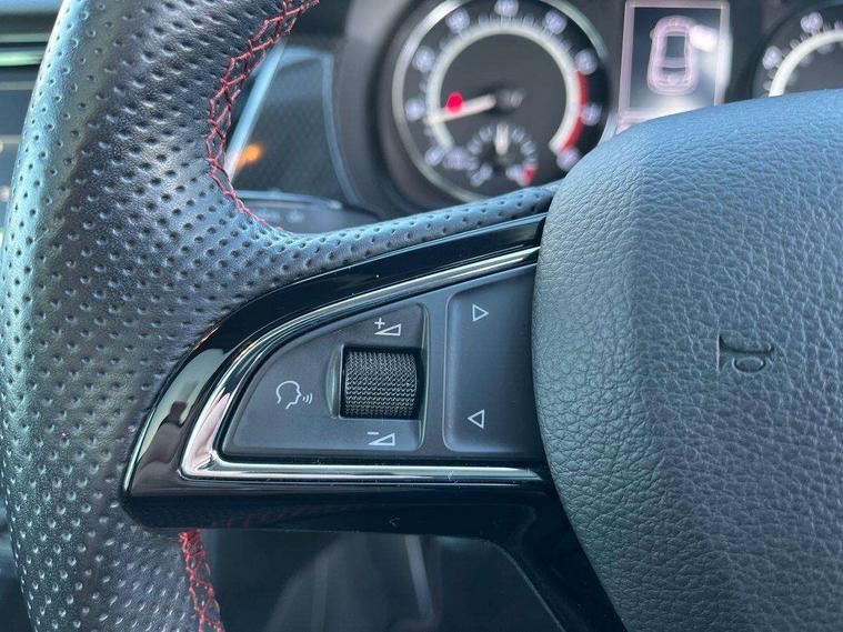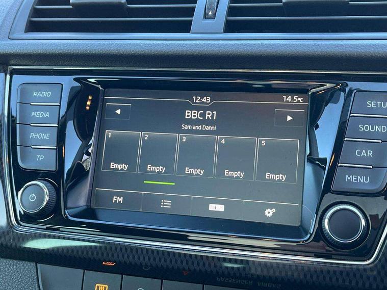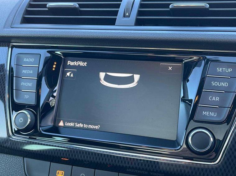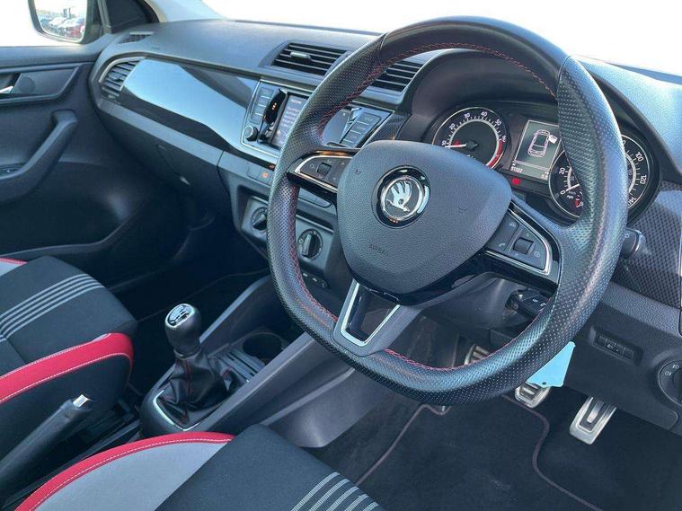 Bluetooth system, Exterior temperature gauge, Front assistant collision mitigation, Maxi dot trip computer, PAS, Service interval indicator, SmartLink, Auxiliary socket for external MP3 player, Bolero radio with telephone control, Mirror Link, USB and SD card, DAB Digital radio, Black door mirrors, Black radiator grille, Body colour bumpers, Body colour door handles, Body coloured rear spoiler, Electric front windows, Electrically adjustable and heated door mirrors, Heated rear window, Height adjustable headlamps, Illuminated door sill inserts, Intermittent rear wash/wipe, LED daytime running lights, Panoramic sunroof, Sunset glass from b-pillar back, Tinted rear windows, Tinted windscreen, 1.5L bottle holder in front door panels, 2 height adjustable rear headrests, 3 spoke leather multifunction sports steering wheel with red stitching, 60/40 split folding rear seat, Boot stowage box, Cargo area storage tray, Cloth upholstery, Driver + passenger vanity mirrors, Floor mats with red stitching, Folding grab handles, Front reading lights, Front sports seats, Height adjustable driver's seat, Height adjustable front headrests, Height adjustable passenger seat, Height/reach adjust steering wheel, Interior light with delay, Leather gearshift, Leather handbrake, Lower glovebox cover, Luggage load hooks, Parcel shelf, Pearl grey carpets, Pearl grey headlining, Pollen filter, Rear courtesy light, Rear storage trays, Storage compartment under front seats, Ticket holder, Two rear outer seat isofix location points, Arkamys surround sound pack - Fabia, Chrome Pack - Fabia, 3x3 point rear seatbelts, ABS, Curtain airbags, Driver and passenger airbags, Driver and passenger side airbags, EDS, ESC with ASR, Front seatbelt pretensioners, Hydraulic Brake Assist (HBA), Passenger airbag deactivate switch, Seatbelt warning, Tyre pressure monitor, Alarm with interior monitoring, Immobiliser, Locking wheel bolts, Remote central locking, Black cube decorative insert,