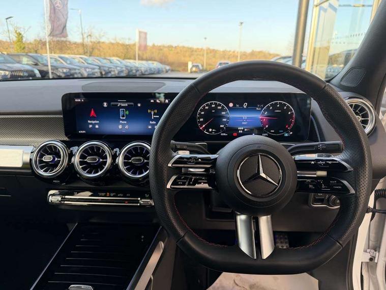 10.25 inch touchscreen central media display, 10.25" Digital instrument cluster display screen, Attention assist - Monitors steering behaviour and long journey fatigue, Blind spot assist, Bluetooth connection, Brake pad wear indicator warning light, Car wash mode, Direct steering, DYNAMIC SELECT with a choice of driving modes (ECO, Comfort, Sport and Individual), ECO start/stop function, Exit warning function, Fingerprint scanner, Fluid level warning indicator for fuel, oil, coolant and washer fluid, Hard disk navigation, Hey Mercedes Voice activation, Lamp failure indicator, Lane keep assist, MBUX navigation premium, Mercedes me connect including emergency call system, accident recovery, breakdown and maintenance management, Mercedes me remote services, Outside temperature gauge, Owners manual and service booklet in English, Pre-installation of private car share, Preinstallation for parking damage notification, Radio aerial integrated into front and rear windshields, Service indicator (ASSYST), Smartphone integration with Apple CarPlay and Android auto, Speed limit assist, Tailgate, Trip computer in multifunction display with current consumption indicator, Wireless charging, Comfort suspension with ride height lowering, Rear axle multi-link, DAB digital radio tuner, MBUX multimedia system, Mercedes Benz sound system (100 W) with 6 speakers, Pre installation for Mercedes Benz Link, Adaptive brake lights, Adaptive high beam assist, AMG front apron with front splitter in the colour of the vehicle with chrome trim element, AMG rear apron with visible tailpipe trim and chrome trim element, AMG specific/dual flow exhaust pipes in chrome (non-functional), Beltline trim and window line trim strip in high gloss aluminium, Black grained side sill trim with chrome inlay, Body coloured door handles, Electric adjustable and heated door mirrors with integrated LED side indicators, Front and rear electric windows, Headlamp assist automatic headlamp activation, Heat insulating dark tinted glass for rear side windows and rear window, Heated glass rear windscreen + timer control, High level LED third brake light, Interior mirror with black reading lamps and frameless, LED high performance headlamps with integrated LED daytime running lights, LED tail lamp, Polished aluminium roof rails, Radiator grille as a diamond grille with chrome pins and central Mercedes star, Rain sensor windscreen wipers with two sensitivity stages, Rear fog lamp, Rear side wing doors, Rear wiper, Single louvre in matt grey with chrome inserts and black highlights, Two visible tailpipe trim elements exhaust, Wheel arch liners in the colour of the vehicle, 3 seat bench in 2nd row, 3 twin spoke flattened multifunction steering wheel in nappa leather - horizontal twin spoke in high gloss black, vertical twin spoke in silver chrome, 4 way adjustable lumbar support, 40:20:40 split folding rear seats, Air vents with silver chrome surrounds, AMG floor mats, AMG sports pedals with brushed stainless steel surfaces and black rubber studs, Artico man-made leather/Microcut microfibre upholstery, Automatic child seat recognition sensor, Black roof lining, Fluorescent jacket, Front and rear headrests, Front centre armrest with stowage, Galvanised steering wheel gearshift paddles in silver chrome, Heated front seats, Height adjustable head restraints, Height/reach adjustable steering column, Interior lighting - 64 colour Ambient lighting, Luggage net on driver/front passenger seat backrest, Single front passenger seat, Sports seats, Stowage compartment in centre console with retractable cover and double cupholder and 12 V socket, Sun visors with illuminated vanity mirrors, THERMATIC automatic climate control, Third row of seats for two people on rear seat, Twin front cup holders, Two outer rear seat isofix and top tether child seat fixing points, Easy pack tailgate, Interior lighting with light and sight pack - GLB, KEYLESS-GO Comfort package - GLB, Mirror package - GLB, Parking Package with reversing camera - GLB, Seat comfort package - GLB, USB package plus - GLB, 3 rear 3 point seatbelts, Active bonnet pedestrain safety measure which detects an impact and raises bonnet by 65mm, Active brake assist includes forward collision warning system with autonomous braking, Adaptive brake assist with hold function and hill start assist, Airbags - kneebag for driver, Anti-lock braking system (ABS) with brake assist, Black seatbelts, Bonnet with power domes, Childproof locks manually operated for rear doors and electrically operated for rear power windows, Crash responsive emergency lighting, Curve dynamic assist, Driver and front passenger head and sidebags, Driver and front passenger windowbags, Dual stage driver and front passenger airbags, Electric parking brake, Electronic stability programme with acceleration skid control, Front and rear seatbelt reminder, Front brake callipers with Mercedes Benz lettering, Front passenger seat occupancy sensor, Perforated front brake discs, Tyre pressure monitoring system, Warning triangle and first aid kit, Guard 360 degree vehicle protection - Anti theft alarm system, tow away protection with visual, acoustic warning and alarm, Interior monitoring system, KEYLESS-GO starting function, Remote central locking and crash sensor with emergency opening function, Thatcham category 1 alarm system with immobiliser and interior protection, Carbon structure trim, 19" AMG 5 twin spoke light alloy wheels aerodynamically optimised, painted in high-gloss black and with a high-sheen finish RTG, Summer tyres, Tirefit tyre sealant kit,
