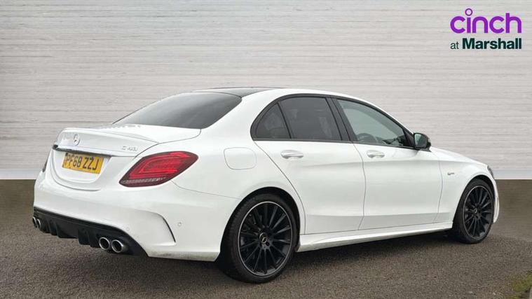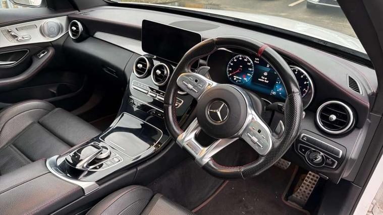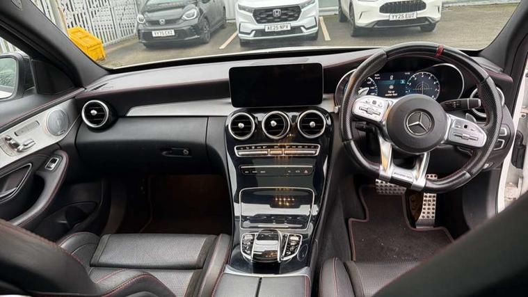 12.3" digital instrument cluster display, 360 degree parking camera, Active park assist with parktronic system, Attention assist, Bluetooth system, Collision prevention assist plus, Comand Online HDD Nav with media interface, radio/CD/DVD/MP3, 10.25 screen, linguatronic voice control, DYNAMIC SELECT with a choice of driving modes (ECO, Comfort, Sport, Sport+ and Individual), Multi function trip computer, Outside temperature gauge, Remote boot release, Service indicator (ASSYST PLUS), Smartphone integration with Apple CarPlay and Android auto, Wireless charging, AMG Ride Control sports suspension, Petrol Particulate Filter, 2 USB ports in centre console, Burmester surround sound system, DAB Digital radio, SD card slot, Steering wheel mounted audio controls, Adaptive brake lights, Aerial in rear window, AMG body styling, AMG door sills, AMG radiator grille with 2 louvres in matt iridium silver, BITURBO 4MATIC lettering on front wings, Body coloured bumpers, Electric front sliding and fixed rear panoramic glass sunroof, Electric windows one touch open/close, Electrically adjustable and heated door mirrors, Green tinted glass, Heated windscreen washers, LED daytime running lights, LED Indicators, LED tail lights, LED third brake light, Multi beam LED headlights, Rain sensor windscreen wipers, Side windows surround in matt black, 2 cupholders in front centre console, 3 spoke flat bottomed nappa leather sport steering wheel, 40:20:40 split folding rear seats, AMG floor mats with red stitching, Auto Mercedes-Benz child seat recognition sensor, Dual zone automatic climate control, Electric front seat height adjustment, Front and rear head restraints, Front centre armrest with storage compartment, Gearshift paddles, Heated front seats, Illuminated glovebox, Interior lighting - 64 colour Ambient lighting, Multifunction steering wheel, Rear top tether child seat ISOFIX attachment, Sports pedals with stainless steel surfaces and rubber studs, Sunvisors with illuminated vanity mirrors, Lighting pack - C class, Mirror pack - C Class, Seat comfort pack - C Class, Stowage space pack - C Class, 3 rear 3 point seatbelts, ABS with Brake Assist, Active bonnet, Adaptive brake system, Brake calipers with AMG lettering + perforated brake discs, Child proof door locks, Crash sensor, Drivers knee airbag, Drivers pelvis airbag, Dual stage driver/passenger airbags, Electronic parking brake, ESP with ASR, Front passenger seat occupancy sensor, Front side airbags, Hill start assist, Rear seatbelt warning indicator, Red seat belts, Tyre pressure monitoring system, Warning triangle and first aid kit, Window airbags, Alarm system/interior protection/immobiliser, Chrome surround in electric key, Keyless entry and keyless start, Remote central locking, Artico upholstered dashboard with red contrast stitching, Tyre inflation kit,