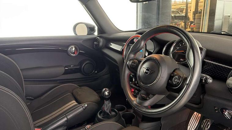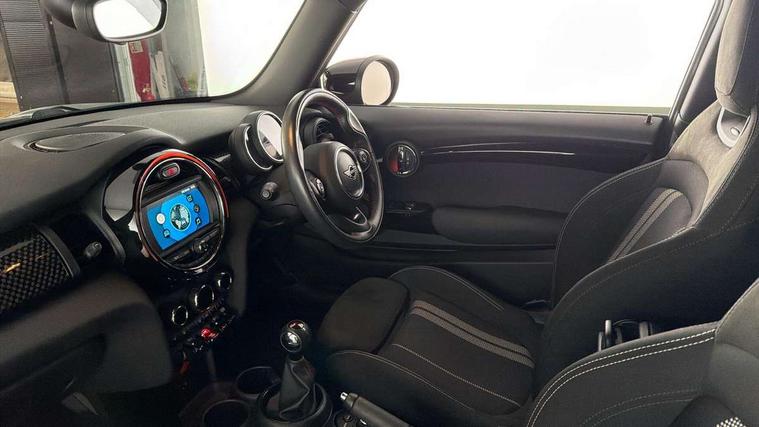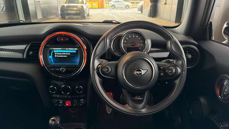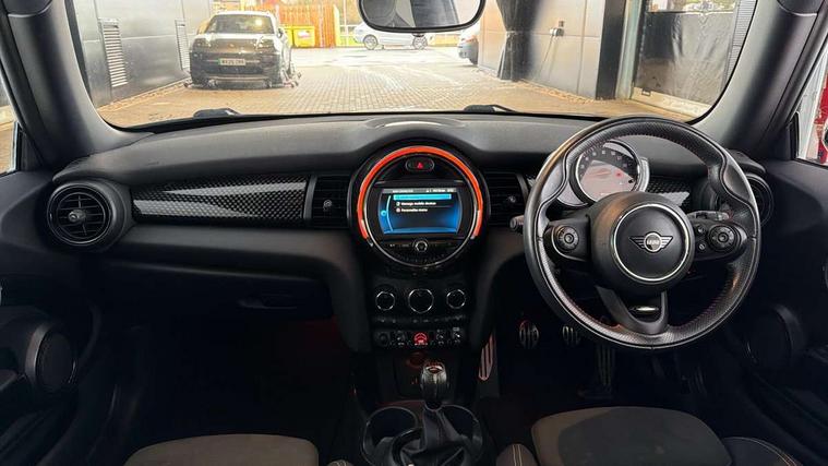 Automatic start/stop function with brake energy recuperation, Compatible mobile phone bluetooth with audio streaming, Electro-mechanical speed dependant steering assistance, Instrument cluster, Mini E-call, MINI TeleServices, On board computer, Service interval indicator, Double Vanos system, Fully variable valve control, High precision injection, Performance Control, 6.5" touchscreen with LED ring, FM tuner and DAB digital radio, Automatic headlight activation switch, Bonnet scoop, Chrome border honeycomb structure radiator grille with S badge, Chrome plated fuel cap, Dynamic brake lights, Electric front+rear windows, Heated rear window, Heated windscreen washer jets, John Cooper Works - aerodynamic kit (front and rear apron, spoiler), front and rear sport bumpers and part-painted side sills with door sill finishers, John Cooper Works rear spoiler, LED headlight with closed ring and daytime driving lights, Metal door sill strips with Cooper S imprint, Model logo Cooper S on right of tailgate, Rain sensor window wipers, Rear fog lights, Rear LED lights with union jack design, Rear window wiper, Side scuttle panel with integrated indicator, Sun/heat protection glass, Two central exhaust tailpipes with chrome finisher, White indicator lenses, 12V Accessory socket in centre console, 4 lashing eyes in luggage compartment, 60/40 split folding rear seat, Anthracite headlining, Chrome interior highlights, Cupholders, Front and rear head restraints, Front and rear isofix with front passenger airbag deactivation, Glove compartment, Height and length steering column adjustment, Interior lighting with 12 basic colours selectable via toggle switch in roof, John Cooper Works leather steering wheel with contrasting stitching in Chilli Red with John Cooper Works logo, John Cooper Works Logo in seat, Leather gearshift lever and handbrake gaiters, LED reading lights, vanity mirror lights, front foot well light and spotlight on front seats, Manual air conditioning, Mechanical seat adjustment, driver seat height adjust, forward/back and front seats backrest, Mini logo projection on floor from drivers exterior mirror, Multifunction steering wheel, Storage compartments in doors, Storage pocket on back of front seats, Sunvisors with vanity mirrors, 3 point seatbelts on all four seats, 6 Airbags - front, side, head and seat belt tensioners, Anti-lock braking system (ABS), DSC - Dynamic Stability Control, Front and rear disc brakes, Hill start assist, Two tone horn, Tyre pressure monitoring system, Alarm system with tilt sensor, monitoring doors, bonnet interior and tailgate, Electronic vehicle immobiliser, Start/stop toggle with keyless go, Tool kit,