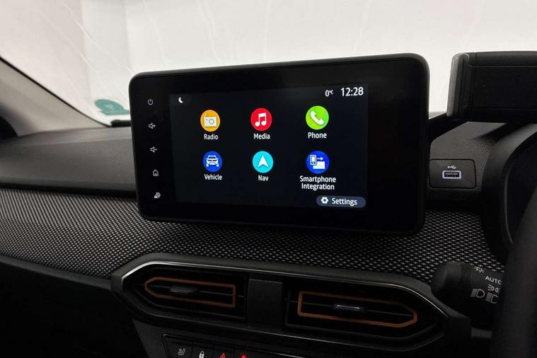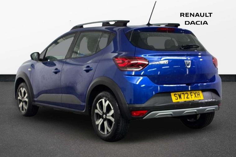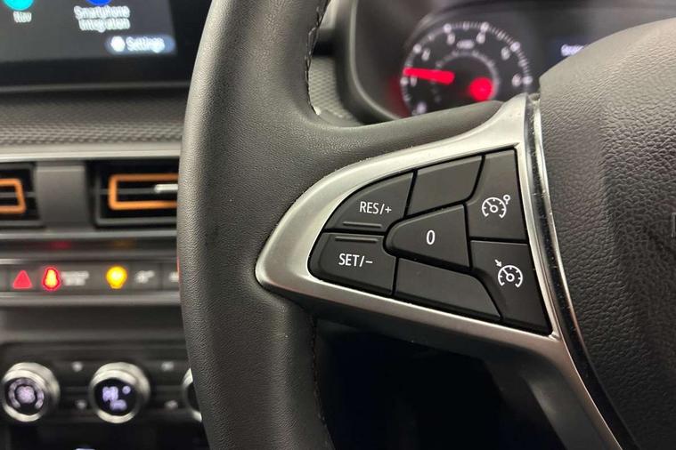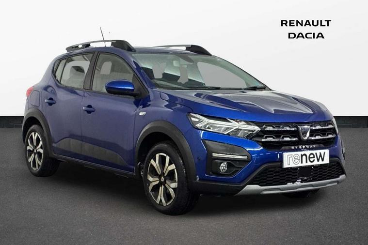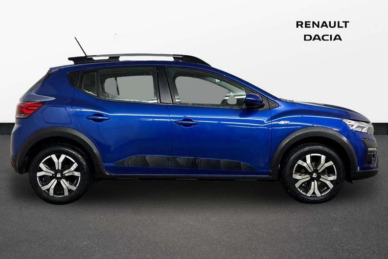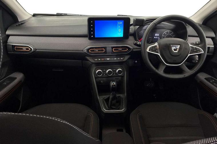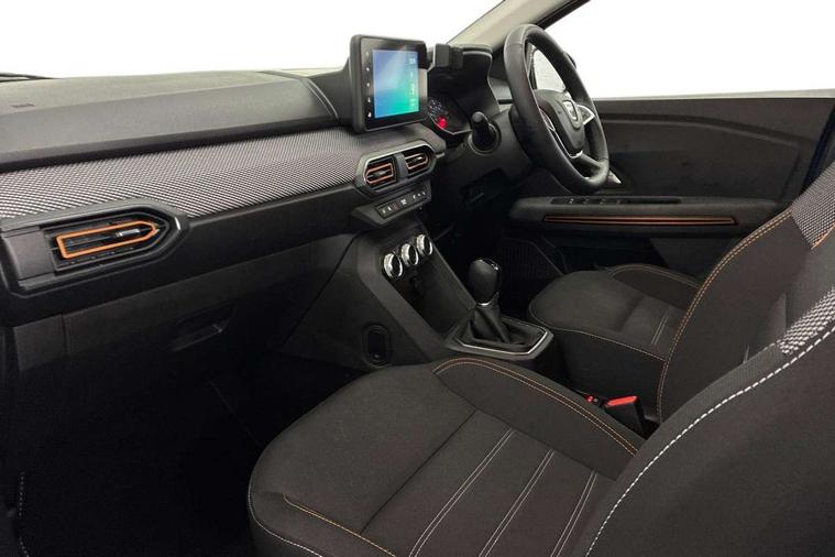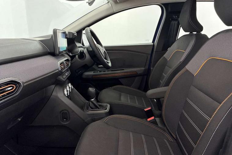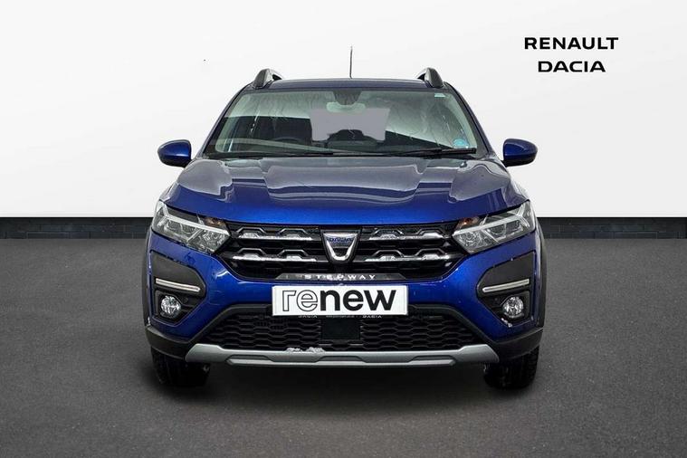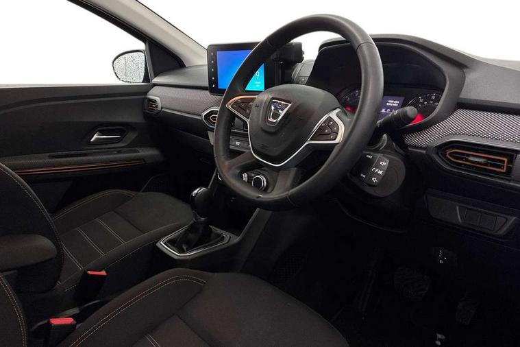 3.5" TFT instrument panel with on-board computer, Blind spot warning, Cruise control with speed limiter, eCall emergency call system, Eco mode, Electric power assisted steering, Front parking sensors, Rear parking sensors, Rev counter, Reversing camera, Stop/start system, 8" MediaNav - DAB Radio, Wifi smartphone replication, Bluetooth, 6 speakres, Apple CarPlay and Android Auto, USB connection for data transfer and charging, USB socket, 3 speed windscreen wipers, Auto lighting, Automatic wipers, Body colour door handles, Body colour door mirrors, Body coloured bumpers, Chrome longitudinal roof bars, Chrome radiator grille, Electrically adjustable and heated door mirrors, Front fog lights, Heated rear window, High level third brake light, LED automatic daytime running lights, LED Y-shape Dacia signature lighting, Modular roof bars, One touch electric front windows, Rear electric windows, Rear side wing doors, Rear wash/wipe, Stepway inscription on radiator grille and roof bars, Tinted windows, 1/3 to 2/3 split folding rear seats, 12 volt front socket, 12 volt rear socket, 3 height adjustable rear headrests, 3 seat rear bench, Automatic air conditioning, Driver + passenger vanity mirrors, Fabric upholstery, Fixed smartphone holder on dashboard, Height adjustable driver seat, Height adjustable front headrests, Height/depth adjustable steering wheel, High central armrest with console storage, Isofix points for child seats in both outer rear seats, Satin chrome interior door handles, Satin Chrome/Copper orange air vents, Single front passenger seat, Soft feel steering wheel, Steering wheel controls, 3x3 point rear seatbelts, ABS and Emergency brake assist, Automatic emergency braking system, Child locks on rear doors, Door open warning, Driver airbag, Electronic parking brake, ESC (Electronic Stability Control), ESP + Hill Start Assist, Front curtain airbags, Front seatbelt pretensioners, Front side airbags, Height adjustable front seatbelts, Passenger airbag, Seatbelt reminder for driver and front passenger, Tyre pressure monitor, Automatic central locking, Immobiliser, Keyless entry, Remote central locking, Decopart on instrument panel and door with textile, 16" Diamond-effect alloy wheels,