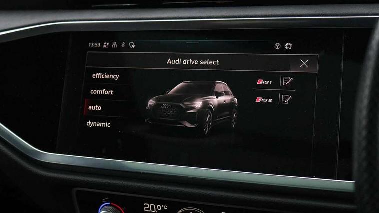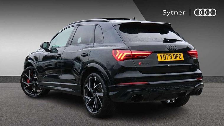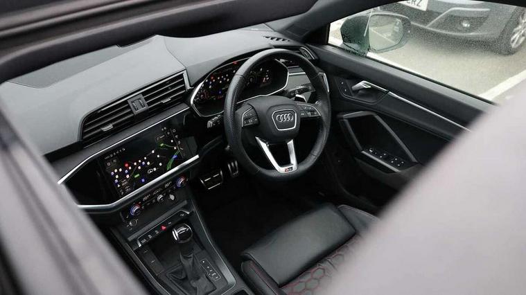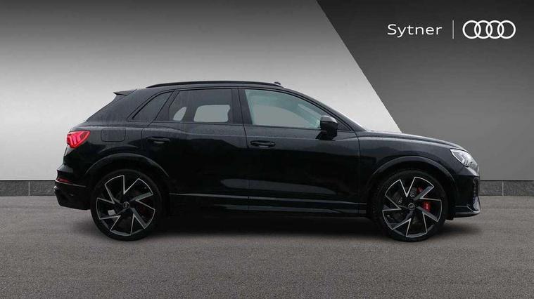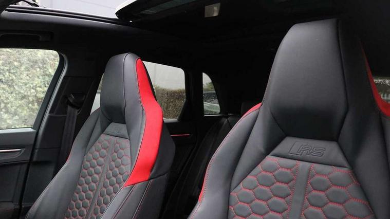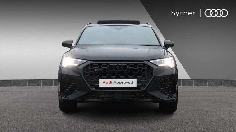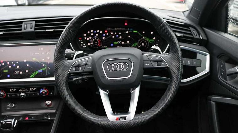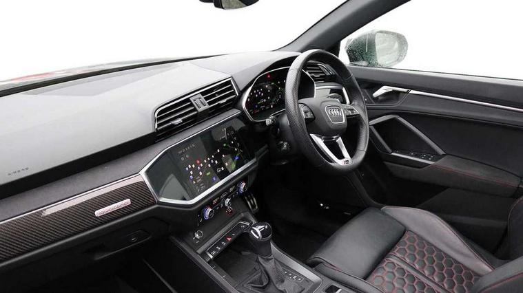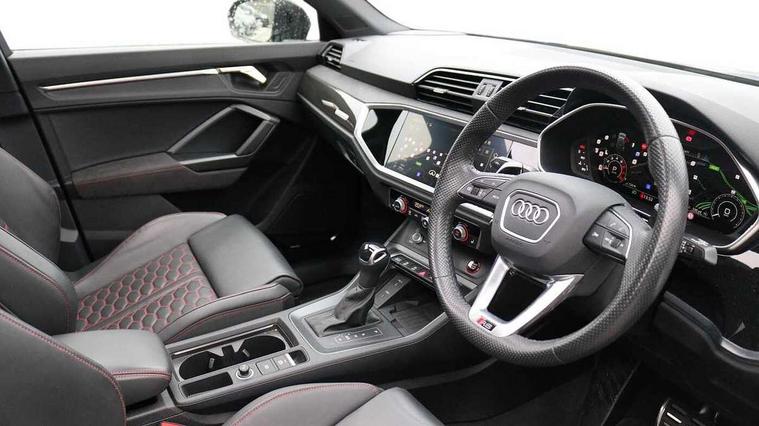 360 degree parking camera, Audi drive select with new RS modes, Audi lane departure warning, Audi parking system plus with front and rear sensors, Audi phone box with wireless charging, Audi virtual cockpit plus - 12.3 inch display, Bluetooth interface, Camera based traffic sign recognition, Emergency e-call, MMI Navigation Plus with high resolution 10.1 inch touchscreen colour display, Power operated tailgate, Progressive steering, Rear cross traffic assist, Smartphone interface includes wireless Apple carplay/Android Auto, Start stop system with recuperation, Voice control system with natural language interaction, Quattro all wheel drive, RS sports suspension plus, 2 USB-C ports with charge and data functions, DAB digital radio module, SONOS premium sound system, Acoustic windscreen, Audi Beam uses LEDs to project the Audi Sport logo, Auto dimming door mirrors, Auto dimming frameless rear view mirror, Black roof rails, Body colour rear spoiler, Carbon door mirror housings, Dark tinted Matrix LED headlights with dynamic front and rear indicators, Electrically folding, adjustable and heated door mirrors with integrated LED side indicators and kerb view function for passenger side, Flared wheel arches, Flat slits on single frame grille, Headlight washers, High gloss black finish B and C pillars, Honeycomb radiator grille in gloss black, Illuminated door sill trims with RS logo, LED daytime running lights, LED rear lights, LED third brake light, Panoramic glass sunroof, Privacy glass dark tinted rear and rear-side windows (from B-pillar backwards), Rain and light sensors, Rear side wing doors, Rear wiper, RS specific bumpers with large front air inlets in black, RS Sport exhaust system, dual branch with exhaust flap control and gloss black oval tailpipe trims, Tinted rear windows, Variable front intermittent wipers, 3 seat bench in 2nd row, 3 zone electronic climate control, 4 way electric lumbar support for driver and front passenger, 40:20:40 folding with manual adjustment for 60:40 forwards/backwards position and backrest angle, Black cloth headlining, Black dinamica elements - dashboard and the armrests in the front and rear doors, Electrically adjustable front seats, Fine nappa leather upholstery with front RS sports seats with honeycomb stitching and RS embossing, Front and rear floor mats, Front and rear head restraints, Front centre armrest, Heated front seats, ISOFIX child seat mounting for front passenger with airbag deactivation and outer rear seat including top tether attachment point for outer rear seats, Leather steering wheel (Round) in 3-spoke design with multifunction plus and shift paddles, Rear centre armrest with cupholder, Single front passenger seat, Stainless steel luggage compartment sill finisher, Stainless steel pedals, Black styling pack - RS Q3, Driver assistance pack with side assist - RS Q3, Multi-coloured extended ambient lighting pack - RS Q3, Non smoking pack - RS Q3, 3x3 point rear seatbelts, 6 airbags - Driver, front passenger, curtain and side windows, Audi pre-sense front with pedestrain and cyclist recognition, Electrically operated child locks on rear doors, Electromechanical parking brake, Electronic stabilisation control including ABS, ASR and EDL, Front seatbelt reminder, Hill descent control, Hill hold assist, Pre sense basic, RS brake system, Seatbelt monitoring, Tyre pressure warning, Warning triangle and first aid kit, Advanced key, Anti theft alarm, Anti theft wheel bolts, Immobiliser, Aluminium look interior elements, Carbon twill inlays, Detail dashboard around MMI touch colour display in glass look, black with surround in aluminium look, Tool kit, Tyre repair kit,