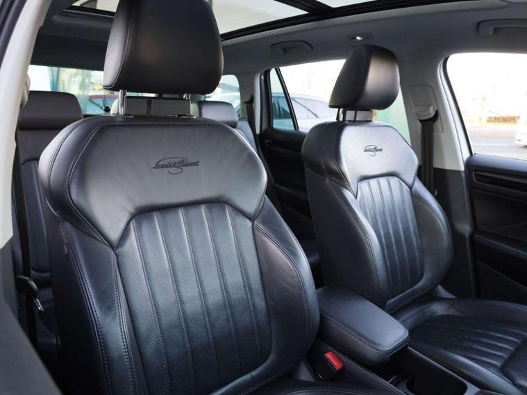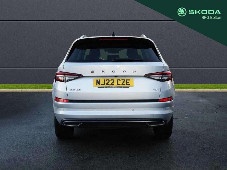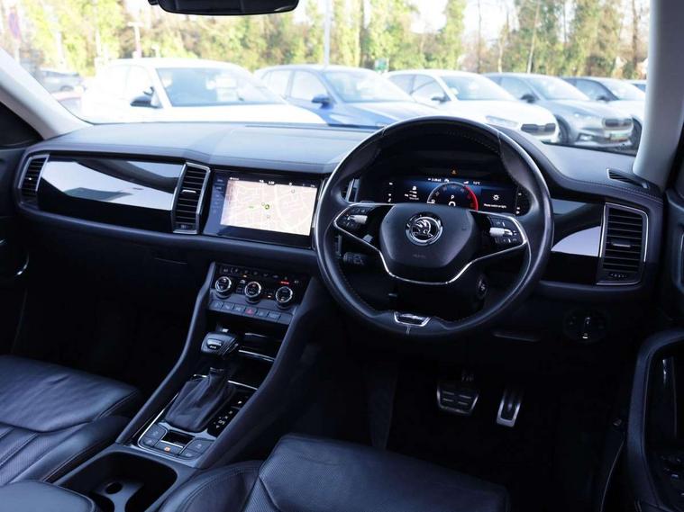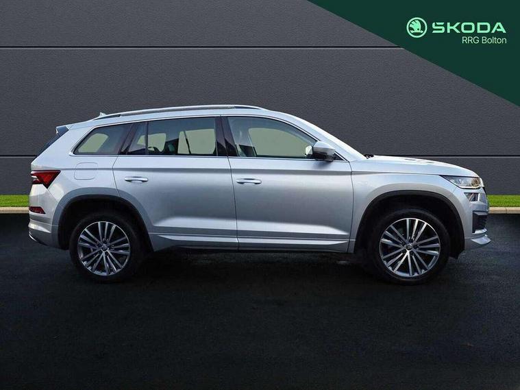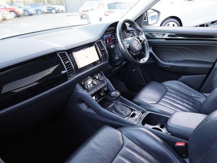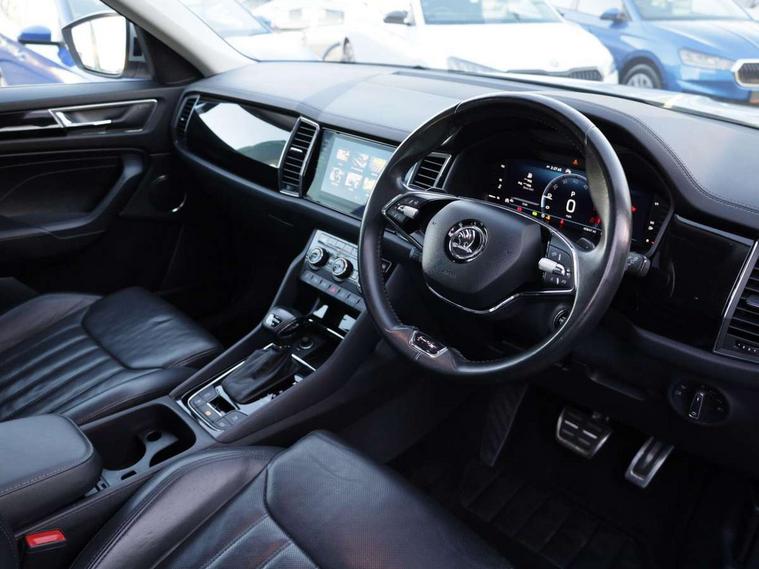 Area view, Blind spot detection system, Bluetooth system, Columbus satellite navigation with 9.2" touchscreen, integrated Wi-Fi, web radio, Digital voice enhancement, E-call, ECO Stop/start function, Exterior temperature indicator, Progressive steering, Smartlink wireless for apple carplay and wired for android auto, Speed limiter, Tailgate unlocking from outside, USB C Port x 2 in front centre console, Virtual Cockpit - 10.25" digital display, Wireless charging, Canton sound system, DAB Digital radio, Aero front windscreen wipers with intermittent function, Aero rear window wiper, Auto dimming rear view mirror, Black wheel arch surrounds, Body colour bumpers, Body colour door mirrors and handles, Body colour door panels, Chrome front grille, Chrome roof rails with chrome window surround, Electric adjustable/heated/folding door mirrors, driver side auto dimming with boarding sports and memory function, Electric front and rear windows, Extended rear spoiler with finlets in gloss black, Front fog lights, Full LED matrix headlights with AFS (adaptive front light system), cornering function and AWL (all weather lighting system), Headlight washers, Heated rear window, Invisible tailpipe, L&K front and rear bumpers including lower rear chrome strip, LED daytime running lights, LED rear fog light, LED third brake light in rear spoiler, Light assistant (coming/leaving home/tunnel light), Off-road style lower front bumper element, Panoramic sunroof, Privacy glass, Rain and light sensors, Rear LED lights (high functionality) with welcome effect and dynamic indicators, Rear side wing doors, Safety reflectors on front and rear doors, Window control switches with black trim, Without engine designation, 12V socket in boot, 2 rails with 2 hooks, 2 seat bench in 3rd row, 3 seat bench in 2nd row, 4 foldable roof handles with rear coat hooks, 60:40 foldable rear seat with sliding adjustment and backrest angle adjustment, Aluminium pedals, Bottle holders in door panel in the 1.5 litre front and 1 litre rear, Cargo storage compartments, Chrome headlight control button, Chrome interior door handles, Coat hooks on B pillar, Covered storage compartment on driver side, Front centre armrest with storage compartment, cup holder and 12V socket, Front courtesy lights, Gear shift lever with chrome frame and black gloss insert, Grey stitching in front and rear armrests and door armrests + door inserts, Height adjustable front headrests, Illuminated and cooled glovebox, Illuminated luggage compartment, Isofix child seat fittings in outer rear seats with top tether, Manually adjustable steering column, Net programme in boot (1x horizontal Net, 2x vertical Nets), Overhead glasses storage compartment, Pollen filter, Rear centre armrest with cupholders, Single front passenger seat, Sliding trunk cover, Small Bags on the inner sides of the front backrests, Sunvisors with illuminated vanity mirrors, Three rear height adjustable headrests, Ticket holder on A Pillar, Umbrella in door panel, Variable boot floor, LED Interior light pack - Kodiaq, Auto door release and activation of warning lights in the event of an accident, Child locks on rear doors, Driver and front passenger airbag with knee airbag and front passenger airbag deactivation, Electronic parking brake with hill start assist, Emergency rear braking signal, ESC (incl. ABS+MSR+ASR+EDS+HBA+DSR+RBS+MKB), Front assist with autonomous emergency braking, Front side airbags with curtain airbags, Fuel cut off safety device, Height adjustable front 3 point seatbelts + pretensioners, Hill hold control, Rear disc brakes, Safety vest holder in door, Seat belt reminder for all seats, Three point rear seat belts, Two tone horn, Tyre pressure monitor, Alarm with interior monitoring and tilt sensor with safe function, Anti-theft wheel bolts, Immobiliser, Keyless entry and start system (KESSY), Remote central locking with 2 keys, Grey stitching in dashboard, Piano black decorative inserts, Plaquette L&K front fenders, Temporary spare wheel (space saver),