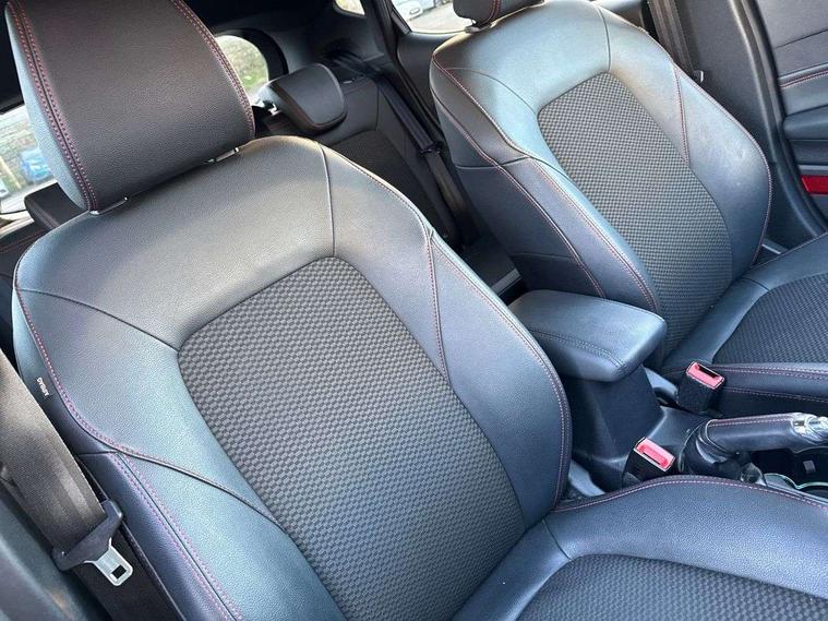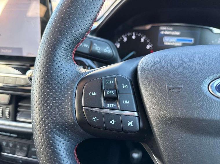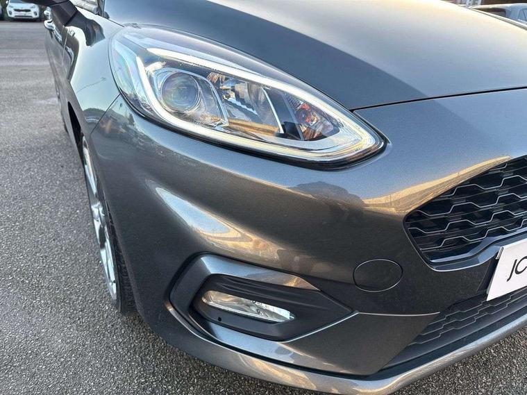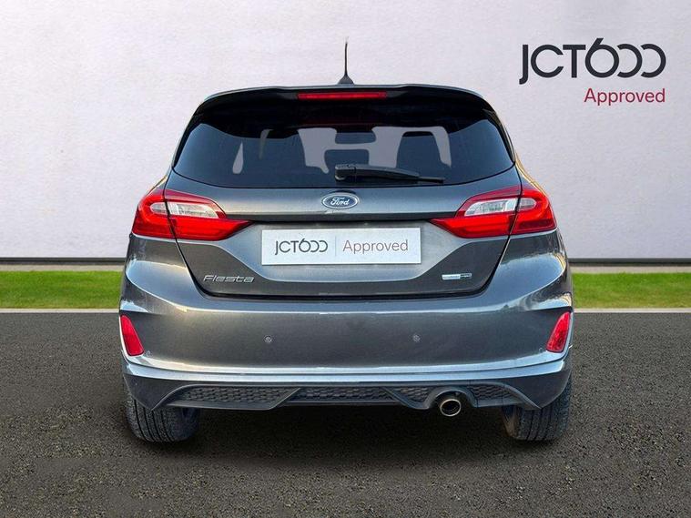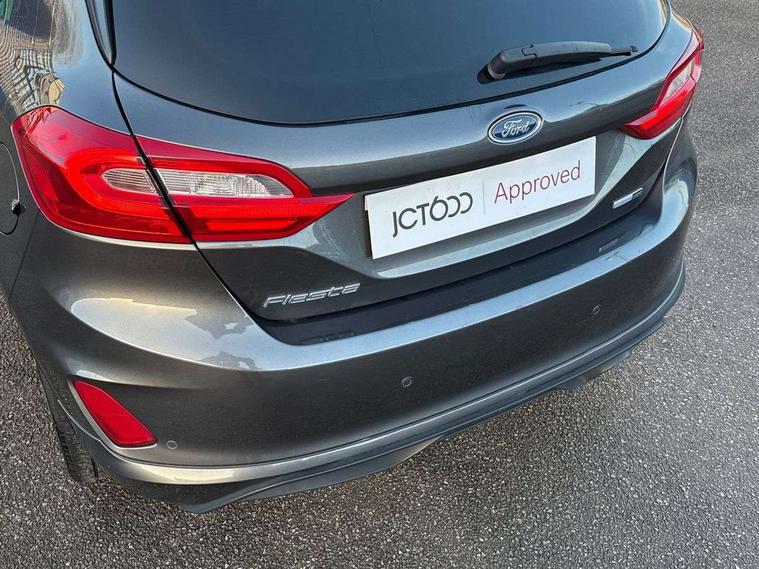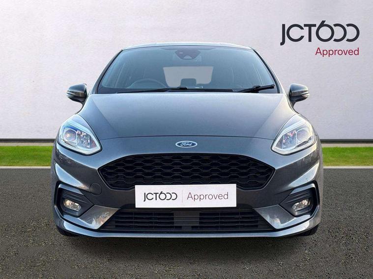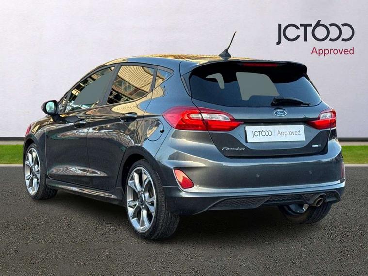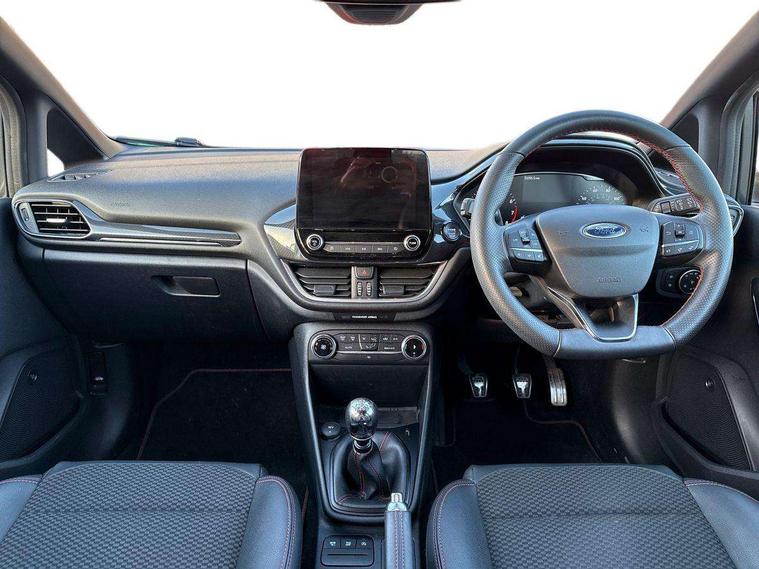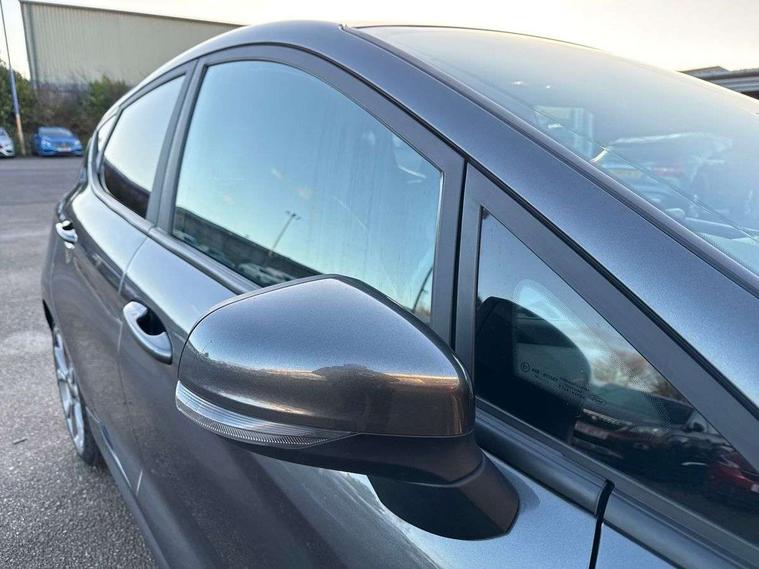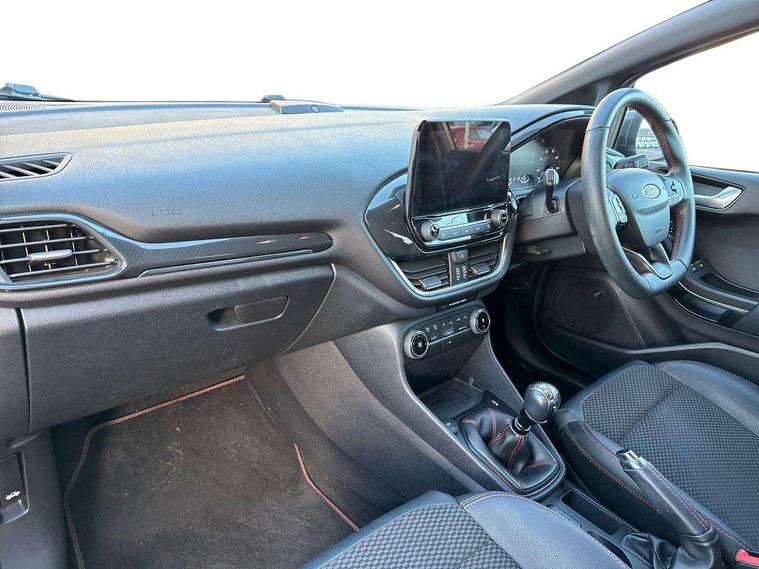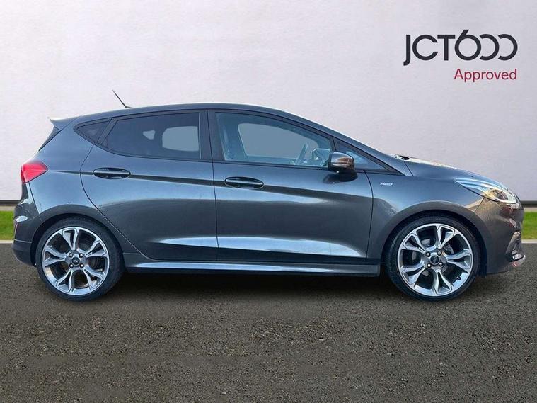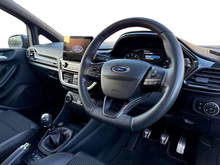 4.2" TFT instrument cluster screen, Bluetooth system, Electric power steering, Ford easy fuel, Rear parking distance sensors, Selectable drive modes (Normal, Sport, Track), Traffic sign recognition, Trip computer, Sports suspension, 2 USB ports, Auxiliary input socket, B&O Premium audio system with 8" touchscreen, 10 speakers, 360 degree sound system, Ford SYNC 3 navigation system and Ford pass connect, DAB Digital radio, Steering wheel mounted controls, Auto high beam, Body colour bumpers, Body colour door handles, Body colour large rear spoiler, Body coloured electrically operated and heated door mirrors with side indicators, Cornering front fog lights, Electric front windows/one touch facility, Electric rear windows, LED Night signature to rear lights, Power foldable door mirrors with puddle lights, Quickclear heated windscreen, Rain sensing wipers and auto dimming rear view mirror, Rear privacy glass, Rear wiper, Unique ST-Line upper grille & full bodystyling kit with ST-Line wing badges, 3 spoke flat bottomed leather steering wheel, 60/40 split folding rear seat, Adjustable head restraints, Black headlining, Boot carpet, Centre console with opening armrest, 2x cupholders, 12v and USB, Chrome inner door handles, Drivers and Passenger lumbar support, EATC - Electronic Auto Temperature control, Footwell illumination, Front floor mats in velour, Front map reading lights, Front seat and rear pockets, Height adjustable passenger seat, Illuminated glovebox, Leather gaiter, LED ambient lighting, Load area light, Manual 4-way driver seat adjust, Overhead console with sunglasses holder, Pollen filter, Rake/reach adjustable steering wheel, Sensico wrapped steering wheel, Sports front seats, NCAP Pack - Fiesta, ST-Line X Trim Pack - Fiesta, 3 point seatbelts on all rear seats, ABS+EBA, Curtain airbags, Driver and passenger airbags, Drivers knee airbag, Electronic stability control with hill start assist, Front passenger airbag deactivation, Front side airbags, Seatbelt warning, Two tone horn, Tyre pressure monitoring system, Ford keyfree system with Keyless entry and keyless start, MyKey system, Remote central locking & engine immobiliser, Thatcham Cat.1 alarm, 18" 5 spoke alloy wheels with rock metallic machined finish,