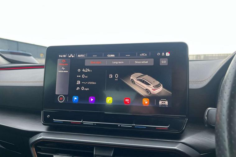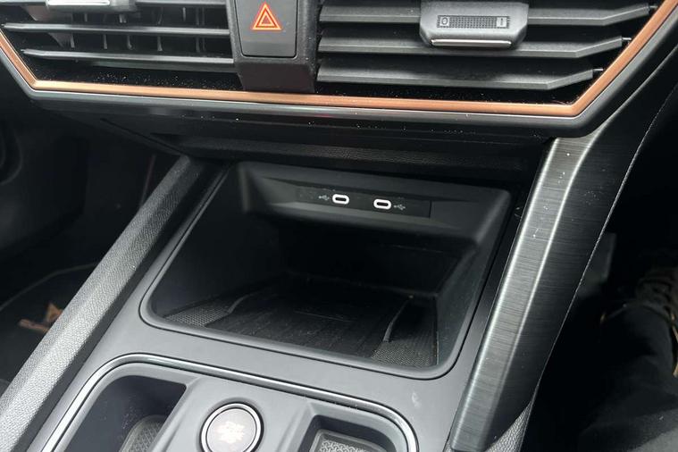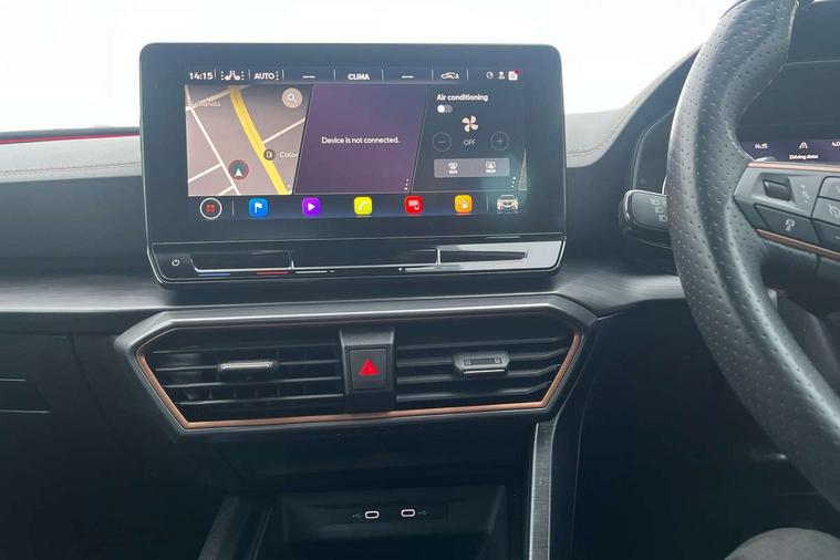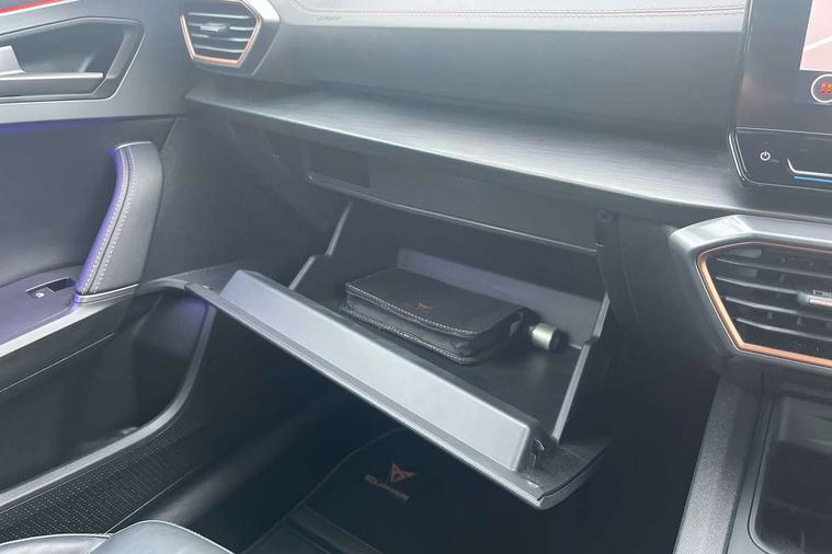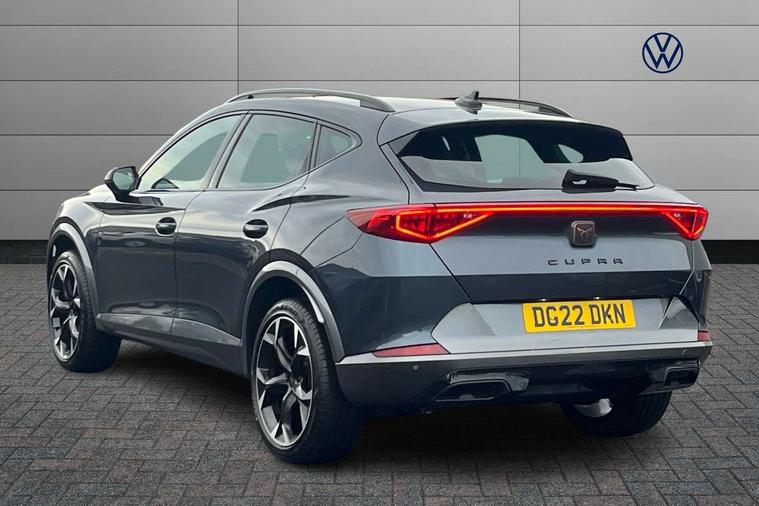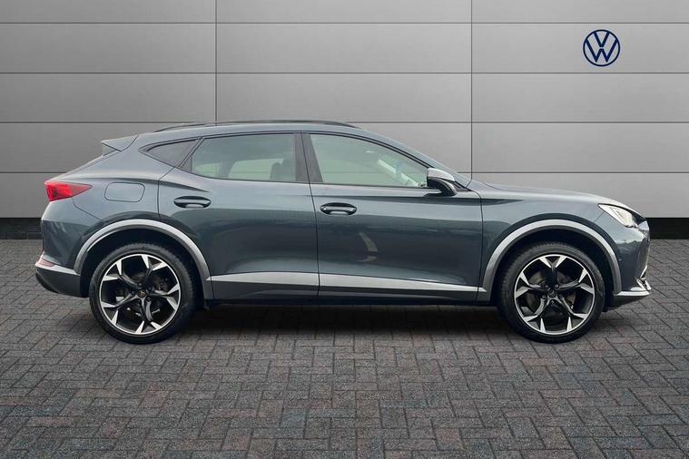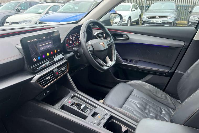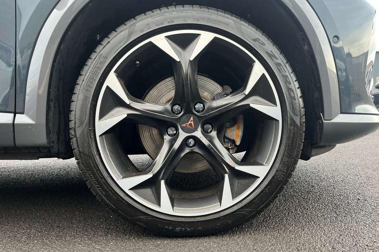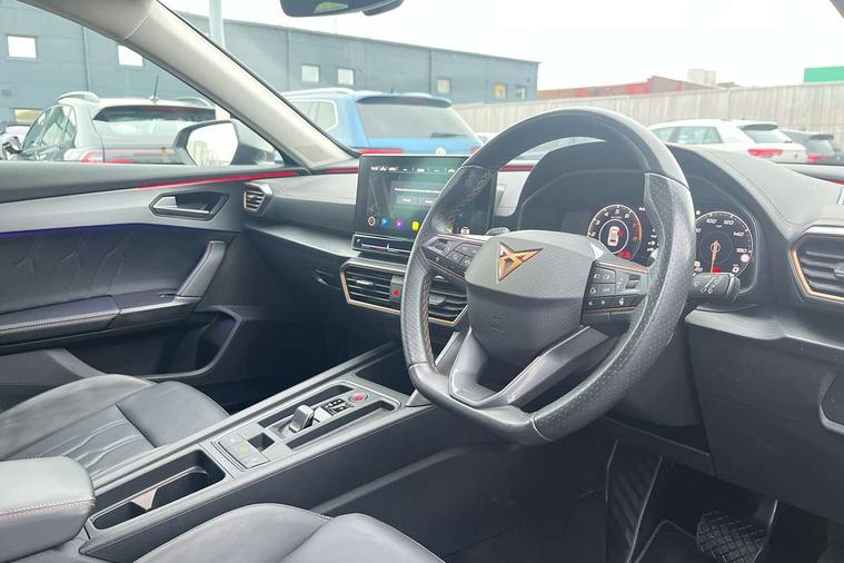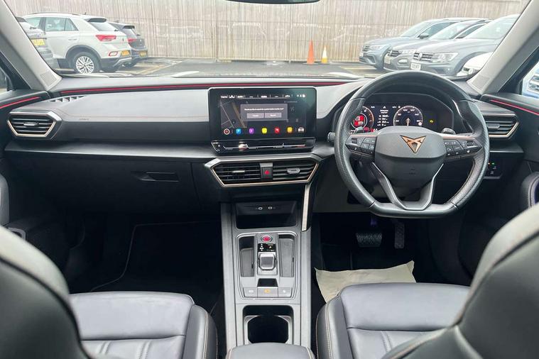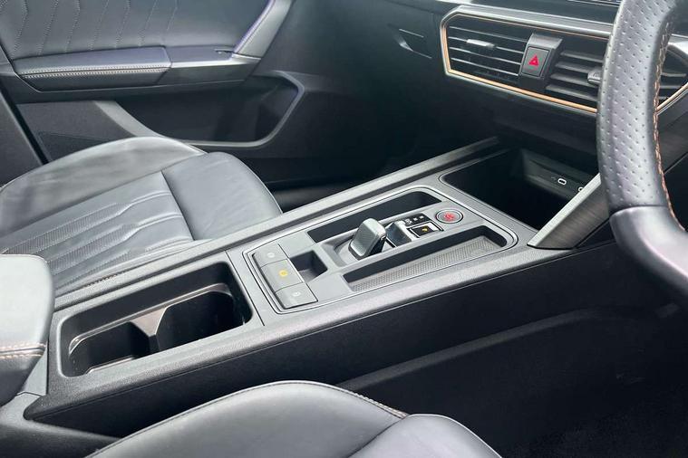 Digital cockpit and configurable dashboard, Driver alert system, Driving profile selection, E-call, Forward collision warning with automatic braking, Lane assist, Park assist (inc front/rear parking sensors), PAS, Predictive adaptive cruise control with speed limiter, Rear view camera, RPM, trip computer, outside temp gauge, instrument light brightness, low fuel warning light, lights on reminder, gearshift indicator, Service interval indicator, Start/stop system with regenerative braking, Wireless apple carplay, Wireless phone charger, Electronic locking differential and dynamic traction support, Standard suspension, 2 front and 2 rear USB type C sockets, Auxiliary input socket, DAB radio, Auto dimming rear view mirror, Body colour door handles, Body coloured bumpers, Dark grey wing mirror, Daytime running light with automatic headlight control and coming home feature, Dynamic headlight range control, Electric front/rear windows, Electrically adjustable heated and folding door mirrors with memory function, Front fog lamps with cornering function, Gloss black roof rails and window surrounds, LED Headlights, LED Taillights with dynamic indicator, Rain sensing wipers, Rear diffuser with black simulated exhaust pipes, Rear side wing doors, Rear wash/wipe, Third brake light, Tinted rear windows, Welcome lights, 12v power supply in centre console, 12V socket, 12v socket in loadspace, 2 front and 2 rear reading lights, 230V socket, 3 seat bench in 2nd row, 60/40 split rear bench seat with armrest and mechanical seat release, Dust/pollen filter, Front and rear head restraints, Front centre armrest, Height/reach adjust steering wheel, Illuminated interior front door sills, Illuminated sunvisor with mirror, Isofix, Leather multi function heated steering wheel with gear shift paddles, Luggage tie-down hooks, Single front passenger seat, Three zone climate control with control panel in rear, Variable luggage/load compartment floor, Wraparound lighting, Genuine Nappa leather Pack - Cupra, Navigation system pack with 10" navigation system - Formentor, 3 point seatbelts on all rear seats, ABS, Brake control system - ESC and brake booster, Child proof door locks, Driver and front passenger airbags with front passenger airbag de-activation, Electronic parking brake, Front and rear disc brakes, Front side curtain airbags, Hill hold control, Seat belt reminder for front and rear seats, Tyre pressure monitoring system, Anti theft alarm system, Keyless entry and start system (KESSY), Locking wheel bolts, Copper and aluminium interior detailing, 19" 'Exclusive' machined sport matte black and silver alloy wheels,