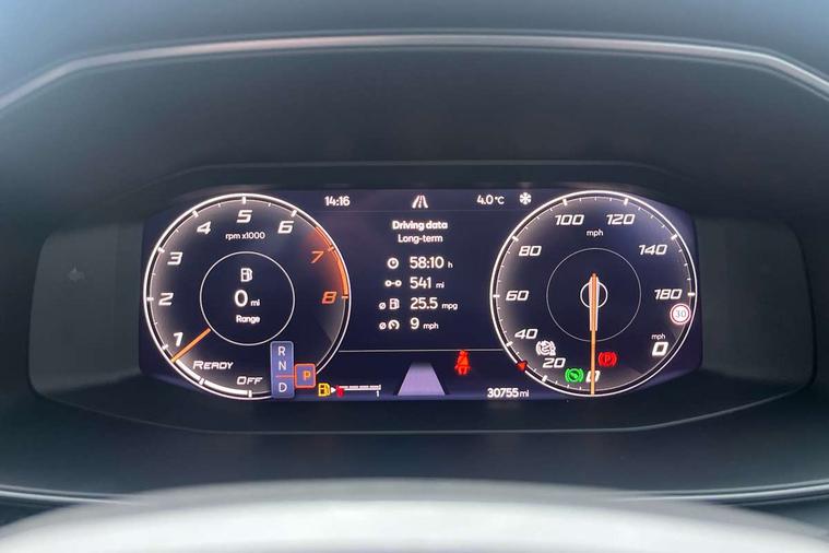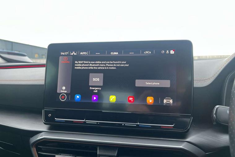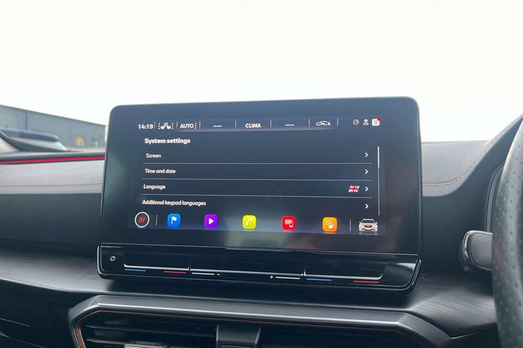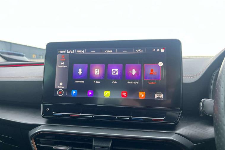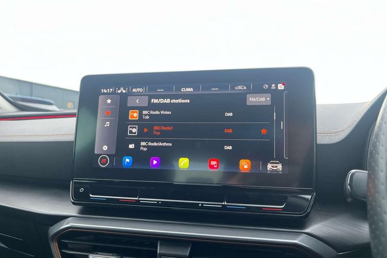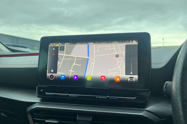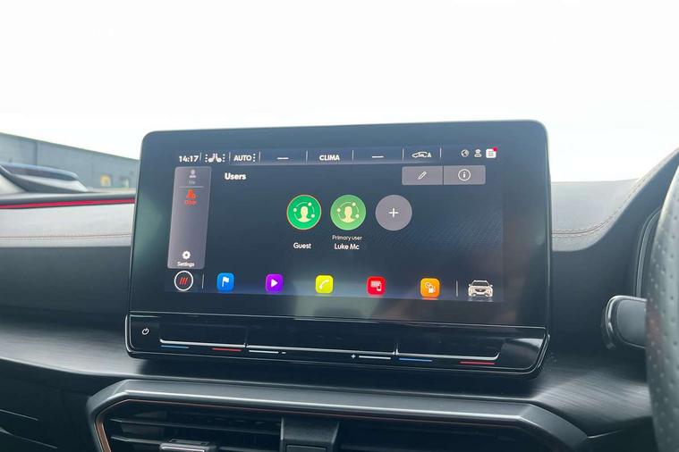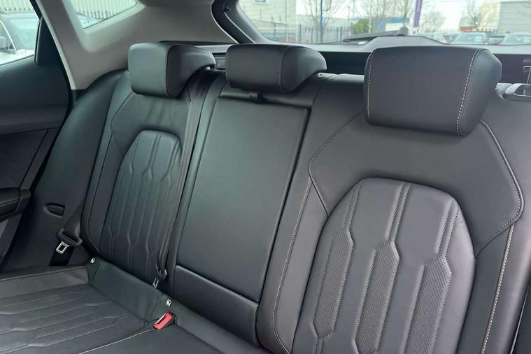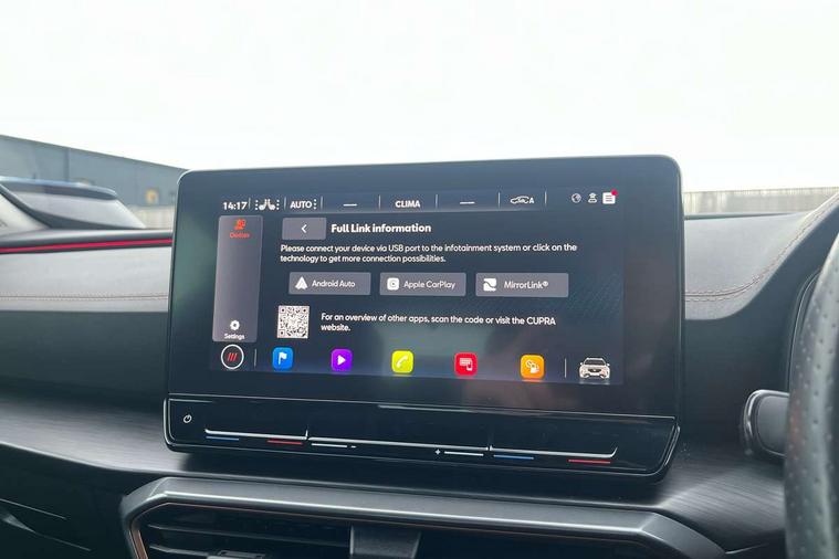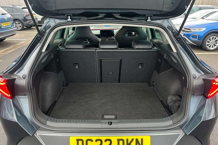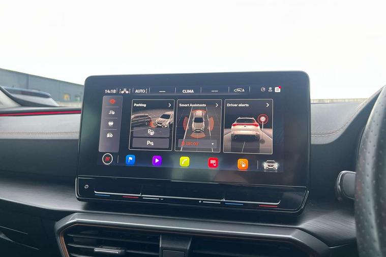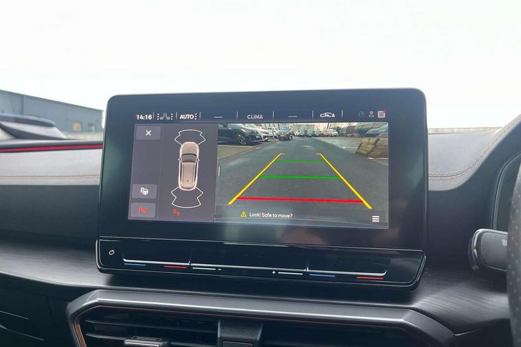 Digital cockpit and configurable dashboard, Driver alert system, Driving profile selection, E-call, Forward collision warning with automatic braking, Lane assist, Park assist (inc front/rear parking sensors), PAS, Predictive adaptive cruise control with speed limiter, Rear view camera, RPM, trip computer, outside temp gauge, instrument light brightness, low fuel warning light, lights on reminder, gearshift indicator, Service interval indicator, Start/stop system with regenerative braking, Wireless apple carplay, Wireless phone charger, Electronic locking differential and dynamic traction support, Standard suspension, 2 front and 2 rear USB type C sockets, Auxiliary input socket, DAB radio, Auto dimming rear view mirror, Body colour door handles, Body coloured bumpers, Dark grey wing mirror, Daytime running light with automatic headlight control and coming home feature, Dynamic headlight range control, Electric front/rear windows, Electrically adjustable heated and folding door mirrors with memory function, Front fog lamps with cornering function, Gloss black roof rails and window surrounds, LED Headlights, LED Taillights with dynamic indicator, Rain sensing wipers, Rear diffuser with black simulated exhaust pipes, Rear side wing doors, Rear wash/wipe, Third brake light, Tinted rear windows, Welcome lights, 12v power supply in centre console, 12V socket, 12v socket in loadspace, 2 front and 2 rear reading lights, 230V socket, 3 seat bench in 2nd row, 60/40 split rear bench seat with armrest and mechanical seat release, Dust/pollen filter, Front and rear head restraints, Front centre armrest, Height/reach adjust steering wheel, Illuminated interior front door sills, Illuminated sunvisor with mirror, Isofix, Leather multi function heated steering wheel with gear shift paddles, Luggage tie-down hooks, Single front passenger seat, Three zone climate control with control panel in rear, Variable luggage/load compartment floor, Wraparound lighting, Genuine Nappa leather Pack - Cupra, Navigation system pack with 10" navigation system - Formentor, 3 point seatbelts on all rear seats, ABS, Brake control system - ESC and brake booster, Child proof door locks, Driver and front passenger airbags with front passenger airbag de-activation, Electronic parking brake, Front and rear disc brakes, Front side curtain airbags, Hill hold control, Seat belt reminder for front and rear seats, Tyre pressure monitoring system, Anti theft alarm system, Keyless entry and start system (KESSY), Locking wheel bolts, Copper and aluminium interior detailing, 19" 'Exclusive' machined sport matte black and silver alloy wheels,