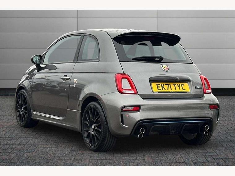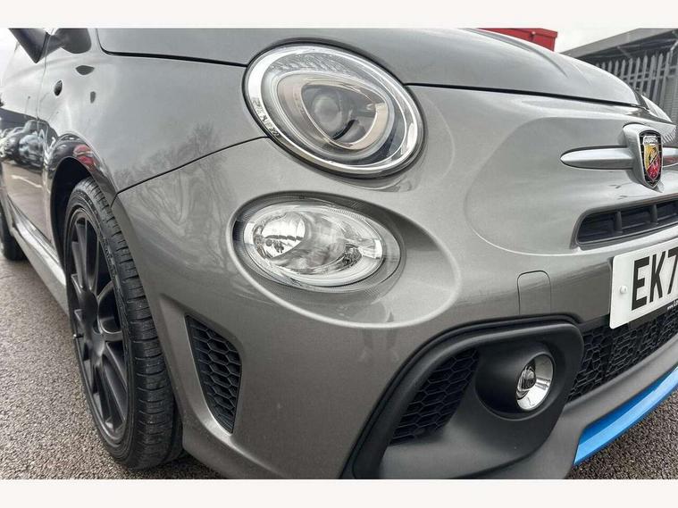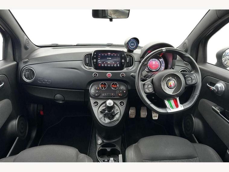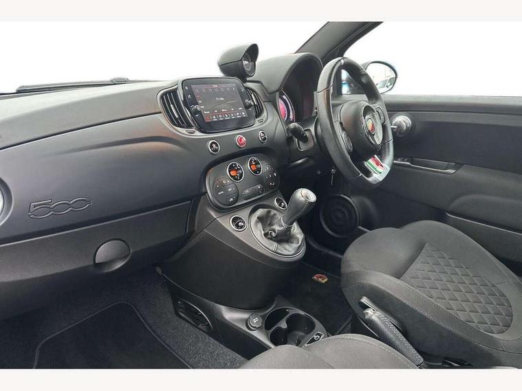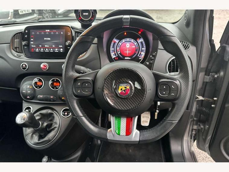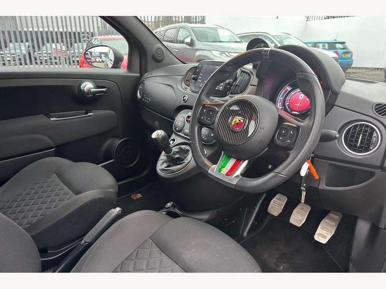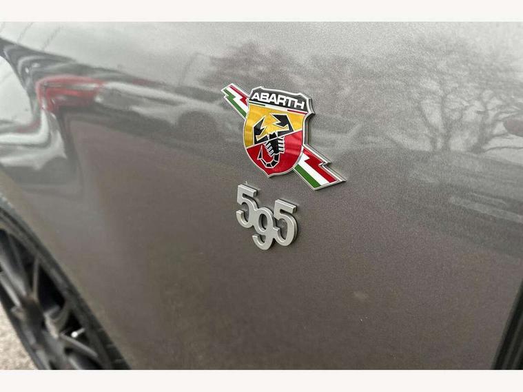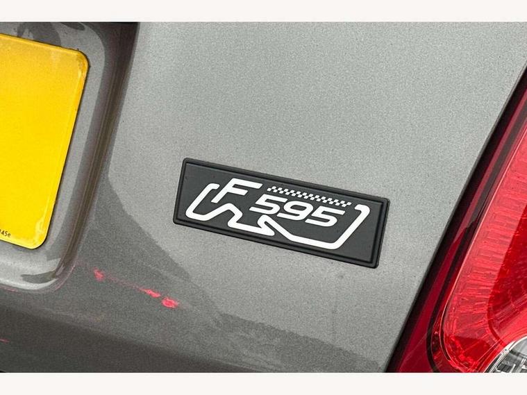 7" TFT instrument display with sports mode, Apple car play/Android Auto, Dualdrive PAS, Rear parking sensors, Sports button, U-connect access via mobile, Wakeup screen for 7" radio, Koni rear suspension with FSD technology (Frequency Selective Damping), Torque transfer control (TTC), 6 speakers, Black radio bezel, Active record Monza exhaust with double vertical tips, Electric front windows, F595 rear badge, Front fog lights, LED daytime running lights, Manually foldable and electrically adjustable door mirrors, Rear wiper, 12V socket, Abarth sport seats, Driver/front passenger seat height adjustment, Front head restraints, Glovebox, Height adjustable steering wheel, High performance BMC air filter, Interior stowage net, Leather-bound steering wheel with remote controls, Rear headrests, 2 x 3-point rear seatbelts, 240x11 mm Drilled rear brake discs, 284x22 mm Drilled and ventilated front brake discs, ABS, Driver and passenger airbags, Drivers knee airbag, ESP + ASR/MSR + HBA + Hill holder, Front side airbags, Tyre pressure monitoring system, Window airbags, Alarm, Immobiliser, Remote central locking, Matt black fascia with black tar 500 logo, 17" Formula alloy wheels with matt black finish, Fix and go kit,