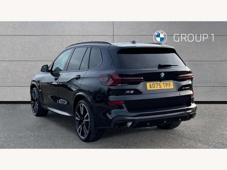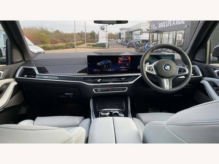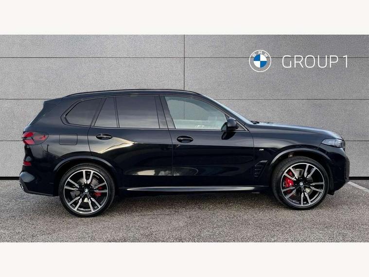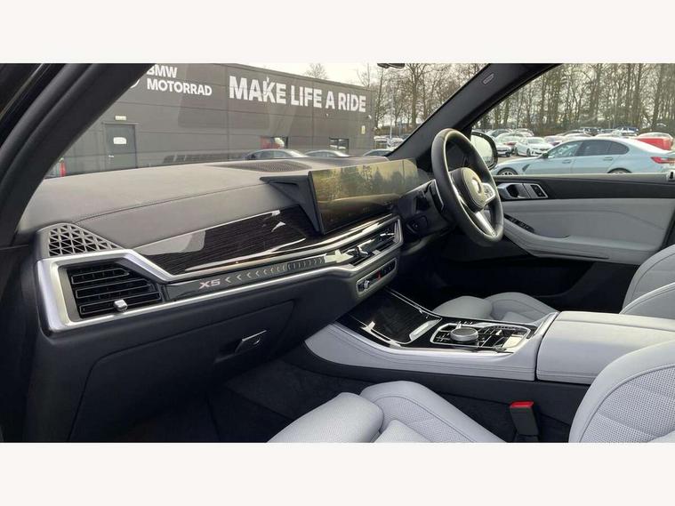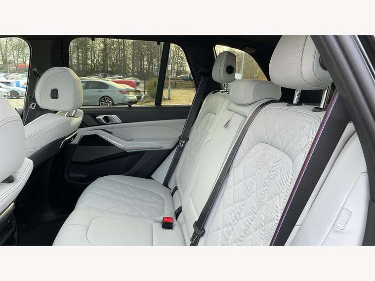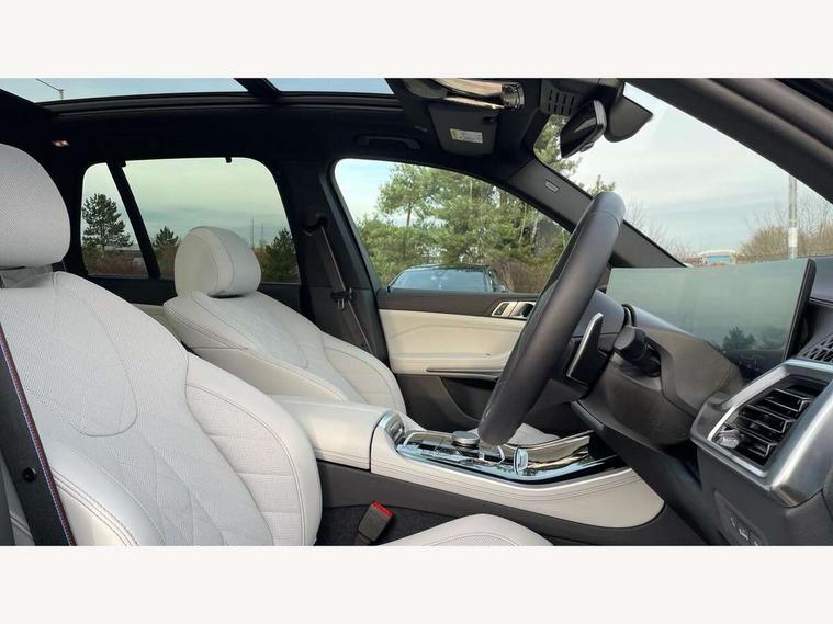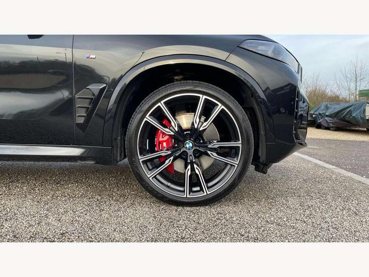 Attentiveness assist, Automatic tailgate operation, BMW ConnectedDrive online services, BMW live cockpit + with curved 12.3 instrument cluster/14.9 central display, nav/Tuner with diversity reception, RDS/4GLTE/remote software upgrade, BMW Recovery system, BMW Teleservices, Condition based service, Cruise control with brake assist, eCall emergency call system, Enhanced bluetooth with wireless charging, Integrated owner's handbook, PAS, Speed limiter, Wi-Fi hotspot, Drive performance control with ECO PRO comfort + sport mode, Eight speed steptronic sport automatic transmission and gearshift paddles on the steering wheel, Adaptive LED Headlights, Front and rear electric windows, High beam assistant, High gloss black shadow line roof rails, LED daytime running lights, Rain sensor, Rear side wing doors, Third brake light in rear spoiler, Variable intermittent rear wash/wipe, 12V - Power sockets with 2x centre console and 1x luggage compartment, 3 seat bench in 2nd row, Entry sills illuminated BMW inscription front and rear, Foldable rear centre armrest with 2 cupholders and storage compartment, Front and rear side armrest integrated into door trim, Grab handles in 1st and 2nd row of seats with Integrated in headliner, at rear with coat hooks, plastic, Headrests for all seats, Luggage compartment separating net, Lumbar support with height and depth adjustment in backrest, Single front passenger seat, Sunvisors with illuminated vanity mirrors and ticket pocket, Three spoke sport M leather steering wheel, Velour floormats, Ambient light interior pack - X5, Driving assistant pack with radar based driver assistance system - X5, Expanded exterior mirror pack - X5/X5 M, M aerodynamics pack - X5, Parking assistant pack - X5, 3 rear seatbelts, Active protection, Airbags - driver/front passenger, rear and side, first and second row seats head airbags, front passenger seat airbag deactivation + knee airbag, Anti-lock braking system (ABS), Automatic Stability Control (ASC), Brake energy regeneration, Cornering brake control (CBC), Crash sensor activating central locking release, hazard warning lights, fuel cut off, interior lighting + activation of safety battery terminal clamp, DSC - Dynamic Stability Control, Dynamic Traction Control - DTC, Electromechanical parking brake with automatic drive away release and auto hold function, Electronic brake force distribution, Hill start assistant, M Sport blue painted brake calipers with 'M' designation, Mechanical child proof lock on rear doors, Tyre pressure monitoring system, Tyre pressure sensors, Ventilated front and rear disc brakes, Warning triangle and first aid kit, Alarm system, Closing system with central locking, Comfort access system, Locking wheel bolts,