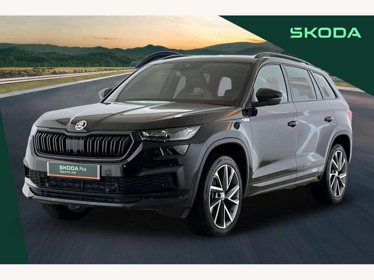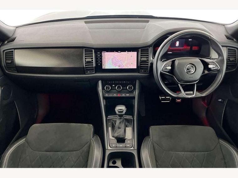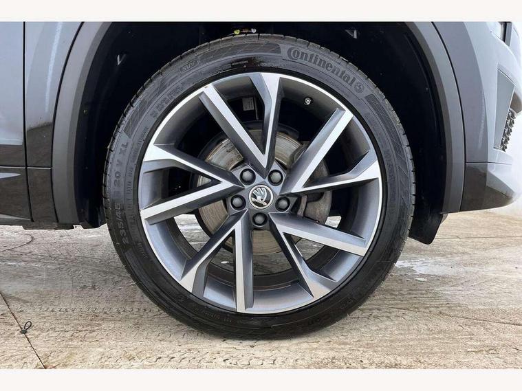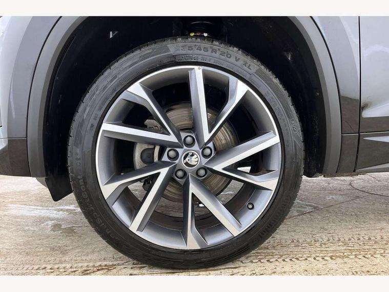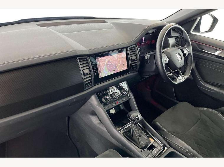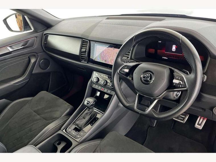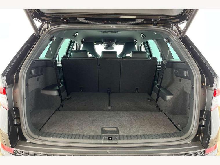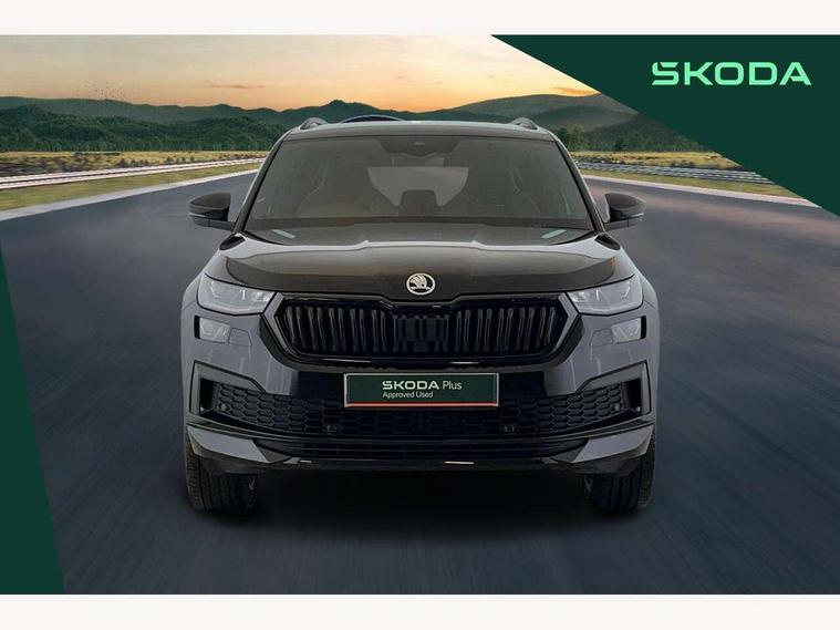 Bluetooth system, Columbus satellite navigation with 9.2" touchscreen, integrated Wi-Fi, web radio, Digital voice enhancement, e call+, ECO Stop/start function, Exterior temperature indicator, Progressive steering, Rear view camera, Smartlink wireless for apple carplay and wired for android auto, Speed limiter, Tailgate unlocking from outside, USB C Port x 2 in front centre console, Wireless charging, 8 Speakers, DAB Digital radio, Aero front windscreen wipers with intermittent function, Aero rear window wiper, Auto dimming rear view mirror, Black roof rails, Black sports styling including front grille and window surrounds, Black wheel arch surrounds, Body colour bumpers, Body colour door handles, Electric adjustable/heated/folding door mirrors, driver side auto dimming with boarding sports and memory function, Electric front and rear windows, Extended rear spoiler with finlets in gloss black, Front fog lights, Full LED matrix headlights with AFS (adaptive front light system), cornering function and AWL (all weather lighting system), Gloss black door mirrors, Headlight washers, Heated rear window, Invisible tailpipe, LED daytime running lights, LED rear fog light, LED third brake light in rear spoiler, Light assistant (coming/leaving home/tunnel light), Off-road style lower front bumper element, Privacy glass, Rain and light sensors, Rear diffuser, Rear LED lights (high functionality) with welcome effect and dynamic indicators, Rear side wing doors, Safety reflectors on front and rear doors, Sportline badge on front fender, Sports front and rear bumpers including lower rear chrome strip, Tailgate lettering in Black, Window control switches with black trim, 12V socket in boot, 2 rails with 2 hooks, 2 seat bench in 3rd row, 3 seat bench in 2nd row, 4 foldable roof handles with rear coat hooks, 60:40 foldable rear seat with sliding adjustment and backrest angle adjustment, Aluminium pedals, Black roof headlining, Bottle holders in door panel in the 1.5 litre front and 1 litre rear, Cargo storage compartments, Chrome headlight control button, Chrome interior door handles, Coat hooks on B pillar, Covered storage compartment on driver side, Decorative door sill covers, Front centre armrest with storage compartment, cup holder and 12V socket, Front courtesy lights, Gear shift lever with chrome frame and black gloss insert, Grey stitching in front and rear armrests and door armrests + door inserts, Height adjustable front headrests, Illuminated and cooled glovebox, Illuminated luggage compartment, Isofix child seat fittings in outer rear seats with top tether, Manually adjustable steering column, Microsuede door panels, Net programme in boot (1x horizontal Net, 2x vertical Nets), Overhead glasses storage compartment, Pollen filter, Rear centre armrest with cupholders, Single front passenger seat, Sliding trunk cover, Small Bags on the inner sides of the front backrests, Sports seats, Sunvisors with illuminated vanity mirrors, Three rear height adjustable headrests, Ticket holder on A Pillar, Umbrella in door panel, Variable boot floor, LED Interior light pack - Kodiaq, Auto door release and activation of warning lights in the event of an accident, Child locks on rear doors, Driver and front passenger airbag with knee airbag and front passenger airbag deactivation, Electronic parking brake with hill start assist, Emergency rear braking signal, ESC (incl. ABS+MSR+ASR+EDS+HBA+DSR+RBS+MKB), Front assist with autonomous emergency braking, Front side airbags with curtain airbags, Fuel cut off safety device, Height adjustable front 3 point seatbelts + pretensioners, Hill hold control, Rear disc brakes, Safety vest holder in door, Seat belt reminder for all seats, Three point rear seat belts, Two tone horn, Tyre pressure monitor, Alarm with interior monitoring and tilt sensor with safe function, Anti-theft wheel bolts, Immobiliser, Keyless entry and start system (KESSY), Remote central locking with 2 keys, Black air vent surround, Carbon finish dashboard and door inserts, Grey stitching in dashboard, 20" Vega Anthracite alloy wheels, Temporary spare wheel (space saver),