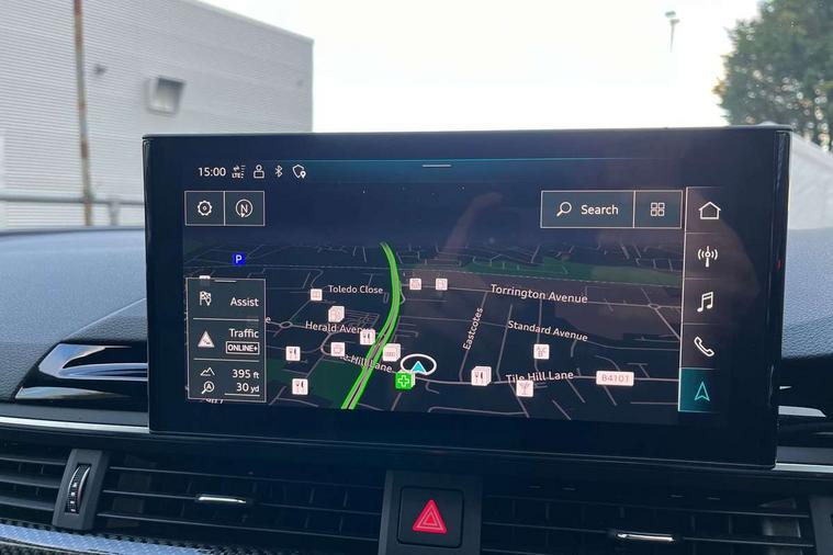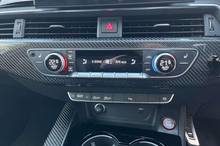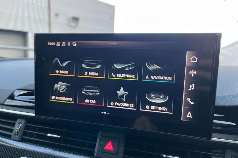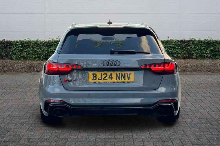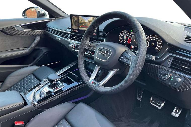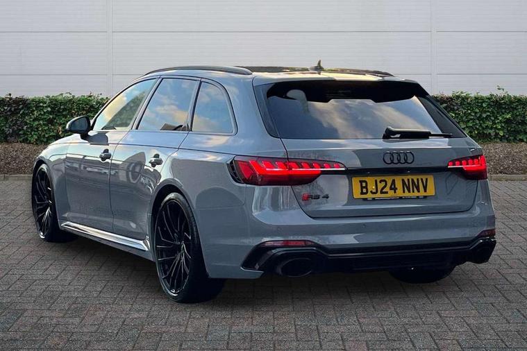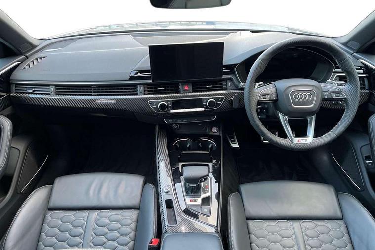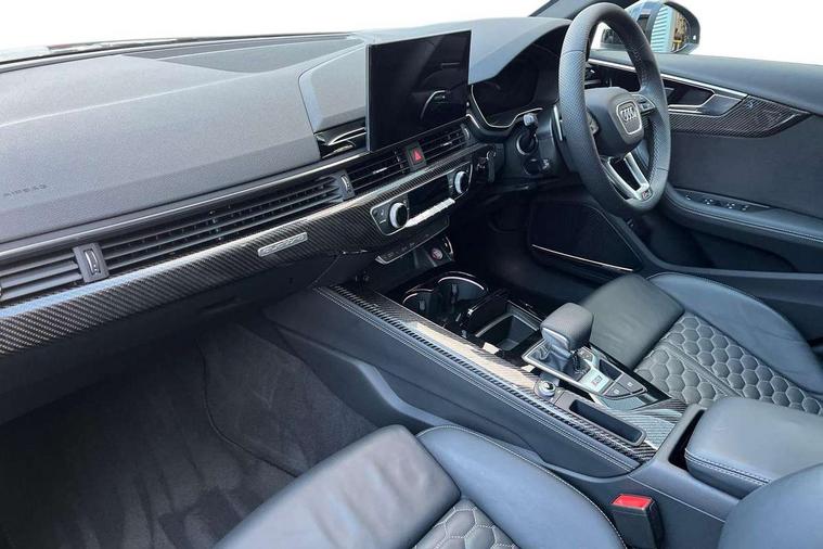 7" Colour driver information system, Audi connect safety and service (e-call), Audi drive select, Audi side assist, Audi smartphone interface, Audi virtual cockpit with RS specific display, Automatic start-stop system with coasting functionality and efficiency programme, Bluetooth interface, Camera based traffic sign recognition, Electromechanical power steering, Email, calendar and text messages displayed via MMI, Lane departure warning, MMI Navigation plus with MMI touch includes 10.1" high resolution colour MMI display, 3D map, Power opening/closing tailgate, Service interval indicator, Voice control system, 58 Litre fuel tank, Quattro sports differential, 2 USB charging ports, Audi sound system, DAB digital radio module, 3rd brake light, Acoustic windscreen, Audi Beam uses LEDs to project the RS logo onto ground as you exit your RS4, Audi matrix LED headlights with LED rear lights + dynamic front and rear indicators, Audi rings and lettering glossy black, Auto dimming rear view mirror, Automatic headlights + automatic windscreen wipers, Black roof rails, Blue tinted glass, Body colour door handles, Electric front windows, Electric rear windows, Electrically folding auto dimming/adjustable/heated door mirrors with memory function, LED side indicators and kerb view function for passenger side, Flared front and rear wheel arches, Front bumper with enlarged air inlets, Headlight range control, High beam assistant, High gloss black door mirror housing, High gloss black triangular aperture at rear door, Honeycomb design grille with quattro logo, Lateral air inlets next to front headlights, LED daytime running lights, LED indicators in door mirrors, Privacy glass with rear acoustic glazing, Rain and light sensors, Rear side wing doors, Rear wiper, Roof spoiler, RS 4 badges on grille and rear, RS4 dual branch chrome tailpipes with left and right oval pipes, 3 seat bench in 2nd row, 40/20/40 split folding rear seats with rear centre armrest, Black cloth headlining, Deluxe 3 zone electronic climate control, Door armrests and knee pad in leatherette, Electric load area cover, Electrically adjustable front seats, Front centre armrest, Front headrests, Heated front seats, Heated steering wheel, Height and reach adjustable steering wheel with full size airbag, Illuminated door sill trims with RS4 logo, ISOFIX child seat mounting and top tether, Luggage compartment carpet, Rear headrests, Retractable load area cover, Single front passenger seat, Stainless steel pedals, Sunvisors with vanity mirrors, Tool kit, Carbon black styling pack - RS4, LED Interior light pack - RS4, Non Smokers pack, 3 point seatbelts on all rear seats, Adaptive driver and front passenger airbags, Attention and drowsiness assist, Electromechanical parking brake, Electronic stabilisation control including ABS, ASR and EDL, Enhanced braking system, Front head airbags, Front seatbelt pretensioners + load limiters, Front side airbags, Hill hold assist, Manual child lock in rear doors, Multi-Collision braking, Pop-up bonnet for pedestrian protection, Pre sense city, Rear side airbags, Seatbelt monitoring, Traction control, Tyre pressure warning, Variable restraint system, Warning triangle and first aid kit, Anti theft alarm, Anti-theft wheel bolts, Immobiliser, Keyless Go, Remote central locking, Remote control key with RS emblem, Carbon twill inlays, 20" 5 segment spoke evo design glossy black sport alloy wheels, Tyre repair kit,