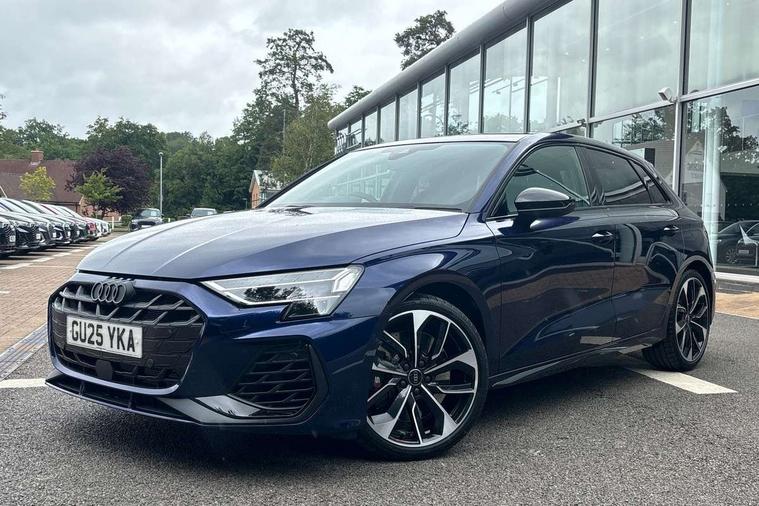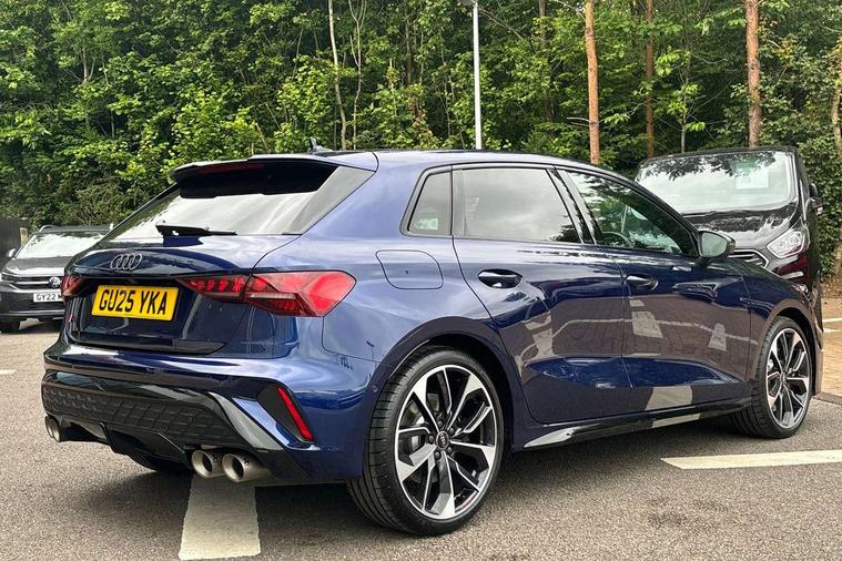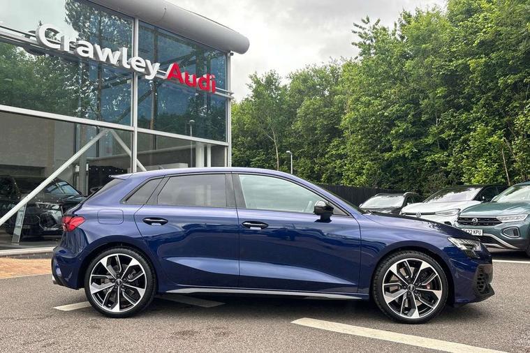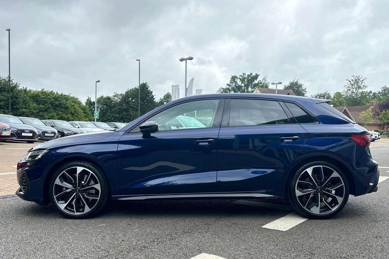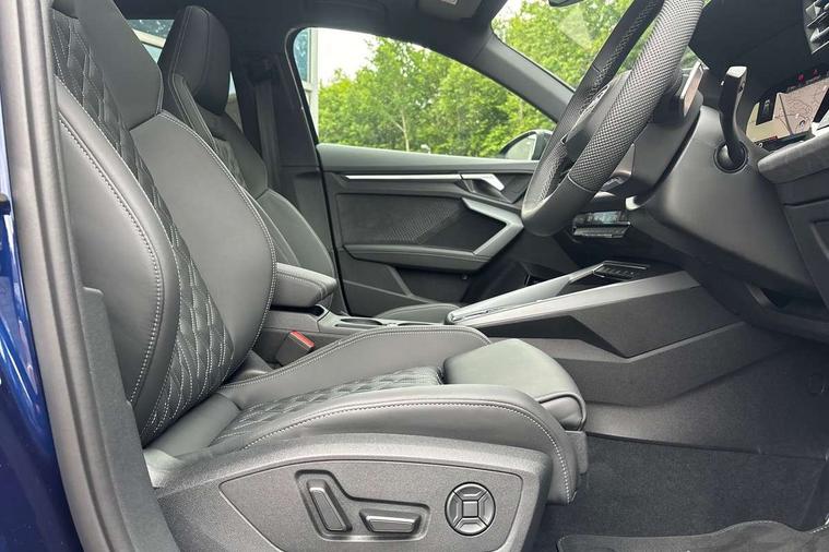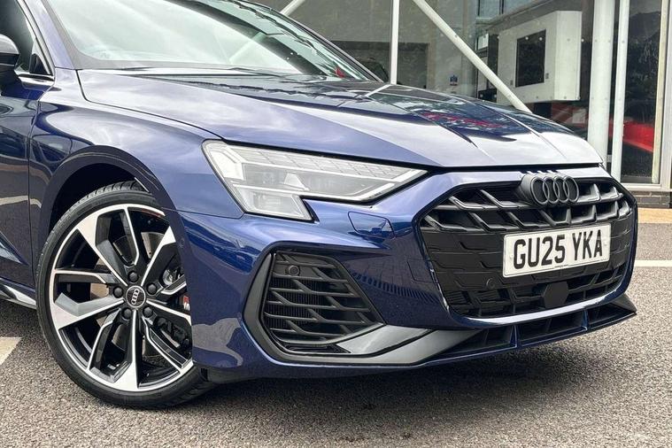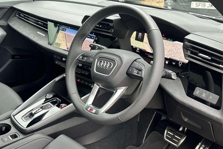 Adjustable speed limiter, Audi drive select, Audi smartphone interface with app store includes wireless Apple carplay, Android auto and Amazon alexa integration, Audi virtual cockpit plus - 12.3" full HD resolution dynamic digital instrument cluster, Automatic start/stop system with recuperation, Bluetooth interface, Camera based traffic sign recognition, Collision avoidance assistant, Distraction and Fatigue warning, e-Call (emergency call), Emergency assist, Lane departure warning system, MMI Navigation Plus with high resolution 10.1" colour touch screen display, Park Assist with parking system Plus, Progressive steering, Service indicator, Tailgate, Trip computer, Voice control system with natural language interaction, quattro permanent all-wheel drive with torque splitter, S sport suspension with spring damper adjustment and lowering by 15mm, Audi Phonebox light with wireless charging, DAB Digital radio, USB ports with charging function in the rear, All weather light, Anthracite grey Audi rings (front and rear), Audi Beam uses LEDs to project the rhombus S logo onto the ground as you exit your S3, Auto dimming frameless rear view mirror, Automatic dynamic range control, Black accents front and rear bumpers including air inlets, Black accents in front grille and frame, Black accents in window trims, Dipped beam, main beam, position light and turning light, Electrically adjustable/heated/folding/auto dimming door mirrors with integrated LED indications + kerb view function for passenger side, Exterior model badging, Front electric windows, Headlight washers, Heat insulating glass windscreen, Illuminated door sills with aluminium inserts at the front with S logo, Intersection light, LED 3rd brake light, LED brake lights, LED daytime running x3, LED headlights with LED rear lights and dynamic rear indicators, LED rear number plate lights, LED reverse light, LED tail lights, Light and rain sensors, Manoeuvring light, Motorway light, Privacy glass - dark tinted rear window, rear door and side windows, Rear diffuser and grill in grained matt black with inlay in dark liquid chrome, Rear electric windows, Rear side wing doors, Rear wiper, S grille, S3 front bumper with S specific air intake grilles, S3 roof spoiler, Static cornering light, 12V socket and storage compartment in front centre console, 3 seat bench in 2nd row, 3 spoke flat bottomed leather multifunction sport steering wheel with gear shift paddles, 3-zone deluxe automatic air conditioning, 4 way electrically adjustable lumbar support for driver and front passenger, 40/20/40 split folding rear seat bench, Black cloth headlining, Black front and rear floor mats, Fine Nappa leather upholstery with front sports seats S embossed logo, Front and rear centre armrest in artificial leather with contrasting stitching on armrests and instrument panel, Front and rear headrests, Heated front seats, Height and reach adjustable steering wheel, Manual boot compartment lid, Manually adjustable front seats, Rear centre armrest with cupholder, S badging on the steering wheel, Seat side bolsters, Single front passenger seat, Stainless steel pedals and front footrest in black, Aluminium interior elements pack - A3, Storage package - A3, Technology package - A3, 3x3 point rear seat belts, Driver and front passenger airbag with passenger airbag deactivation, Electronic Stabilisation Control (ESC) including ABS, ASR and EDL, First aid kit with warning triangle and 2 safety vests, Front side airbags with head airbags and interaction airbag, Hill hold assist, Pre-sense front with pedestrian and cyclist detection, Seatbelt monitoring, Tyre pressure loss indicator, Anti theft alarm, Anti-theft wheel bolts, Electronically operated child locks, Immobiliser, Remote central locking with safelock, Black dashboard, Tyre repair kit,
