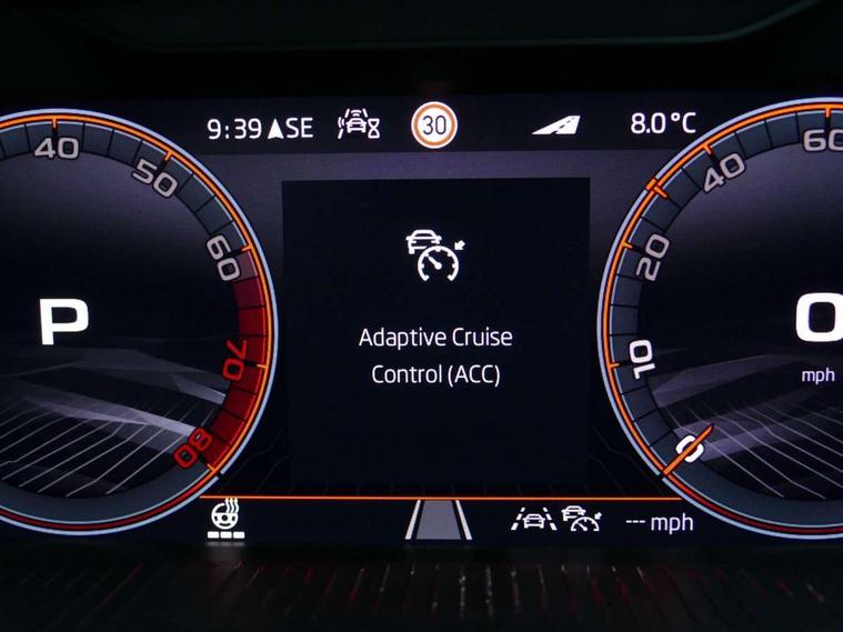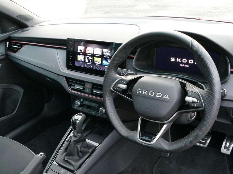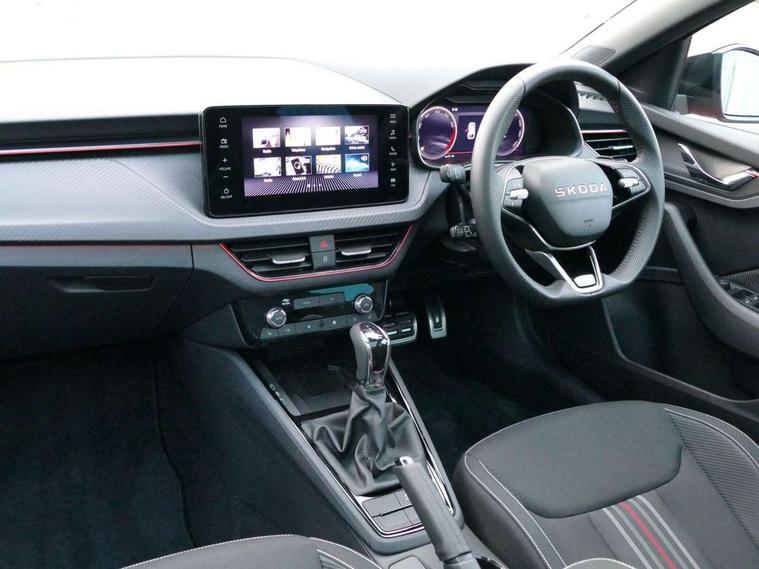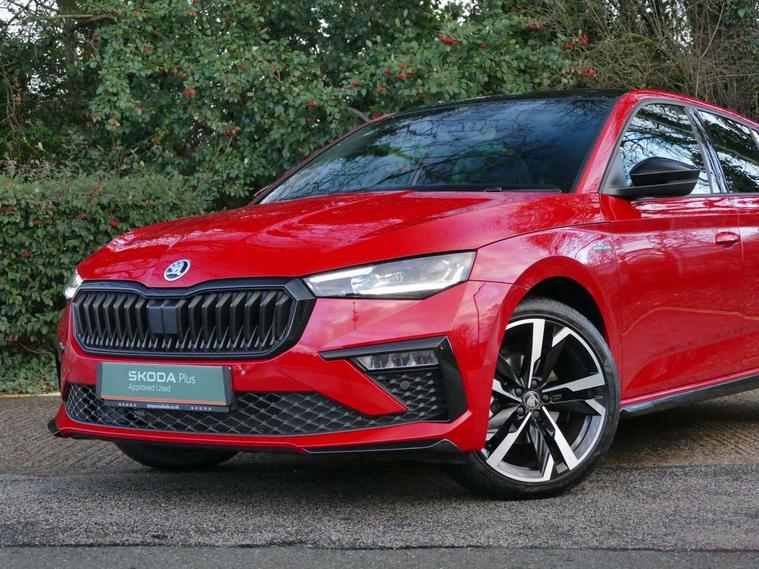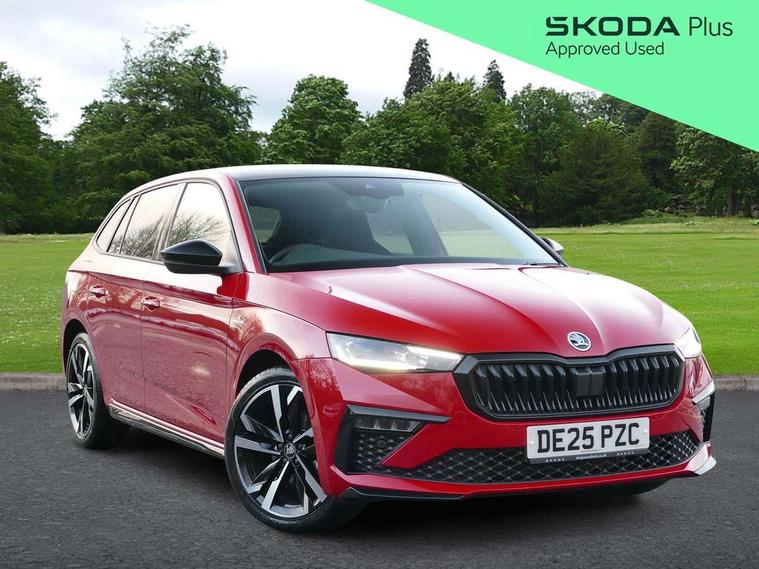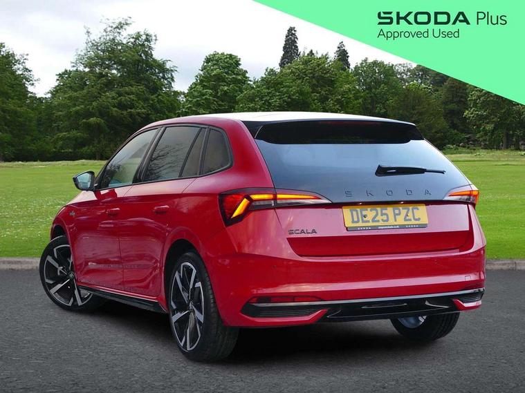 Advanced driver attention and drowsiness monitor, Bluetooth, e-Call (emergency call), Front assist system, PAS, Rear parking sensors, Rear view camera, Speed limiter, Tailgate, Traffic sign recognition, Virtual Cockpit - 10.25" digital display, Voice control system, Wireless smartlink, 4 USB C ports, 8 Speakers, 9.2" Skoda navigation display, DAB radio, Auto dimming rear view mirror, Automatic headlamp activation with Coming home and Leaving home feature, Automatic high/low beam, Automatic intermittent wipers, Black door mirrors, Black lettering on boot lid, Black radiator grille, Black rear diffuser, Black roof spoiler, Body colour bumpers, Body colour door handles, Chrome moulding around grille, Extended tailgate glass, Front and rear electric windows, Heated rear window, LED 3rd brake light, LED brake lights, LED daytime running lights, LED high beam, LED low beam, Light sensors, Monte carlo plaque, Panoramic glass roof, Privacy glass, Rear LED fog light, Rear side wing doors, Rear wiper, Tinted windows, Unique dark chrome design logo on alloy wheels, 12V socket in luggage compartment, 3 seat bench in 2nd row, Aluminium pedals, Ambient lighting in white/red, Black / White armrest stitching, Black ceiling, Black roof headlining, Cargo elements, Chrome inner door handles, Door inserts in art.leather carbon, Driver and passenger sun visors with vanity mirror, Dual zone climate control, Front and rear roof lights, Front centre armrest, Front head restraints, Height adjustable driver seat, Height adjustable passenger seat, Ice scraper, Illuminated glove compartment, Inner circulation control with pollen filter, ISOFIX for front passenger seat, Isofix preparation for back seats, Leather gearknob and handbrake lever, Luggage net under rear parcel shelf, Manual lumbar support for front seats, Monte Carlo cloth upholstery, Net package and top tether hooks in boot space, Pocket on the back of both front seats, incl. mobile phone pockets, Rear centre armrest, Red hotstamping, Single front passenger seat, Skoda lettering on steering wheel, Sport seats, Textile floor mats, Third rear headrest, Ticket holder, Top tether for front passenger seat, Umbrella in driver's door, Light and view plus pack - Scala, 3x3 point rear seatbelts, ABS, Child locks, Curtain airbags and front side airbags, Disc brakes, Driver and front passenger airbags, ESP, Hill hold control, Manual leather parking brake, One tone horn, Passenger airbag switch off function, Seatbelt reminder for driver and front passenger, Tyre pressure monitoring system, Anti theft alarm system with interior monitoring, backup horn and towing protection, Anti-theft wheel bolts, Remote central locking with 2 remote folding keys, SAFE function for remote central locking, Carbon effect decorative inserts, 18" Ursa black diamond cut alloy wheels,