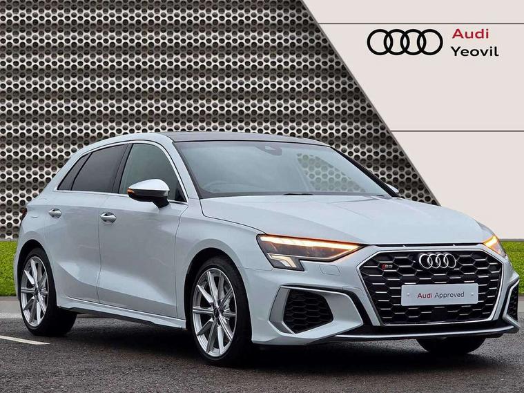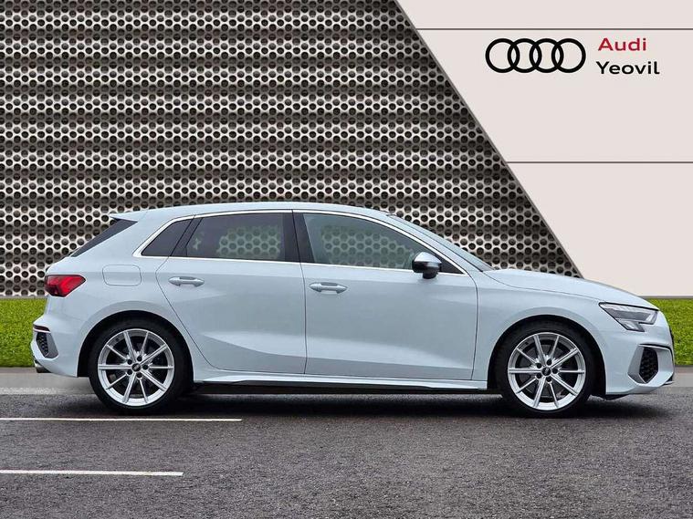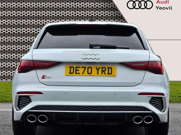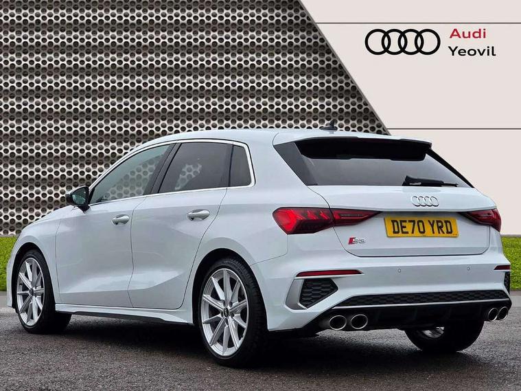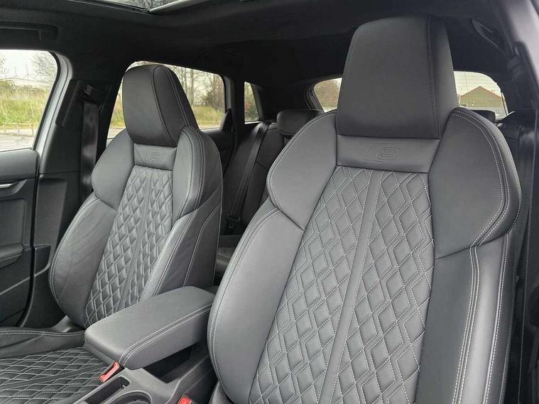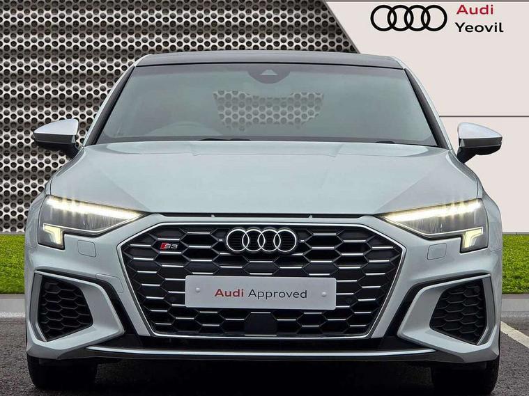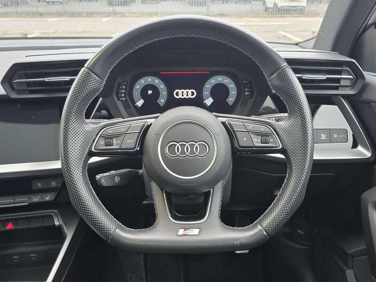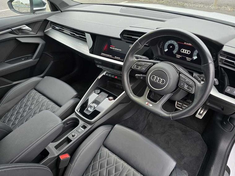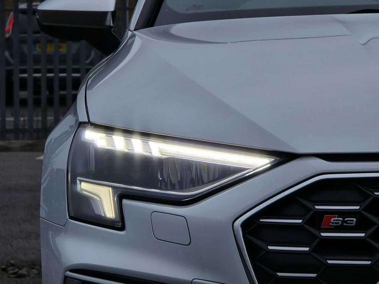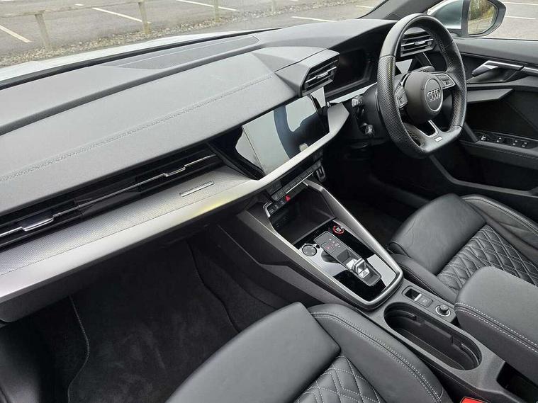 Audi connect emergency call and service, Audi drive select (Auto, Comfort, Dynamic, Efficiency and Individual), Audi smartphone interface, Audi Virtual Cockpit - 10.25" digital and colour instrument cluster, Automatic start/stop system with recuperation, Bluetooth interface, Collision avoidance assistant, Lane departure warning system, MMI Navigation Plus with high resolution 10.1" colour touch screen display, Progressive steering, Service indicator, Trip computer, Voice control system with natural language interaction, Quattro permanent all wheel drive, S sports suspension, 2xUSB-C connection with data and charging functions, 6 passive loudspeakers, DAB Digital radio, Acoustic glass windscreen, Aluminium window trim, Audi Beam uses LEDs to project the Audi S3 logo, Auto dimming frameless rear view mirror, Dual branch oval twin tailpipes in chrome plated finish, Exterior mirror with aluminium look housing, Front electric windows, Illuminated aluminium inserts front door sills with S logo, LED daytime running lights, Light and rain sensors, Privacy glass - dark tinted rear window, rear door and side windows, Rear electric windows, Rear side air outlets in grained matt black, Rear wiper, 12V socket and storage compartment in front centre console, 3 spoke flat bottomed multifunction plus sports contour leather wrapped steering wheel with shift paddles, 40/20/40 split folding rear seat bench with cupholder, Black cloth headlining, Dual zone electronic climate control, Front and rear centre armrest in leather, Front and rear headrests, Front/rear floor mats, Heated front seats, Height and reach adjustable steering wheel, Interior lighting - glove compartment light and right hand side, Luggage compartment floor covering, Seat side bolsters, Stainless steel pedals and front footrest, Aluminium interior elements pack - A3 Sportback, Design body styling - A3 Sportback, Storage pack - A3 Sportback, 3x3 point rear seat belts, Driver and front passenger airbag with passenger airbag deactivation, Electronic Stabilisation Control (ESC) including ABS, ASR and EDL, First aid kit with warning triangle and 2 safety vests, Front side airbags with head airbags and interaction airbag, Hill hold assist, Pre-sense front with pedestrian and cyclist detection, Seatbelt monitoring, Tyre pressure loss indicator, Anti theft alarm, Anti-theft wheel bolts, Electronically operated child lock, Immobiliser, Remote control central locking, Accent surfaces in the dashboard and centre console in platinum grey silk effect paint finish, Dark spectrum aluminium inlays,