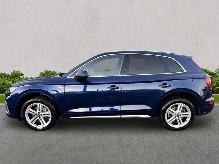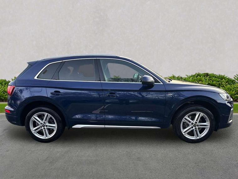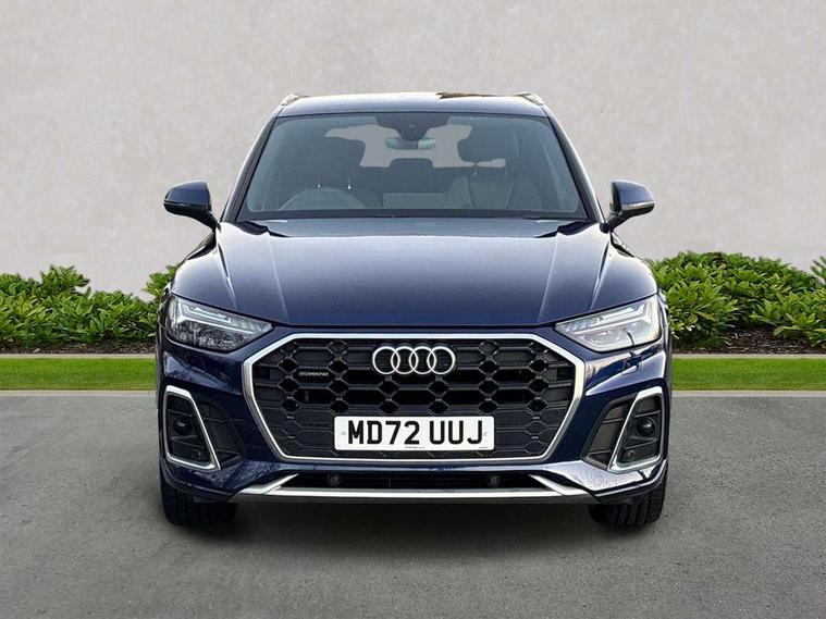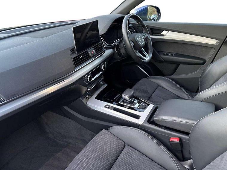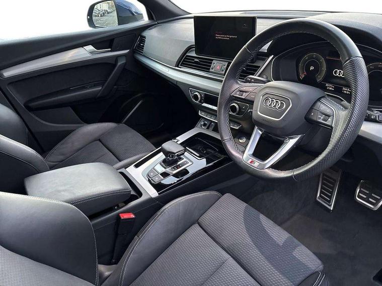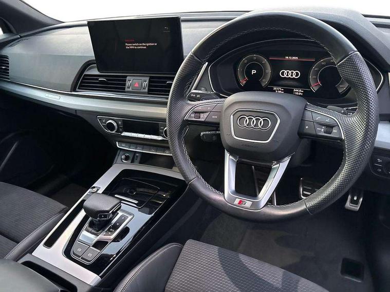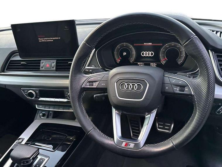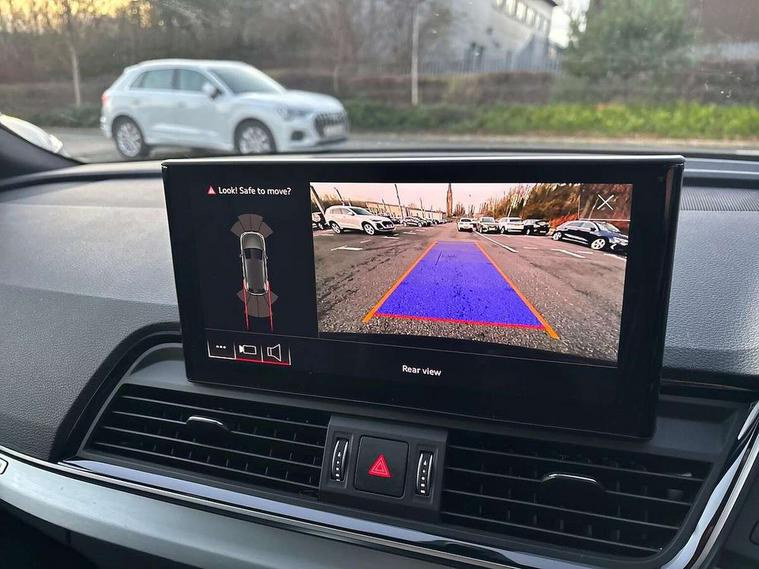 Acoustic front and rear parking sensor, Audi connect safety and service (e-call), Audi connect with Amazon Alexa Integration, Audi drive select, Audi virtual cockpit plus with 12.3" screen and three different layout designs, Audi wireless smartphone interface, Automatic start-stop system with coasting functionality and efficiency programme, Bluetooth interface, Electro - mechanical power assisted steering, MMI navigation plus with 10.1" touch screen, Power tailgate, Reversing camera, Service interval indicator, Voice control system with Audi hotword activation "Hey Audi", Diesel particulate filter, Quattro on demand, S line sports suspension, 2 x USB charging port with aux input socket, 8 loudspeakers, DAB Digital radio, Acoustic windscreen, Aluminium roof rails, Audi matrix LED headlights with dynamic front and rear indicators, Auto dimming door mirrors, Auto dimming frameless rear view mirror, Automatic headlight adjustment, Automatic headlights and windscreen wipers, Body colour bumpers, Body colour door mirrors, Body colour rear diffuser with matt aluminium silver surrounds, Body colour underbody protection, Chrome plated exhaust trims, Daytime running lights, Door sills in Selenite silver, Electric adjustable/heated/folding door mirrors, Front air inlet surrounds in aluminium, Front and rear electric windows, Front radiator grille in honeycomb design, Headlight washers, High level LED brake light, Lower bumpers painted in contrast Manhattan grey, Rear chrome trim strip below lights, Rear privacy glass and rear side windows, Rear side wing doors, Rear wiper, Roof bars, S Line badges on the front wings, S Line front and rear bumpers, S Line rear spoiler, S Line side skirts, 3 rear headrests, 3 spoke leather multifunction steering wheel with S badging perforated leather grips, 40:20:40 split folding 3 rear bench seat in 2nd row with rear centre armrest, Black cloth headlining, Comfort front centre armrest, Contrast stitching on seats, steering wheel and gear lever gaiter, Deluxe 3 zone electronic climate control, Front/rear floor mats, Gear lever in black leather, Heated front seats, Height adjustable front head restraints, Height/reach adjustable steering column, Illuminated door sill trims with S logo, Luggage compartment cover, Manual seat adjustment with 4-way electric lumbar support, Removable luggage compartment floor, Single front passenger seat, Stainless steel pedals, Sunvisors with vanity mirrors, High gloss pack - Q5, LED interior light pack - Q5, 3 point seatbelts on all seats, 6 airbags - Driver, front passenger, curtain and side airbags, Electrically operated child locks on rear doors, Electromechanical parking brake, Electronic stabilisation control including ABS, ASR and EDL, First aid kit with warning triangle and vests, Front passenger airbag deactivation, Hill descent control, Hill hold assist, ISOFIX child seat mounting for front passenger seat and ISOFIX child seat mounting with Top Tether for outer rear seats, Multi collision brake assist, Pop-up bonnet for pedestrian protection, Pre sense city, Seat belt force limiter, Seatbelt monitoring, Tyre pressure warning, Anti theft alarm, Anti-theft wheel bolts, Keyless Go access/ignition system, Remote central locking, Air vents inserts and centre console in gloss black, Matt brushed aluminium inlays,