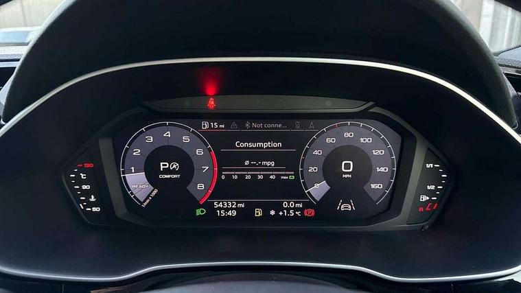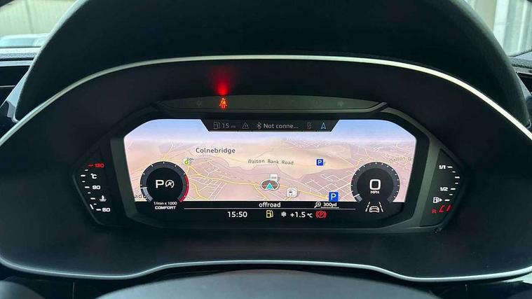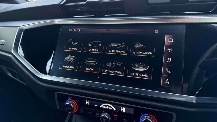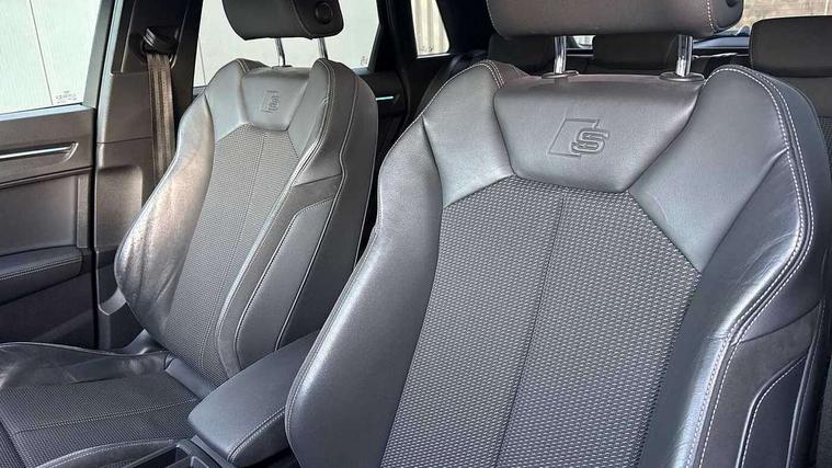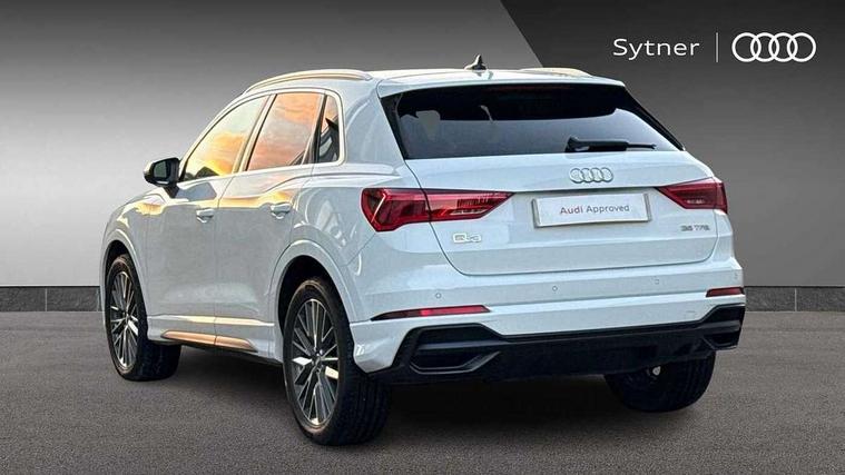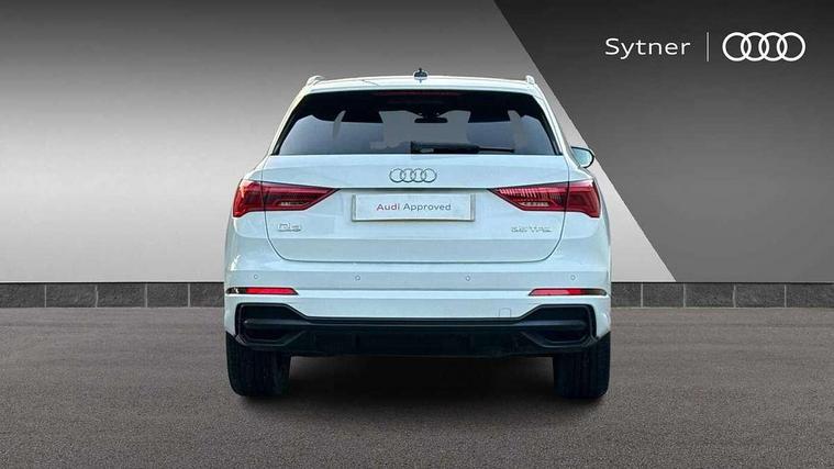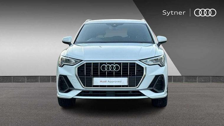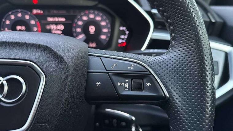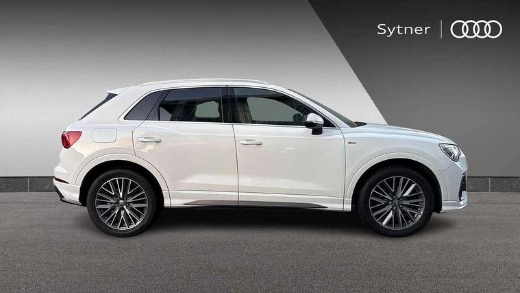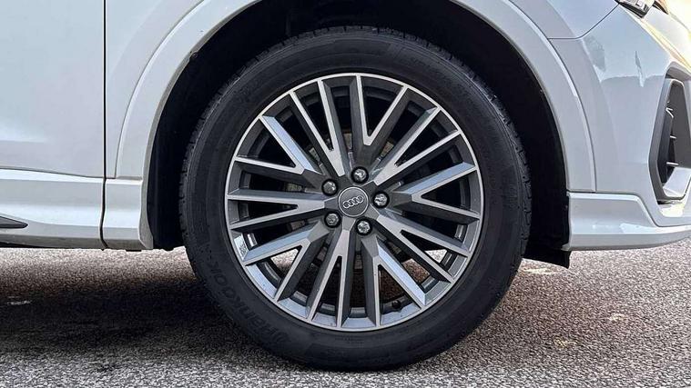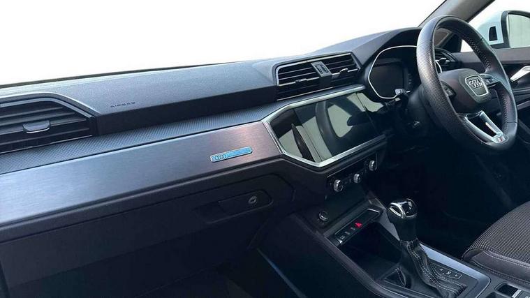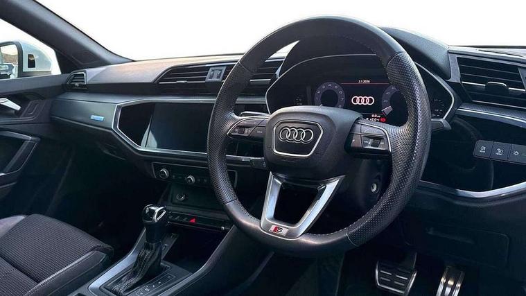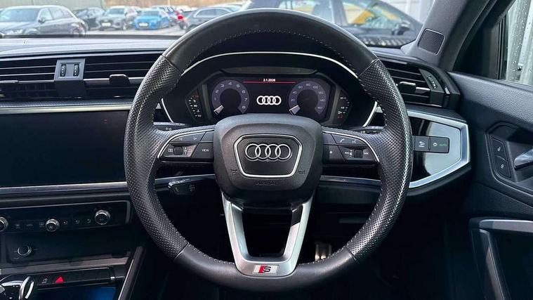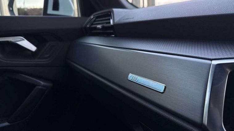 Audi connect safety and service (e-call), Audi drive select, Audi lane departure warning, Audi side assist, Audi smartphone interface, Audi Virtual Cockpit - 10.25" display, Bluetooth interface, Camera based traffic sign recognition, MMI navigation plus with MMI touch, Power opening/closing tailgate, Progressive steering, Rear parking sensors, Service interval indicator, Stop/start system, Voice control system, Sports suspension, 1 x USB type C and 1 USB type A charging points, 6 speakers, DAB digital radio module, Acoustic windscreen, Aluminium roof rails, Aluminium window trim, Auto dimming rear view mirror, Body coloured bumpers, Diffuser in matt Platinum grey, Electrically adjustable and heated door mirrors with integrated LED side indicators, Front and rear electric windows, Front fog lights, Front side air inlets in matt platinum grey, Front spoiler blade in matt platinum grey, Grille vertical bars in aluminium silver/Matt, High gloss black finish B and C pillars, LED headlights with LED daytime running lights and dynamic rear indicator, LED rear lights, Privacy glass, Rain and light sensors, Rear diffuser strip in matt titanium black, S Line badge on wings, S Line front and rear bumpers, Side skirt insert in matt Platinium grey, Titanium black radiator grille, 12V socket in rear centre console, 40:20:40 split folding rear bench seat, Adjustable rear seat bench/backrest with centre armrest and cupholder, Aluminium door sill trims, Black cloth headlining, Dual zone climate control, Front and rear black floor mats with contrast stitching in rock grey, Front and rear headrests, Front and rear roof module including reading lights, Front centre armrest with storage compartment and angle adjustment, Glove compartment lighting, Height and reach adjustable steering wheel, Illuminated door sill trims with S logo, ISOFIX child seat mounting and Top Tether with front passenger airbag deactivation, Luggage compartment light, Manual front seats with height adjustment, Perforated leather gearknob, Stainless steel luggage compartment sill finisher, Stainless steel pedals, Non smoking pack - Q3, 3x3 point rear seatbelts, 6 airbags - Driver, front passenger, curtain and side windows, Audi pre-sense front with pedestrain and cyclist recognition, Electrically operated child locks on rear doors, Electromechanical parking brake, Electronic stabilisation control including ABS, ASR and EDL, Hill descent control, Hill hold assist, Pre sense basic, Seatbelt monitoring, Tyre pressure warning, Warning triangle and first aid kit, Anti theft alarm, Anti theft wheel bolts, Remote central locking, Dark matt brushed aluminium inlay, MMI touch colour display in gloss black with aluminium surround, Tool kit, Tyre repair kit,