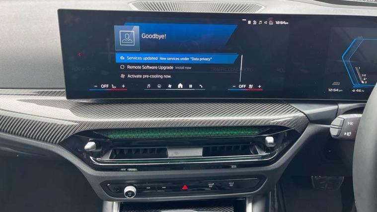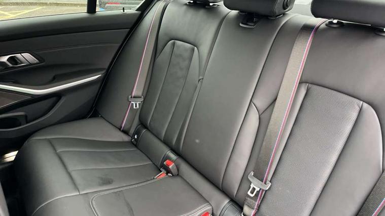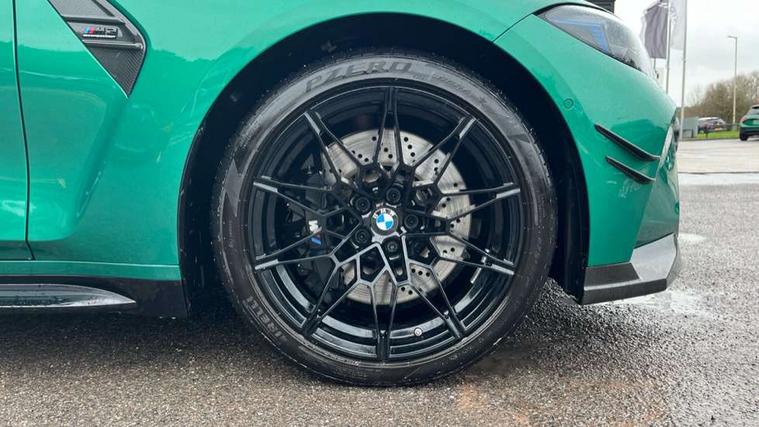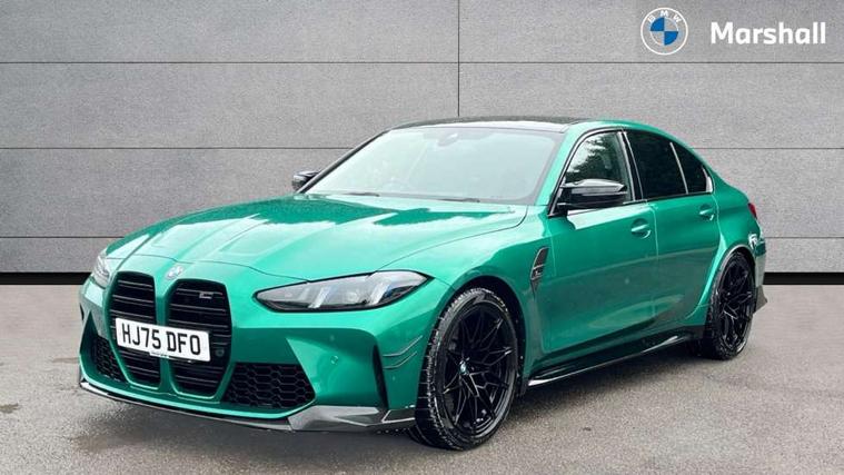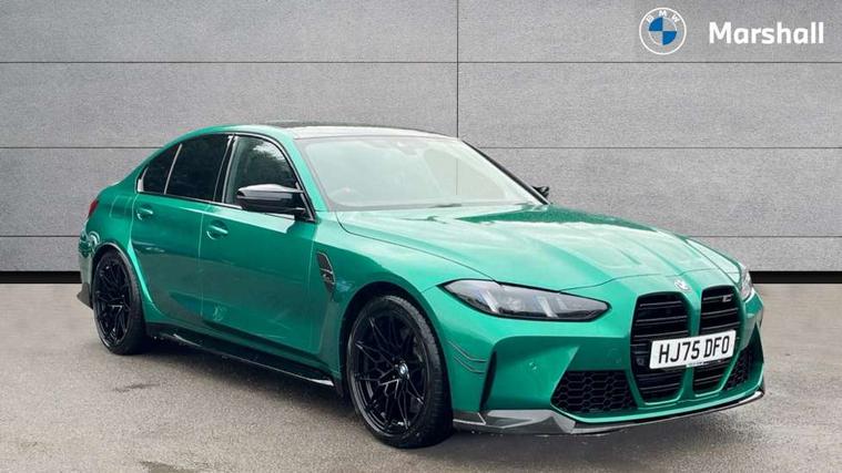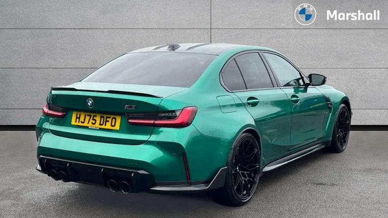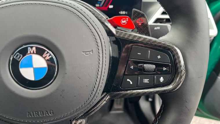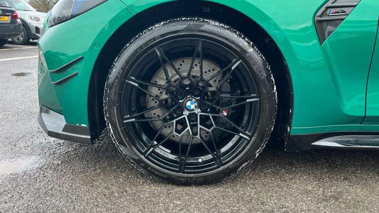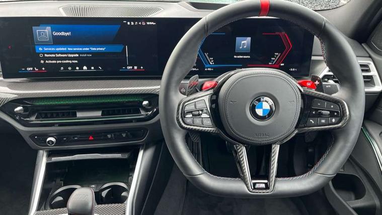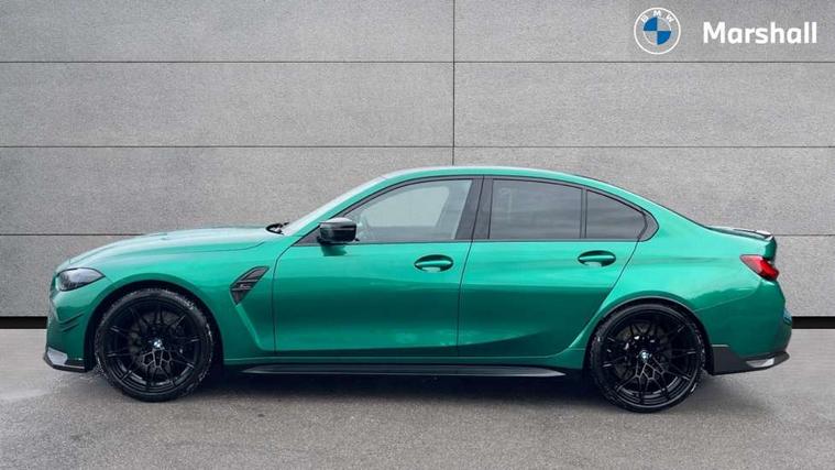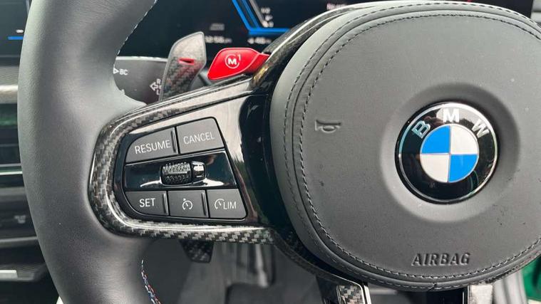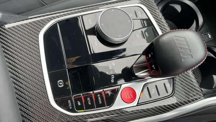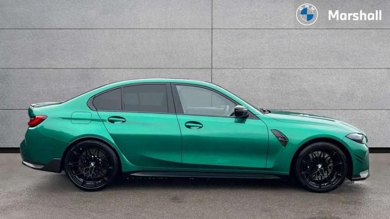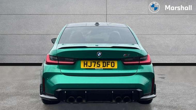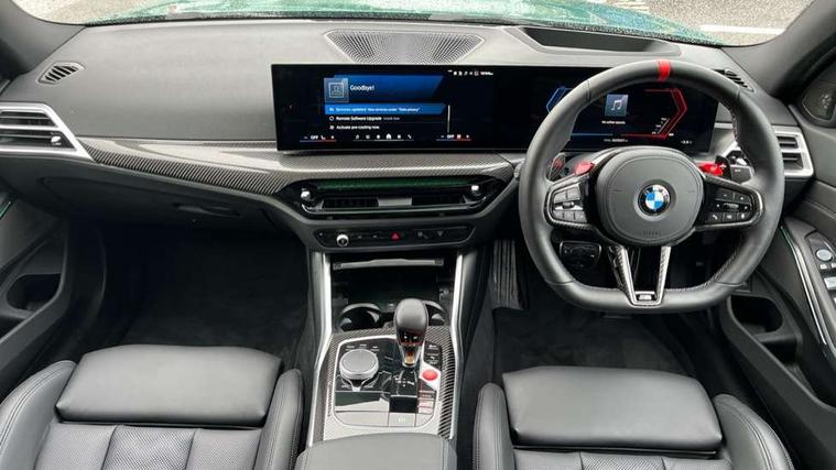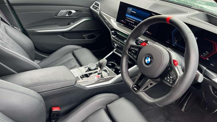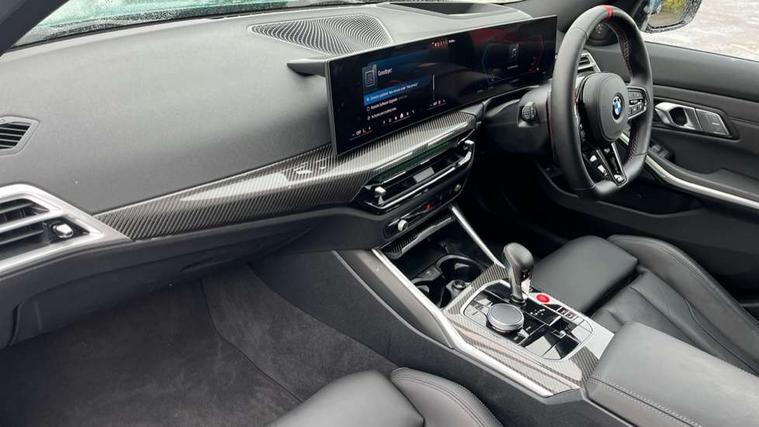 Active Guard, Automatic start/stop system, BMW ConnectedDrive online services, BMW legal emergency call, BMW Live Cockpit Pro with Head up display including 12.3" instrument display and 14.9" high resolution control display with navigation function, BMW Teleservices, Brake pad wear indicator warning light, Condition based service, Cruise control with braking function, Door/boot open warning light, Electric Power Steering (EPS) with Servotronic, Language version English, Lights on warning, M drive buttons, Oil sensor for level and grade, warning by check control system, Oil temperature gauge, On board computer, On board diagnostics, Optimum shift indicator, Outside temperature display, Park distance control, Pull away assistant, Run flat indicator, Service interval indicator, Shifting point display, Smartphone integration, Speed limiter, Start/stop button in red, Variable sport steering, Double joint spring strut front axle, M Adaptive suspension, M Drive Professional including track mode, laptimer, traction control & Drift analyser, M Sport differential, Safety battery terminal clamp, Sport automatic transmission with gearshift paddles, Auxiliary point for auxiliary devices, DAB radio with bluetooth music capability, Harman kardon surround sound audio system, Personal eSim, Auto dimming driver's door mirror, Automatic headlights + automatic windscreen wipers, Automatic parking function on front passenger's exterior mirror, Black model designation badges, BMW high gloss shadow line with extended contents, BMW radiator grille, frameless, with horizontal double blind slats, black high-gloss, with model badge, Body colour bumpers, Bonnet and tailgate badge, Carbon fibre reinforced plastic (CFRP) roof, Day time running light, Door mirror integrated indicators, Door sill finishers with aluminium inserts, Dynamic brake lights, Electric adjustable heated door mirrors, Electric folding door mirrors, Electrochromic exterior driver side mirror, Electrochromic interior rear view mirror with automatic anti-dazzle function, Entry sills with aluminium inserts and model badge, Follow me home headlights, Front and rear bumper system, Front and rear plastic apron in vehicle colour, Front door sill strips in aluminium inlays with M3 inscription, Front electric windows with open and close fingertip control, anti trap facility and comfort closing, Headlight beam throw control, Heat protection, sun protection glazing, Heated washer jets, High gloss black lower bumper edges, side sills and diffuser edge binding, LED tail lights with 3D L-shaped LED light design, M designation, Mirror glass aspheric on driver's side, convex on passenger side, Rain sensor, Rear boot, Rear fog lights, Rear reflectors, Rear side wing doors, Reversing light, Roof fin and roof trim strips in Black high-gloss, Shark fin roof aerial, Strakes in front side panel, black matt/high-gloss black, with model badge, Third brake light, Visible VIN plate, Welcome lighting, 2 cupholders in front centre console, 2 cupholders in rear armrest, 2 rear head restraints, 2 x 12 V Power sockets (luggage compartment and front centre console), 2 x USB Type C ports for charging and data transmission in front centre console, 3 seat bench in 2nd row, 40:20:40 split folding rear seat with loading system, Ambient inside door handle light, Ambient lighting for storage compartment, Ambient lighting front and rear, Anthracite headlining, Battery in luggage compartment, Centre console armrest with storage compartment, Contour lighting for door trim, Driver/passenger sunvisors with ticket holders + illuminated vanity mirrors, Driving experience mode switch, Dual zone automatic air conditioning, Dynamic ambient interior lighting, Electric front seats + driver memory, English handbook, Floor mats in velour, Front and rear door exit lights, Front door storage bins with bottle holder, Front footwell ambient lighting, Front interior light, Front isofix attachment + airbag deactivation, Front reading light, Front seat backrest width adjustment, Front/rear door armrests, Heated front seats, Height adjustable front headrests, Illuminated bow-type door handles in vehicle colour, driver's side with door lock, Interior mirror lighting, Isofix on 2nd row outer seats, Lockable/illuminated glovebox, Luggage compartment lighting, M Sport seats with with illuminated model designation, Multifunction steering wheel, Rake/reach adjustable steering wheel, Single front passenger seat, Storage compartment in rear doors, Storage tray and compartment with cover in centre console, Through loading system, Toolkit located in luggage compartment, Waterfall lighting for central air vent, Wireless charging tray, Connected package professional - M3, Extended storage pack - M3/M4, High gloss shadowline exterior trim pack - M3, 3 point seatbelts on all seats, ABS/EBD, Automatic Stability Control (ASC), Brake energy regeneration, Brake fade compensation, Compound structure brake discs, Cornering brake control (CBC), Crash sensor, Curtain airbags, Driver/Front Passenger airbags, Dry braking, Dynamic brake control, Dynamic stability control + (DSC+), Dynamic Traction Control - DTC, Electromechanical parking brake, Electronic differential lock control (EDLC), Front and rear head airbags, Front seat side impact airbags, Front seatbelt pretensioners + load limiters, Hill start assist, M Sport seat belts, Rear child proof door locks, Seat occupancy detection for driver and passenger side, Seatbelt warning, Side impact protection, Two tone horn, Tyre pressure sensor, Warning triangle and first aid kit, Centre lock switch, Closing system with central locking, Electronic immobiliser, Locking wheel bolts, Remote central locking, Thatcham cat 1 remote alarm, Vehicle Key with 4 buttons including the integrated key, Galvanic embellisher for controls, Tyre repair kit,