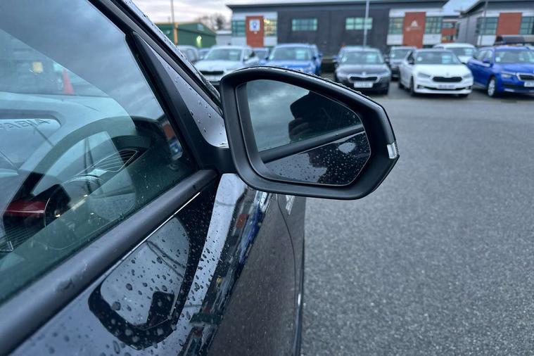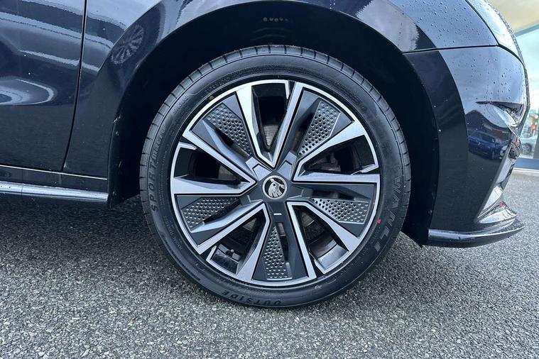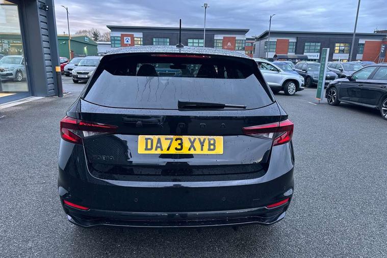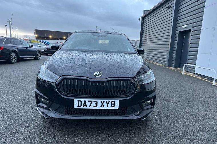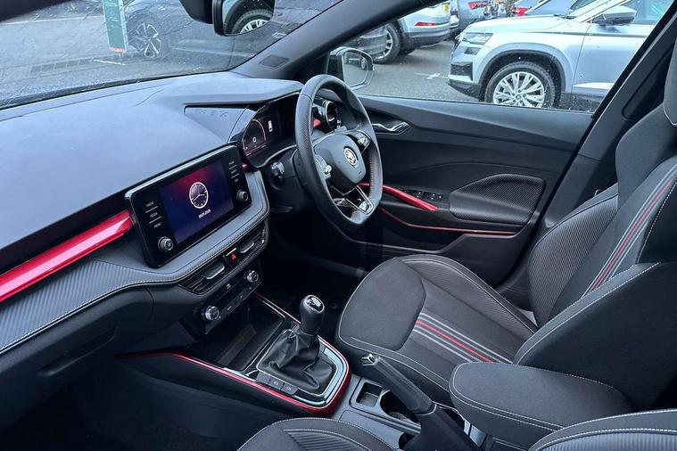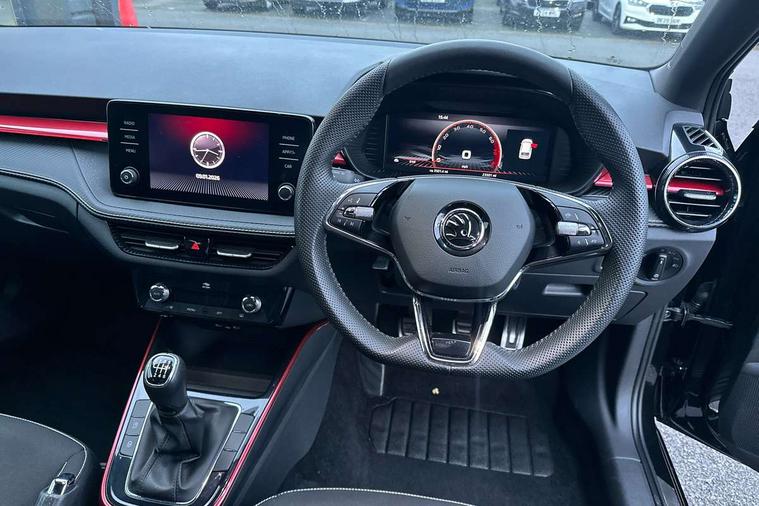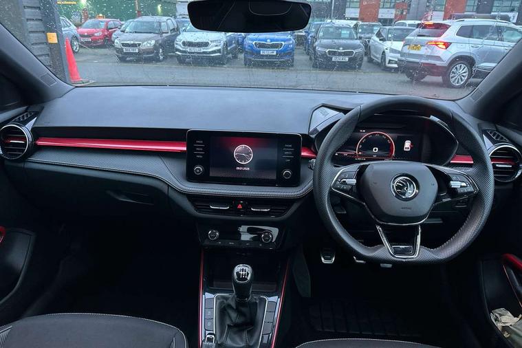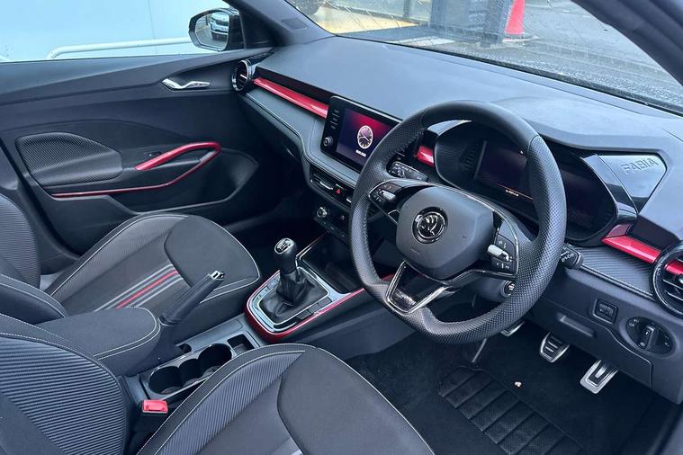 Bluetooth connection, Driver alert system - DAS, Electromechanical power steering, Exterior temperature gauge, Service interval indicator, 2x USB-C in the front (for data transmission and charging), 6 Speakers (4 in front and 2 in rear), Auxiliary socket for external MP3 player, Bolero radio with 8" colour display, DAB digital radio reception, Auto dimming rear view mirror, Basic LED Headlights, Black radiator grille, Body coloured bumpers, Door mirror integrated indicators, Electrically adjustable and heated door mirrors, Front and rear electric windows, Front fog lights, Front window wiper intermittent control, Headlight range control - Automatic, Ice scraper in fuel cap, LED daytime running lights with coming and leaving home feature, Monte Carlo badging, Privacy glass, Rain sensor, Rear LED fog light, Rear side wing doors, Rear window wiper with washing nozzles, Roof mounted spoiler, SKODA tailgate lettering in black, Sports bumpers, Third brake light, 3 rear headrests, Aluminium pedals, Backrest split and folding, Black headlining, Central console with removable cup holder and storage box, Chrome handbrake release button, Door sills with fabia badging, Fabric/artificial leather upholstery, Front centre armrest, Front sports seats, Gearshift knob/handle in leather, Hand brake lever handle in leather, Height adjustable front headrests, Height adjustable front seats, Height adjustable steering wheel, ISOFIX and TopTether anchorage points to the outer rear seats, ISOFIX and TopTether on the front passenger seat, Luggage compartment lighting, Metallic painted red central console cover, Metallic red interior door handles, Pollen filter, Rear seat bench unsplit, Single front passenger seat, Sun visors with mirror and airbag label on passenger side, Textile floor mats, Ticket holder, Umbrella in drivers door, 3-point height adjustable front seats belts with pretensioner and force limiter, Automatic warning lights in case of crash, Driver and passengers airbag with switch off function, e-Call+, ESC including ABS, MSR, ASR, EDS, HBA and XDS, Front and rear seat belt warning, FRONT ASSIST (AEB City and AEB Inter Urban), Front side airbags, Head airbags, One tone horn, Pedestrian protection, Three rear 3-points safety seat belts with pretensioner and force limiter including stop function for outer rear seat belts, Tyre pressure monitoring system, Anti-theft alarm system including immobiliser, interior monitoring, backup horn, and towing protection, Central locking with radio remote control, interior controls, SAFE function and 2 foldable keys, KESSY - Keyless engine start/stop, Carbon effect door and side trim panels, Carbon effect lower decorative trim with white stitching, Red metallic upper decorative trim, Anti-theft wheel bolts protection, Super-low rolling resistance tyres,