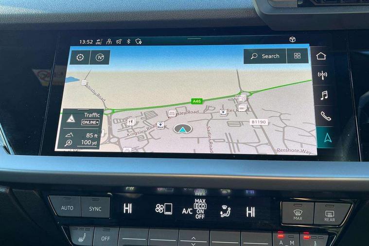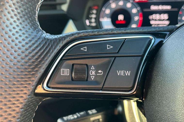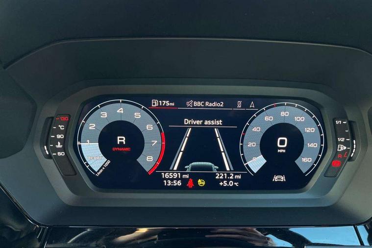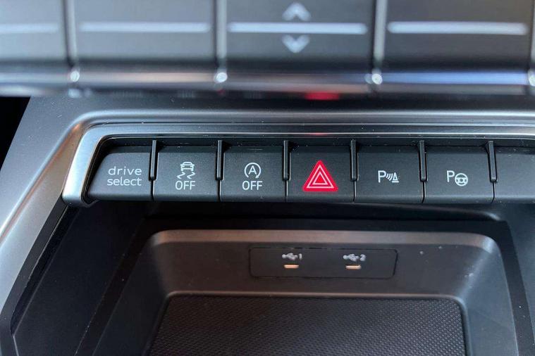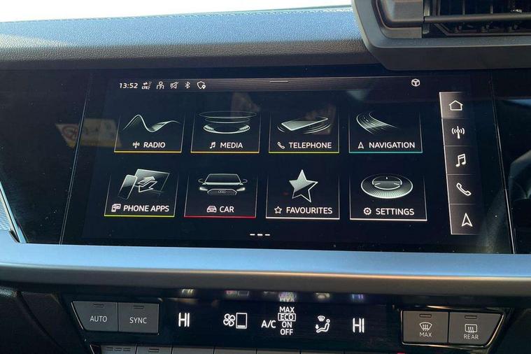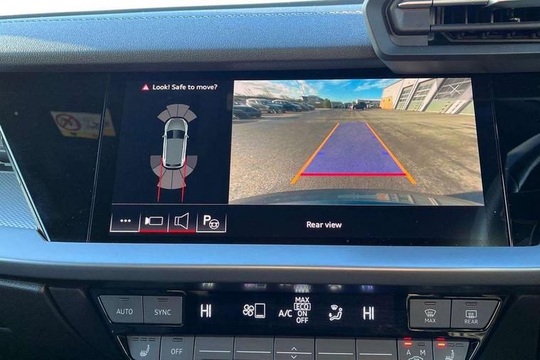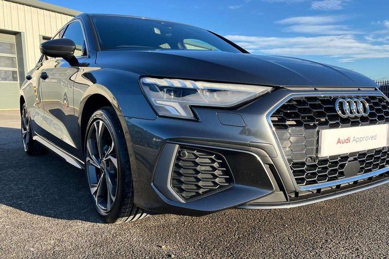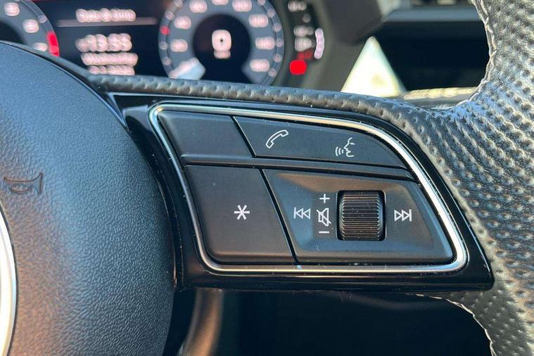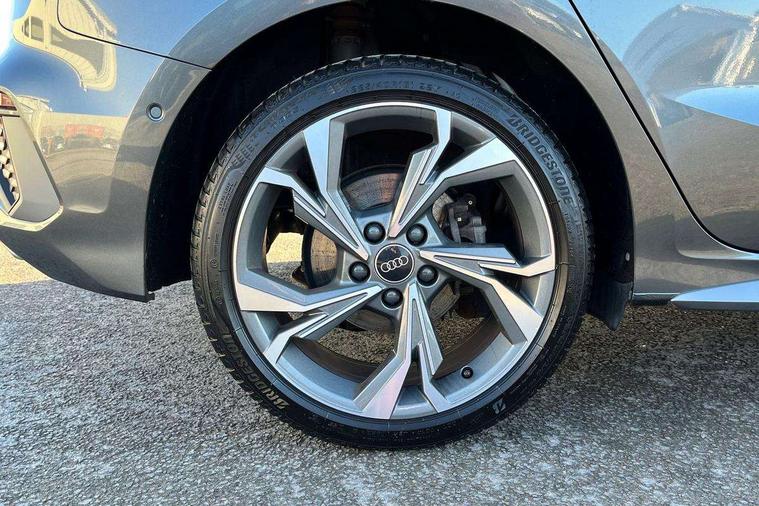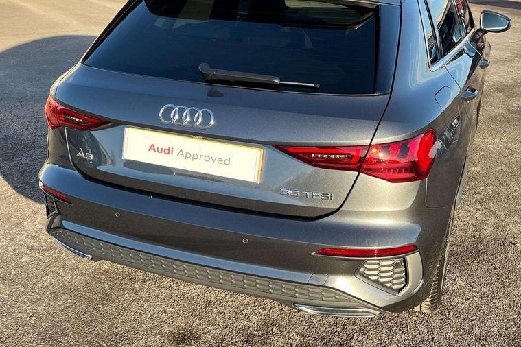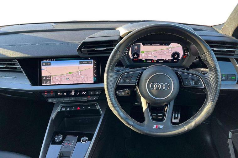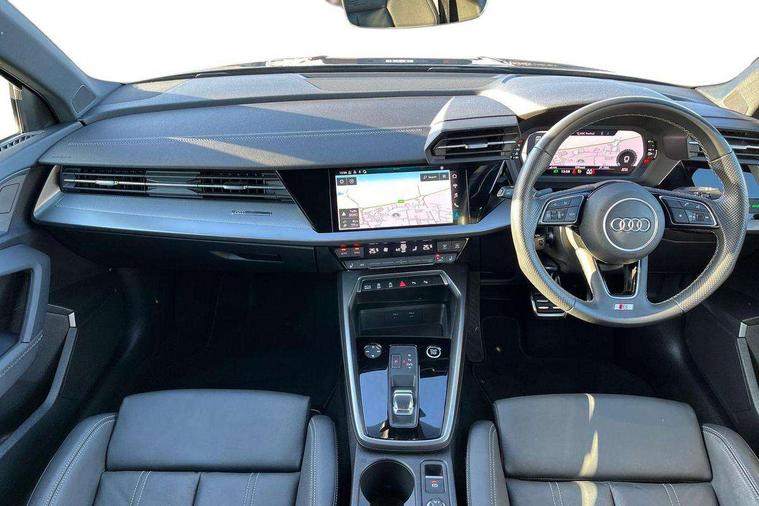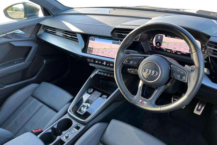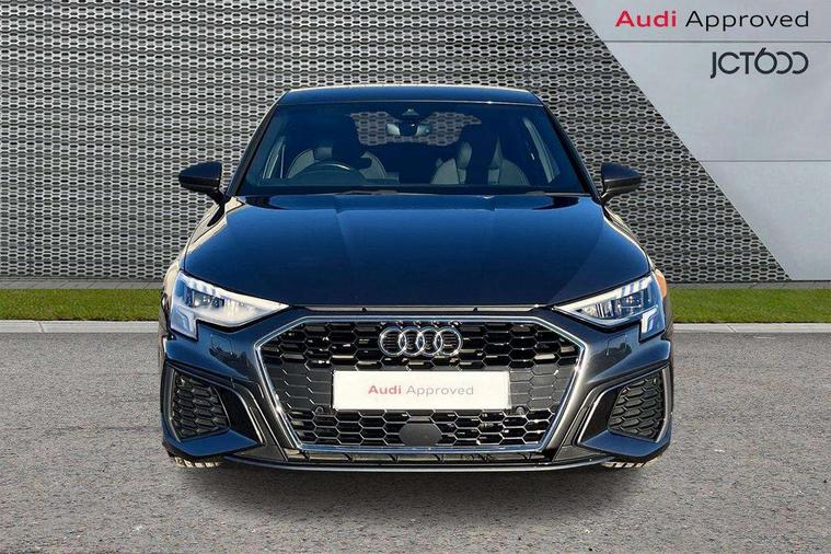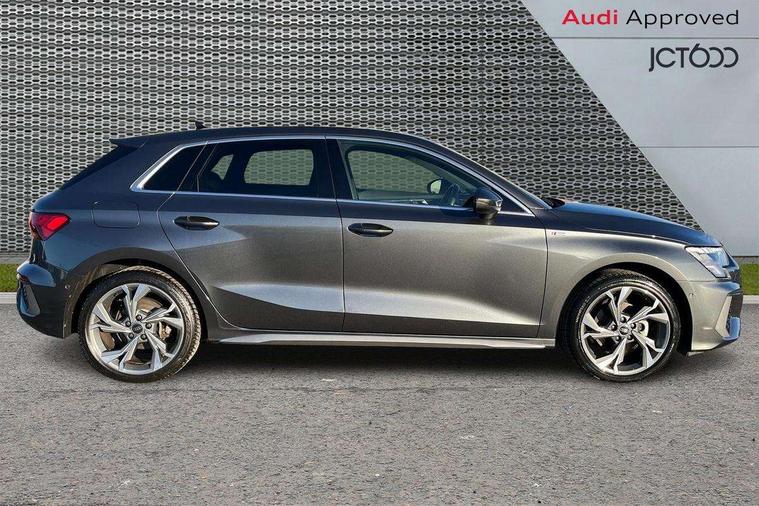 Audi drive select (Auto, Comfort, Dynamic, Efficiency and Individual), Audi smartphone interface, Audi Virtual Cockpit - 10.25" digital and colour instrument cluster, Automatic start/stop system with recuperation, Bluetooth interface, Collision avoidance assistant, e-Call (emergency call), Electromechanical power speed sensitive steering, Lane departure warning system, MMI Navigation Plus with high resolution 10.1" colour touch screen display, Service indicator, Trip computer, Voice control system with natural language interaction, Sports suspension, 2xUSB-C connection with data and charging functions, 6 passive loudspeakers, DAB Digital radio, 3rd brake light, Acoustic glass windscreen, Aluminium window trim, Auto dimming frameless rear view mirror, Body colour exterior mirrors, Electrically adjustable/heated/folding/auto dimming door mirrors with integrated LED indications + kerb view function for passenger side, Front electric windows, Illuminated aluminium inserts front door sills with S logo, LED daytime running lights, LED headlights with LED rear lights and dynamic rear indicators, Light and rain sensors, Privacy glass - dark tinted rear window, rear door and side windows, Rear electric windows, Rear side air outlets in grained matt black, Rear side wing doors, Rear wiper, S line bumpers, S roof spoiler, 12V socket and storage compartment in front centre console, 3 seat bench in 2nd row, 3 spoke leather multifunction steering wheel with paddle shift, 4 way electrically adjustable lumbar support for driver and front passenger, 60/40 split folding rear seat bench, Black cloth headlining, Dual zone electronic climate control, Front and rear centre armrest in leather, Front and rear headrests, Front/rear floor mats, Height and reach adjustable steering wheel, Interior lighting - glove compartment light and right hand side, Luggage compartment floor covering, Manual boot compartment lid, Manually adjustable front seats, Seat side bolsters, Single front passenger seat, Stainless steel pedals and front footrest in black, Twin leather upholstery with front sports seats S embossed logo, Aluminium interior elements pack - A3 Sportback, LED interior lighting pack - A3 Sportback, S line styling pack - A3 Sportback, 3x3 point rear seat belts, Driver and front passenger airbag with passenger airbag deactivation, Electronic Stabilisation Control (ESC) including ABS, ASR and EDL, First aid kit with warning triangle and 2 safety vests, Front side airbags with head airbags and interaction airbag, Pre-sense front with pedestrian and cyclist detection, Seatbelt monitoring, Tyre pressure loss indicator, Anti theft alarm, Anti-theft wheel bolts, Electronically operated child lock, Immobiliser, Remote control central locking, Dark spectrum aluminium inlays, accent surfaces in the dashboard and centre console in platinum grey silk effect paint finish,
