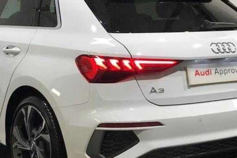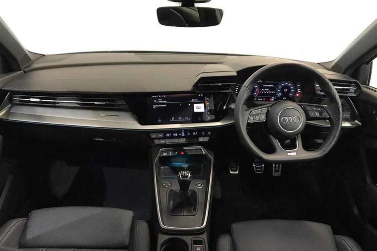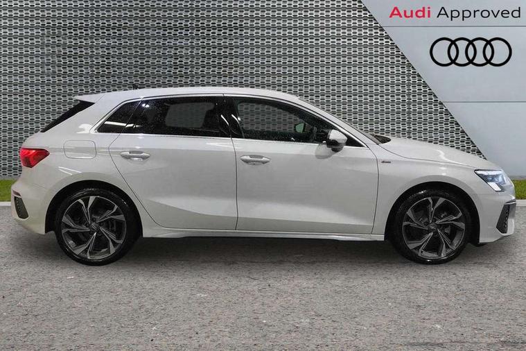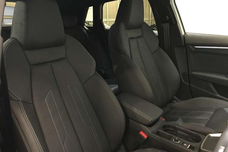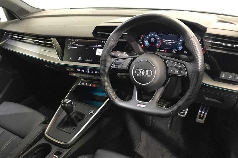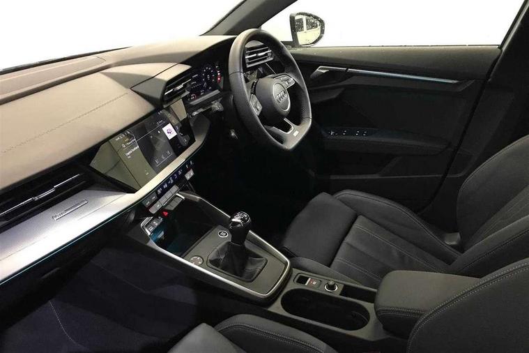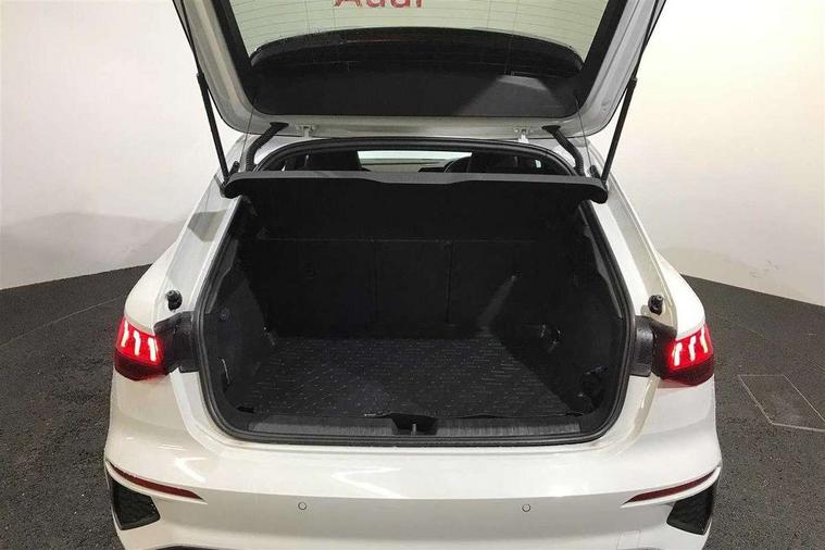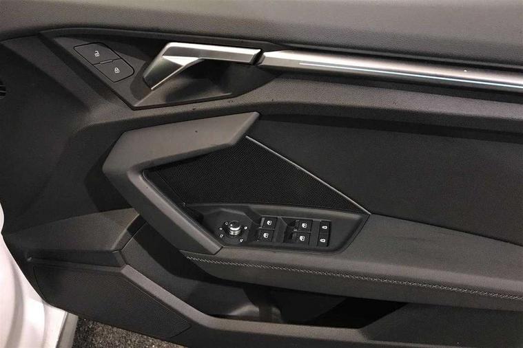 Audi drive select (Auto, Comfort, Dynamic, Efficiency and Individual), Audi smartphone interface, Audi Virtual Cockpit - 10.25" digital and colour instrument cluster, Automatic start/stop system with recuperation, Bluetooth interface, Collision avoidance assistant, Cruise control, e-Call (emergency call), Electromechanical power speed sensitive steering, Lane departure warning system, MMI Navigation Plus with high resolution 10.1" colour touch screen display, Rear parking sensors, Service indicator, Trip computer, Voice control system with natural language interaction, 2xUSB-C connection with data and charging functions, 6 passive loudspeakers, DAB Digital radio, 3rd brake light, Acoustic glass windscreen, Aluminium window trim, Auto dimming frameless rear view mirror, Electrically adjustable/heated/folding/auto dimming door mirrors with integrated LED indications + kerb view function for passenger side, Front electric windows, Illuminated aluminium inserts front door sills with S logo, LED daytime running lights, LED headlights with LED rear lights and dynamic rear indicators, Light and rain sensors, Privacy glass - dark tinted rear window, rear door and side windows, Rear electric windows, Rear side air outlets in grained matt black, Rear side wing doors, Rear wiper, S line bumpers, S roof spoiler, 12V socket and storage compartment in front centre console, 3 seat bench in 2nd row, 40/20/40 split folding rear seat bench with cupholder, Black cloth headlining, Dual zone electronic climate control, Front and rear centre armrest in leather, Front and rear headrests, Front/rear floor mats, Height and reach adjustable steering wheel, Illuminated vanity mirror, Interior lighting - glove compartment light and right hand side, Luggage compartment floor covering, Manual boot compartment lid, Manually adjustable front seats, Seat side bolsters, Single front passenger seat, Stainless steel pedals and front footrest in black, Twin leather upholstery with front sports seats S embossed logo, Aluminium interior elements pack - A3 Sportback, S line styling pack - A3 Sportback, 3x3 point rear seat belts, Audi pre sense front, Driver and front passenger airbag with passenger airbag deactivation, Electronic Stabilisation Control (ESC) including ABS, ASR and EDL, First aid kit with warning triangle and 2 safety vests, Front side airbags with head airbags and interaction airbag, Pre-sense front with pedestrian and cyclist detection, Seatbelt monitoring, Tyre pressure loss indicator, Anti theft alarm, Anti-theft wheel bolts, Immobiliser, Manual child locks, Remote control central locking, Accent surfaces in the dashboard and centre console in platinum grey silk effect paint finish, Dark spectrum aluminium inlays,
