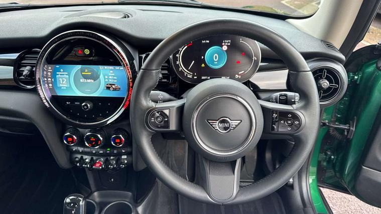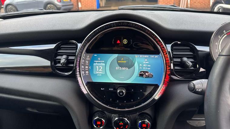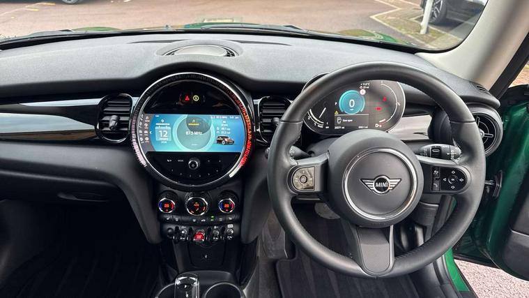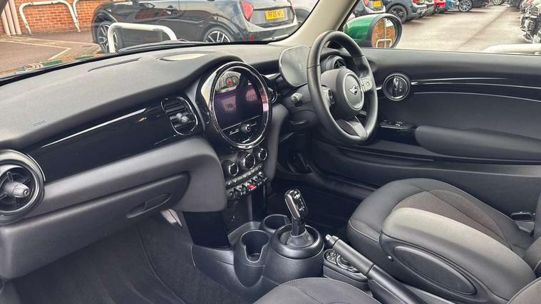 Apple CarPlay, Automatic start/stop function with brake energy recuperation, Compatible mobile phone bluetooth with audio streaming, Cruise control with brake assist, Electro-mechanical speed dependant steering assistance, Flexible car sharing preparation, Instrument cluster, Mini E-call, MINI TeleServices, On board computer, Service interval indicator, Double Vanos system, Fully variable valve control, High precision injection, Performance Control, Steptronic transmission with double clutch, 8.8" touchscreen with LED ring, FM tuner and DAB digital radio, 3rd brake light, Automatic headlight activation switch, Body colour fuel filler cap, Chrome border high gloss black slats radiator grille, Dynamic brake lights, Electric front windows, Exhaust tailpipe on left with chrome finisher, Heated rear window, Heated windscreen washer jets, LED headlight with closed ring and daytime driving lights, Metal door sill strips with MINI imprint, Model logo Cooper on right of tailgate, Rain sensor window wipers, Rear fog lights, Rear LED lights with union jack design, Rear window wiper, Side scuttle panel with integrated indicator, Sun/heat protection glass, White indicator lenses, 12V Accessory socket in centre console, 2 seat bench in 2nd row, 4 lashing eyes in luggage compartment, 60/40 split folding rear seat, Ambient lighting, Carbon black colour line - Knee roll and door armrest, Chrome interior highlights, Cupholders, Front and rear head restraints, Front and rear isofix with front passenger airbag deactivation, Front floor mats in velour, Glove compartment, Height and length steering column adjustment, Interior lighting with 12 different colours across the dashboard, underneath door bezel with illuminated laser-engraved design on central display, Leatherette gearshift lever and handbrake gaiters, LED reading lights, vanity mirror lights, front foot well light and spotlight on front seats, Manual air conditioning, Mechanical seat adjustment - forward/back & backrest for front seats and driver seat height adjust, Multifunction steering wheel, Passenger seat height adjuster, Satellite grey headlining including grab handles and clothes hooks, Single front passenger seat, Sport leather steering wheel with speed limiter and audio/communication controls, Storage compartments in doors, Sunvisors with vanity mirrors, 3 point seatbelts on all four seats, 6 Airbags - front, side, head and seat belt tensioners, Anti-lock braking system (ABS), DSC - Dynamic Stability Control, Front and rear disc brakes, Single tone fanfare horn, Tyre pressure monitoring system, Alarm system with tilt sensor, monitoring doors, bonnet interior and tailgate, Electronic vehicle immobiliser, Start/stop toggle with keyless go, Piano black interior trim, Tool kit, Tyre repair kit,