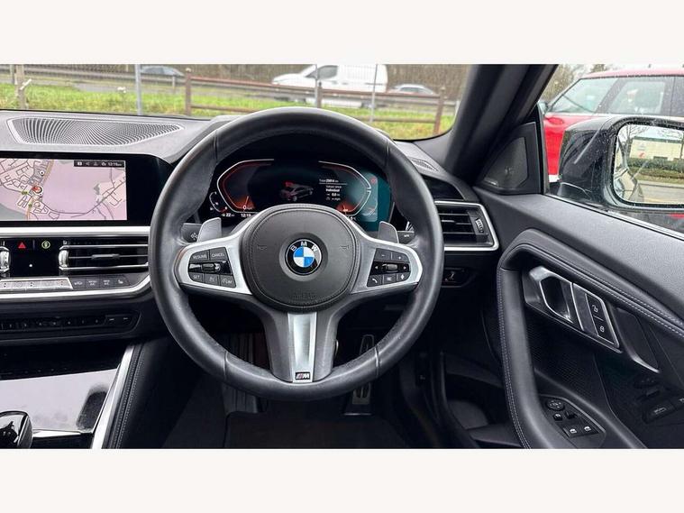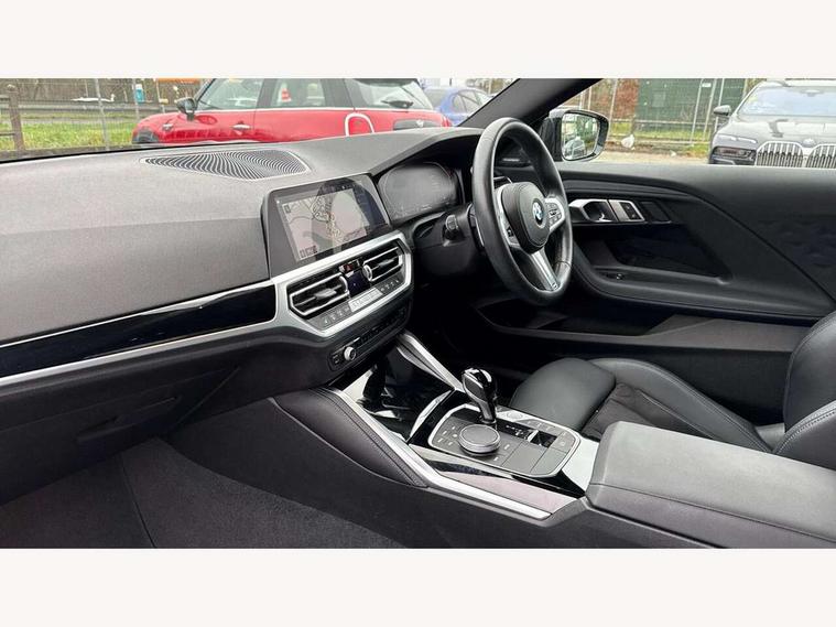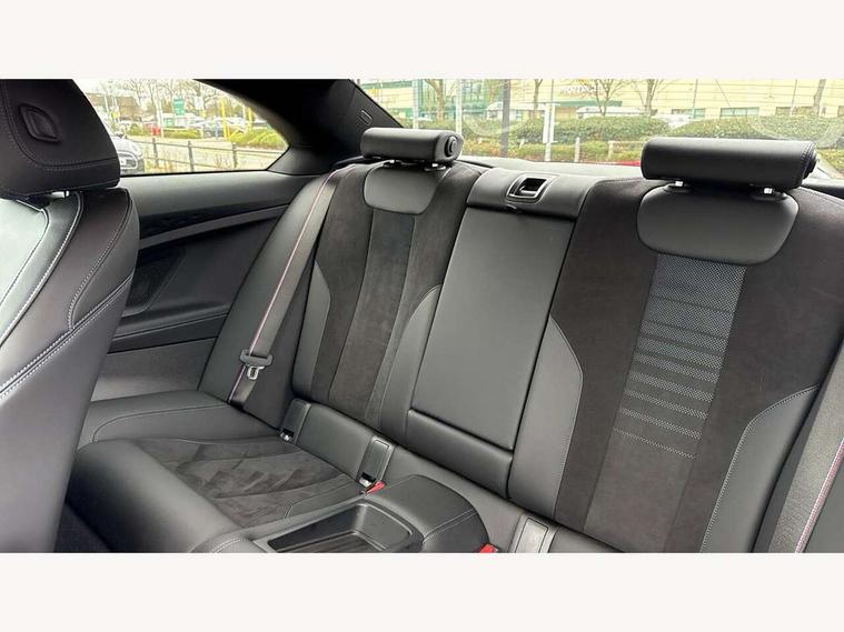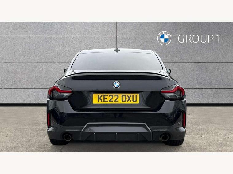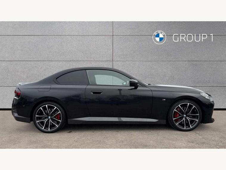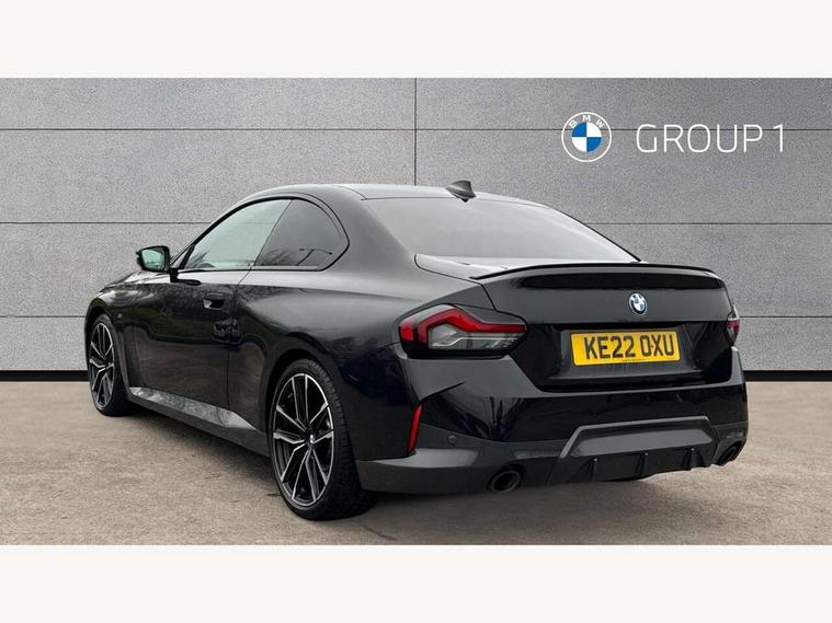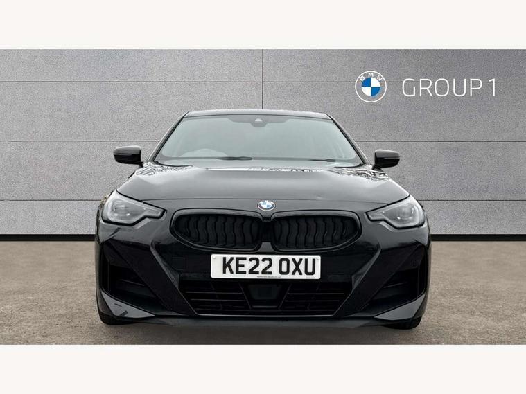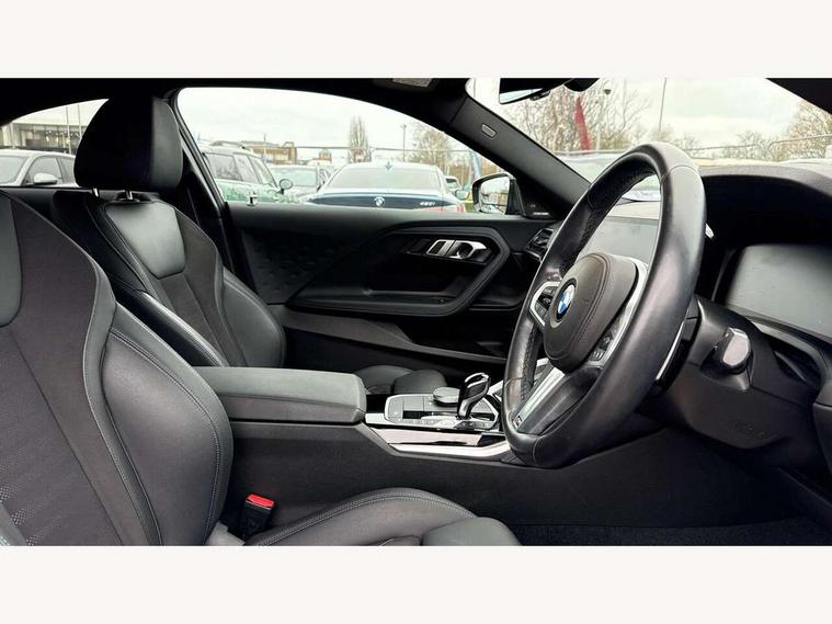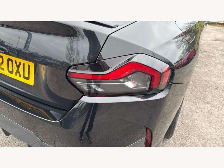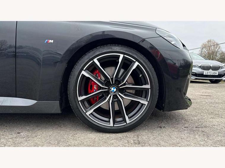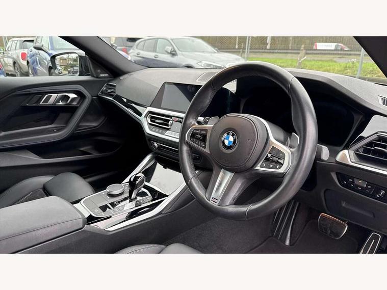 Attentiveness assist, Auto start-stop, Bluetooth, BMW ConnectedDrive online services, BMW Teleservices, Check Control warning system for monitoring of lights and door/luggage compartment open warning, Direct selection buttons, Drive off assistant, Eco pro mode, Electric power steering, Front/rear Parking distance control, iDrive controller with turn and press function, Integrated owners handbook, Intelligent functions, Live cockpit plus with nav function 12.3" instrument cluster and 14.9" centre display, Oil sensor for level and grade, Optimum shift indicator, Personal Profile, Touch operation on control display, Variable sport steering, Widescreen multi-media display, Aluminium lightweight construction, Balancer shaft, BMW TwinPower Turbo four-cylinder petrol engine, Double VANOS, Drive performance control with ECO PRO comfort + sport mode, Electronic differential lock, High precision injection, M sport suspension, Petrol Particulate Filter, Sport automatic steptronic transmission with gearshift paddles, manual gearshift time display, launch control, coasting idle ECO PRO/COMFORT modes, Twin scroll turbocharger with Valvetronic, DAB tuner, Acoustic windscreen wipers for reduced driving noise, Adaptive LED Headlights, Automatic windscreen wipers and automatic headlight, Automatically dimming rear view mirror, Body colour door handles flush with door surface, Body colour door mirrors, Body colour front and rear bumpers, Daytime running lights, Electric windows - front and rear, with open/close fingertip control and trap release, Exhaust tailpipes x2 - 90mm in left and right, Fading support, Front and rear bumper system with replaceable deformation elements, Front door sill finishers in black plastic with BMW designation, Front windscreen wipers with integrated washer jets, Green tinted heat protection glazing, High beam assistant, High gloss shadowline exterior trim in mirror triangle cover, mirror cover panel, mirror bezel and window border, High level third brake light, Indicators integrated int mirror housing, LED registration plate light, LED technology rear tail lights, brake lights and turn indicators, Lightweight engineering, Model designation on right side of tailgate, One piece kidney grille with hight gloss chrome surround, Rear boot, Rear fog lights, Reversing light in rear light cluster, Shark fin antenna, Single part LED rear lights with smoked glass components, Trailer stabilisation logic, Visible VIN plate, 12V power socket in front centre console with blanking plug, 2 cupholders in front centre console, 3 zone automatic air conditioning, Ambient lighting, Compartment in front of cupholder, Conditioned based service, Driver seat backrest width adjustment, Front and rear side armrests integrated into door trim, Front armrest, Front door pockets, Front head restraints, Front sport seats, Heated front seats, Illuminated glove compartment with separate small compartment, M headliner Anthracite, M sport leather steering wheel, Manually adjustment steering wheel column, Rear seat backrest with manual 40:20:40 split folding, Rear seat centre foldable armrest with integrated cup holder, Single front passenger seat, Storage compartment between rear seats, Storage tray and compartment with cover in centre console, Sun visors with vanity mirrors and insert tab, Through loading system with 40/20/40 split folding 2 rear seat in 2nd row, Two folding rear seat headrests, Velour floor mats, Additional storage compartment pack without USB - 2 Series Coupe, Connected pack professional - 2 Series Coupe, Interior and exterior mirror pack - 2 Series Coupe, M Sport exterior styling aerodynamics pack - 2 Series Coupe, 2 tone horn, Anti lock braking system (ABS) with cornering brake control, Automatic Stability Control (ASC), BMW emergency call, Brake drying, Child seat ISOFIX attachment for the two outer rear seats, Crash sensor activating of airbags, Unlocking doors, hazard warning lights, interior light, safety battery terminal, Deactivation of fuel pump in the event of a crash, Driver and front passenger airbags, Driver and front passenger side airbags, integrated in the door side seat backrest bolsters for all seat variants, Dynamic brake control, Dynamic stability control + (DSC+), Dynamic Traction Control - DTC, Electrically operated hand brake including automatic hold function and automatic release when driving off, Front and rear disc brakes, Front passenger airbag deactivation, Head airbags for all 4 outer seats, Manual deactivation of front passenger airbag, Seat belt security check for driver and front passenger, Seatbelt warning, Side impact protection, Three point seat belts on 4 seats including front belt stopper, pyrotechnic belt tensioners and belt force limiters, Tyre pressure sensor, Warning triangle and first aid kit, Alarm system (Thatcham 1) with remote control and electronic engine immobiliser, Central locking switch for all doors, fuel filler cap and luggage compartment, Deadlocking function system to all doors, Drive away locking system on all doors and luggage compartment, Locking wheel bolts, Start/Stop button (illuminated) in centre console with keyless engine start and Auto Start-Stop deactivation button, Two remote control key with integrated key - one button for open and close doors/fuel flap/tailgate and separate button for unlock luggage compartment, BMW mobility tyre sealing system, Electrically powered 12V compressor, Reduced rolling resistance tyres,
