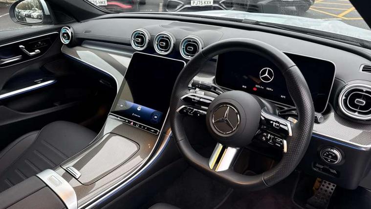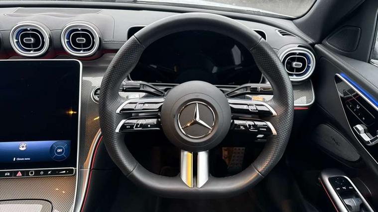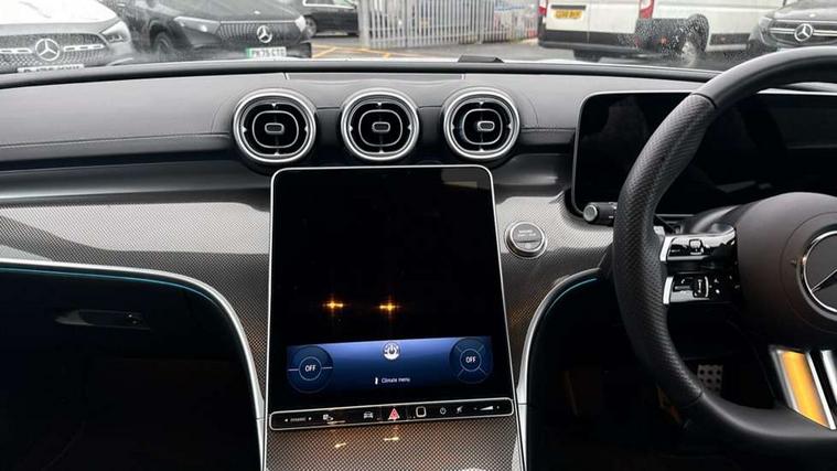 11.9" high resolution multimedia colour display, 12.3" digital instrument cluster display, Active lane keeping assist, Active parking assist with PARKTRONIC, Attention assist, Blind spot assist, Cruise control with speedtronic variable speed limiter, DYNAMIC SELECT with a choice of driving modes (Comfort, ECO, Sport, Sport+, Individual), E-call, Extended MBUX functions, Finger print sensor, Fluorescent jacket for driver, Hard disc navigation, MBUX navigation premium, Mercedes me remote services, Outside temperature gauge, Service indicator (ASSYST), Smartphone integration, Sports direct steer speed sensitive steering, Status display for rear seat belts in instrument cluster, Traffic sign assist, Wireless charging system for mobile devices, 66 litre fuel tank, 9G TRONIC 9 speed automatic transmission, Petrol Particulate Filter, Sport suspension, DAB Digital radio, MBUX multimedia system, Adaptive brake lights, Adaptive high beam assist, AMG body styling front apron, rear apron and side skirts, AMG Line exterior, Body coloured bumpers, Body coloured door mirrors, Electric windows with one touch opening/closing and obstruction sensors, Electrically adjustable and heated door mirrors, Heat insulating dark tinted glass, LED daytime running lights, LED high performance headlamps, LED Indicators, LED tail lights, LED third brake light, Radiator diamond grille with integrated Mercedes Benz star with chrome pins, Rain sensor with automatic windscreen wiper activation, Rear boot, Rear side wing doors, Two visible exhaust pipes integrated into rear bumper, 3 seat bench in 2nd row, 40:20:40 split folding rear bench seat, Ambient lighting premium, Ambient lighting with projection of brand logo, AMG floor mats, AMG line interior, Artico man-made leather upholstery, Auto Mercedes-Benz child seat recognition sensor, Black roof liner, Double cupholder in centre console, Electrically height/reach adjustable steering column, Folding rear seat backrest, Front and rear head restraints, Gearshift paddles on steering wheel, Heated front seats, Illuminated door sills with Mercedes Benz lettering, Illuminated glove compartment stowage, Multifunction sports steering wheel in nappa leather, Rear top tether child seat ISOFIX attachment, Single front passenger seat, Sports seats, Sunvisors with illuminated vanity mirrors, THERMATIC 2 zone automatic climate control, Interior light package - C Class, Memory package - C Class, Mirror package - C Class, Parking package with reversing camera - C Class, Stowage space pack - C Class, USB package plus - C Class, 3 rear 3 point seatbelts, Active bonnet pedestrian safety measure which detects an impact and raises bonnet, Active brake assist, Adaptive brake system with HOLD function and brake drying in the wet, Anti-lock braking system (ABS), Black seat belts, Brake calipers with Mercedes-Benz lettering + perforated front brake discs, Child proof door locks, Drivers knee airbag, Drivers pelvis airbag, Dual stage driver/passenger airbags, Electric parking brake, Electronic Stability Programme (ESP), Front centre airbag between driver and front passenger seats, Front side airbags, Tyre pressure monitoring system, Warning triangle and first aid kit, Window airbags for driver, front passenger and rear passenger, Antitheft alarm system, Interior monitoring system and Increased antitheft protection, Central locking with interior switch, automatic locking and crash sensor with emergency opening function, Chrome surround in electric key, Urban guard vehicle protection plus, Dashboard, instrument panel and beltlines in ARTICO man made leather in nappa look, Metal structure trim element with centre console in metal structure finish, 18" AMG 5 spoke light-alloy wheels painted in tantalite grey with high sheen finish, TIREFIT with tyre inflation compressor,