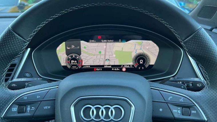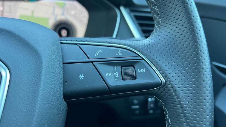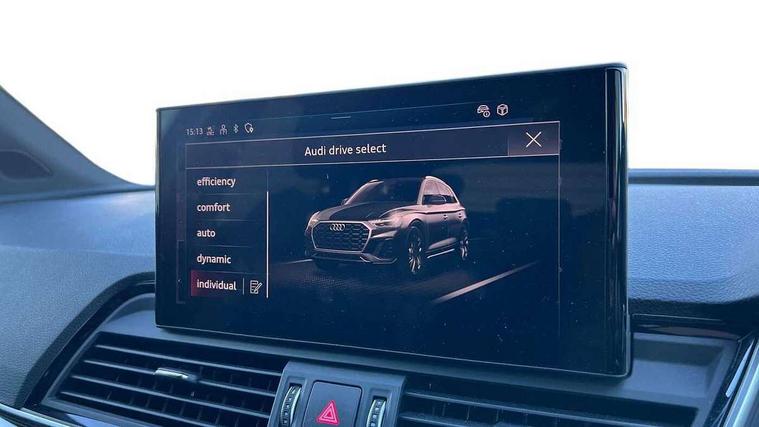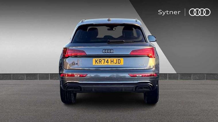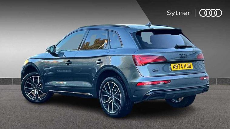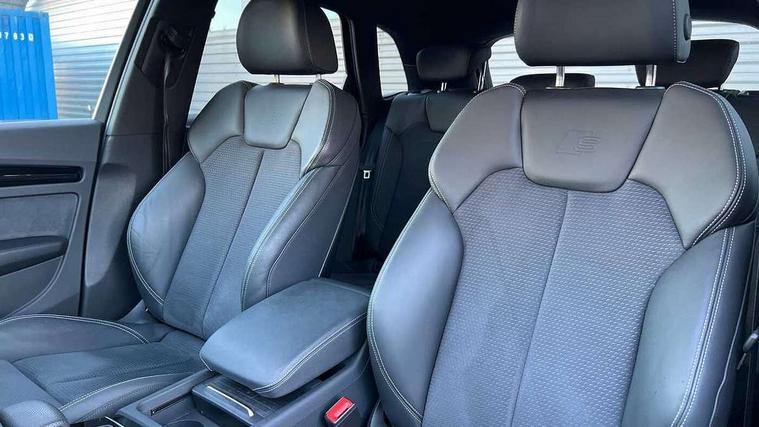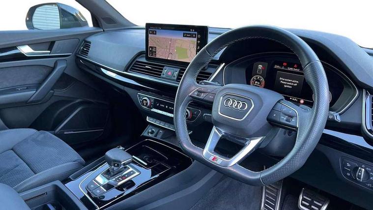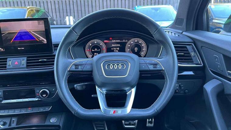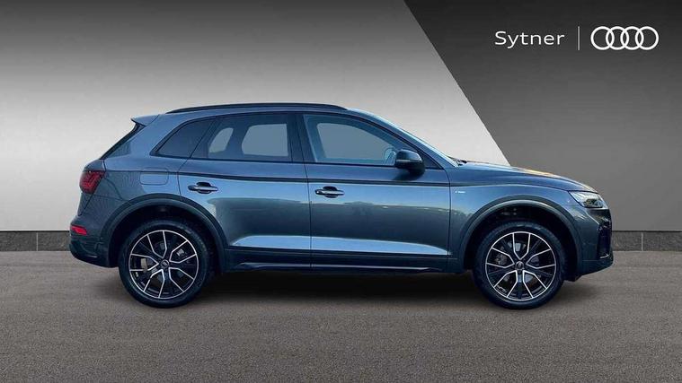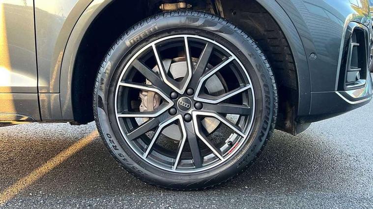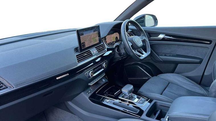 Acoustic front and rear parking sensor, Audi connect safety and service (e-call), Audi drive select, Audi virtual cockpit plus with 12.3" screen and three different layout designs, Audi wireless smartphone interface, Automatic start-stop system with coasting functionality and efficiency programme, Bluetooth interface, Camera based traffic sign recognition, Electro - mechanical power assisted steering, Lane departure warning, MMI navigation plus with 10.1" touch screen, Power tailgate, Reversing camera, Service interval indicator, Voice control system with Audi hotword activation "Hey Audi", Diesel particulate filter, Quattro on demand, S line sports suspension, 2 x USB charging port with aux input socket, 8 loudspeakers, DAB Digital radio, Acoustic windscreen, Auto dimming door mirrors, Auto dimming frameless rear view mirror, Automatic headlight adjustment, Automatic headlights and windscreen wipers, Black roof rails, Black styling with black rings, Body colour bumpers, Body colour rear diffuser with matt aluminium silver surrounds, Body colour underbody protection, Chrome plated exhaust trims, Daytime running lights, Door sills in Selenite silver, Electric adjustable/heated/folding door mirrors, Front air inlet surrounds in aluminium, Front and rear electric windows, Front radiator grille in honeycomb design, LED 3rd brake light, LED headlights and LED tail lights, Loading edge protection in stainless steel, Lower bumpers painted in contrast Manhattan grey, Rear chrome trim strip below lights, Rear privacy glass and rear side windows, Rear side wing doors, Rear wiper, Roof bars, S Line badges on the front wing panels, S Line front and rear bumpers, S Line rear spoiler, S Line side skirts, 3 rear headrests, Black cloth headlining, Comfort front centre armrest, Contrast stitching on seats, steering wheel and gear lever gaiter, Deluxe 3 zone electronic climate control, Front head restraints, Front sport seats with S embossed logo, Front/rear floor mats, Gear lever in black leather, Heated front seats, Height/reach adjustable steering column, Illuminated door sill trims with S logo, Luggage compartment cover, Manual seat adjustment with 4-way electric lumbar support, Single front passenger seat, Stainless steel pedals, Sunvisors with vanity mirrors, Top surface of the rear centre armrest in artificial leather, High gloss pack - Q5, LED interior light pack - Q5, 3 point seatbelts on all seats, 6 airbags - Driver, front passenger, curtain and side airbags, Attention and drowsiness assist, Electrically operated child locks on rear doors, Electromechanical parking brake, Electronic stabilisation control including ABS, ASR and EDL, First aid kit with warning triangle and vests, Front passenger airbag deactivation, Hill descent control, Hill hold assist, ISOFIX child seat mounting for front passenger seat and ISOFIX child seat mounting with Top Tether for outer rear seats, Multi collision brake assist, Pop-up bonnet for pedestrian protection, Pre sense city, Seatbelt monitoring, Tyre pressure warning, Anti theft alarm, Anti-theft wheel bolts, Remote central locking, Remote control key with SAFELOCK and keyless go, Air vents inserts and centre console in gloss black, Tool kit, Tyre repair kit,