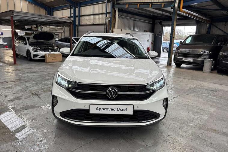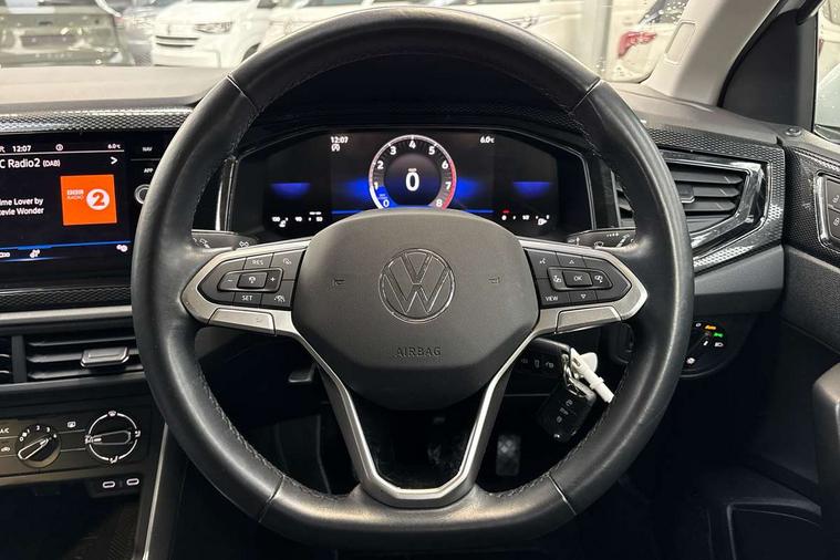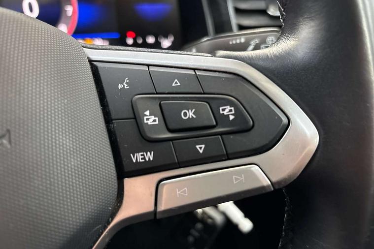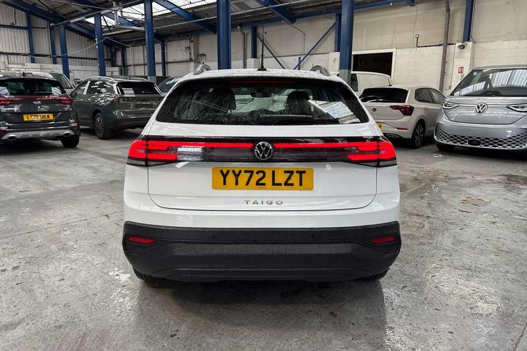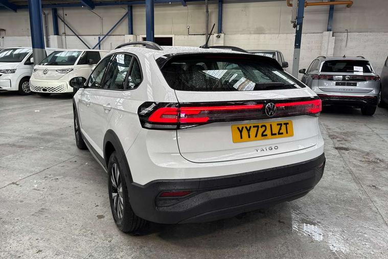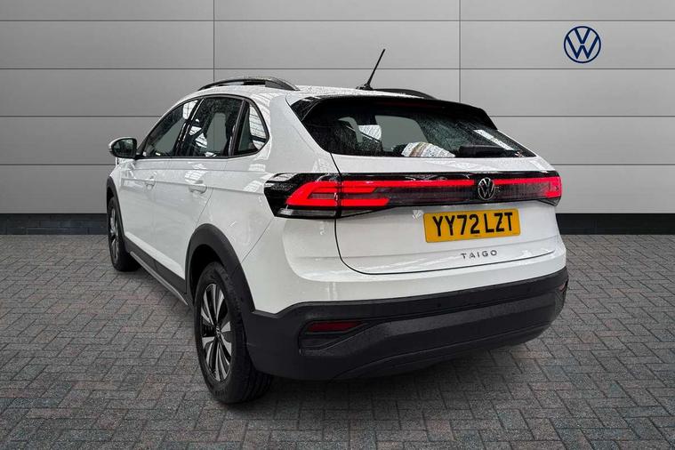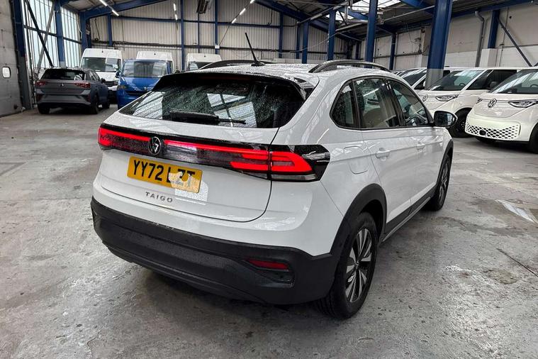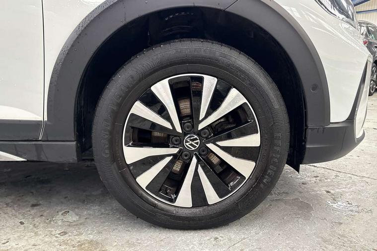 Driver alert system, e-Call (emergency call), Power Steering, Travel assist including emergency assist, Washer fluid level indicator, Wireless Charging including Bluetooth, Start-stop system with battery regeneration (recuperation - energy recovery during braking), WeConnect plus, Ambient lighting with logo projection, Aspherical driver's exterior mirror, Auto headlights, Body coloured bumpers, Body coloured exterior mirror housings and door handles, Electric windows, External USB type C socket and charging sockets, Front fog lamps with cornering function, Headlight range control, Heat insulating glass windscreen, LED headlamps, LED rear combination lamp, LED third brake light, Left convex exterior mirror, Power folding adjustable/heated exterior mirrors and front passenger exterior mirror lowering function, Rear fog light on one side, reversing light on both sides, Rear side wing doors, Rear wash/wipe with intermittent wipe setting, 'Slash/ Austin' Cloth upholstery, 12V socket in centre console, 2 front reading lights, 3 rear head restraints, 3 seat bench in 2nd row, Black carpets, Child seat anchor for child seat system i-Size, 2x top tether and child seat anchor in front on front passenger side, Door and side trim panels in titan black, Driver and front passenger seat height adjustment, Front centre armrest, Handbrake lever handle in leather, Height and reach adjustable steering wheel, Leather trimmed gear knob, Leather wrapped multifunction steering wheel, Luggage compartment floor, Luggage compartment light, Lumbar support for driver's and front passengers seat, Seat covers in titanium black, Single front passenger seat, Split folding backrest with centre armrest and unsplit rear seat bench, Storage compartment under front seats, Sun visors with illuminated vanity mirrors, Chrome Package - Taigo, Drivers assistance pack - Taigo, Light and Sight pack including High beam assist - Taigo, 2 x 3-point seatbelts/outer rear seats with ECE label, 3-point seat belts in front with pretensioner and height adjustment, 3-point seatbelt for centre rear seat, Driver and front passenger airbags with front passenger airbag de-activation, front side and curtain airbags, Driver and front passenger safety-optimised head restraints, Electronic stability control, Extended and predictive pedestrian/ cyclist protection, Front and rear disc brakes, Front curtain and side airbags with center airbag, Hill start assist, Manual rear child locks, Single tone horn, Tyre pressure loss indicator, Anti-theft alarm system with interior monitoring, backup horn, and towing protection, Anti-theft wheel bolts, Lava stone black gloss/matt decorative inserts in dash and front door panels, Low rolling resistance tyres,