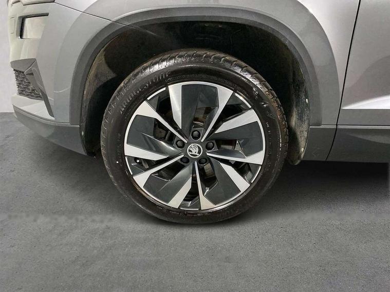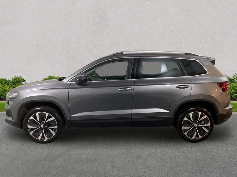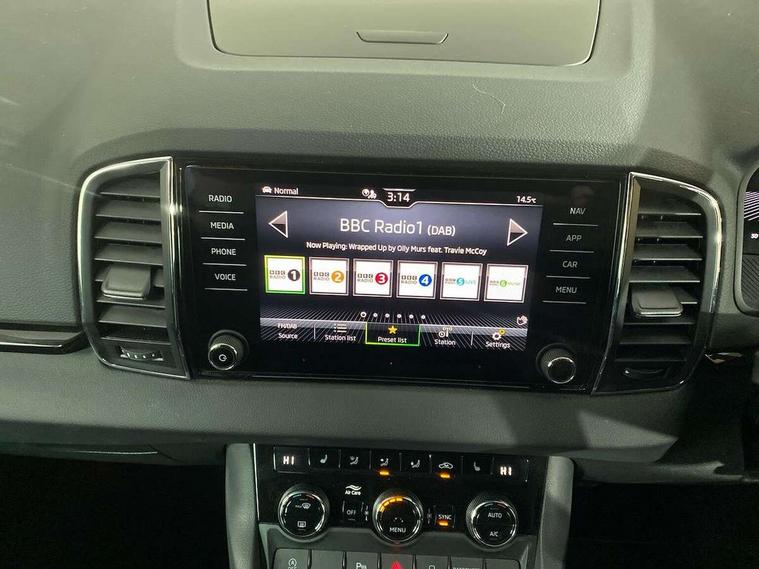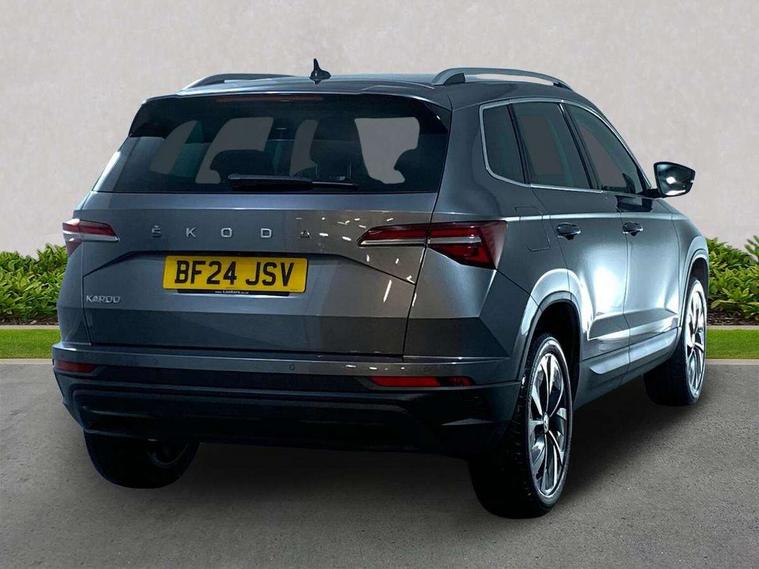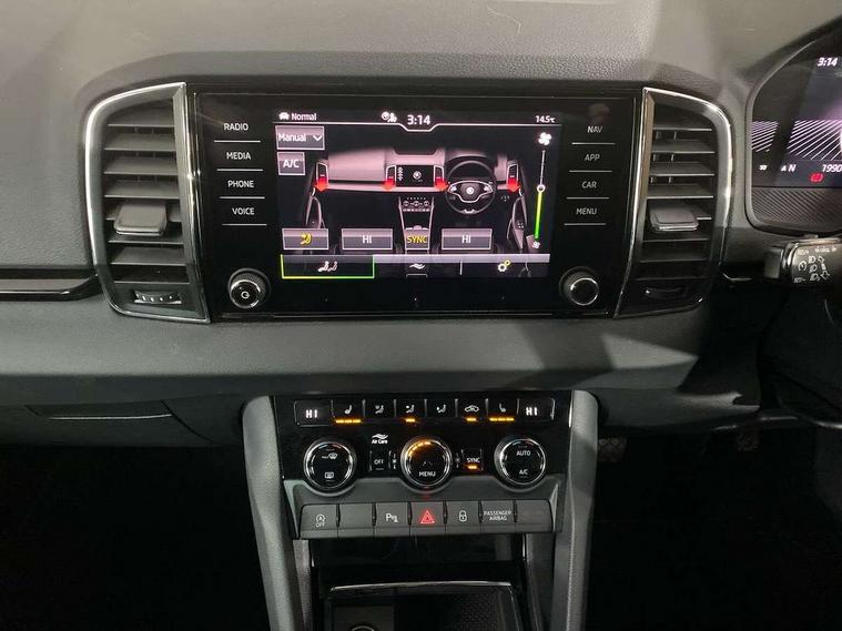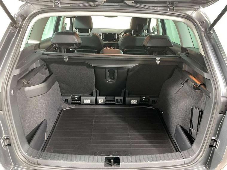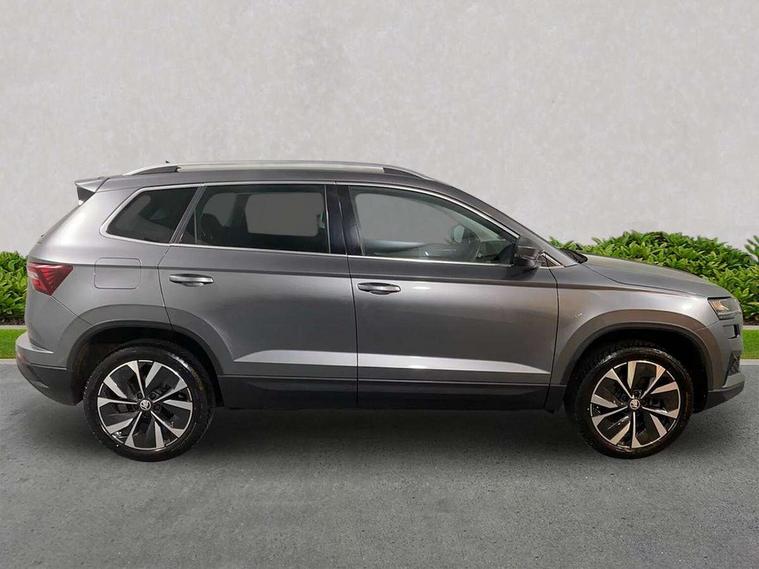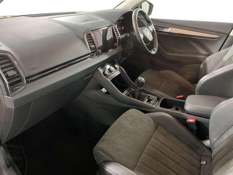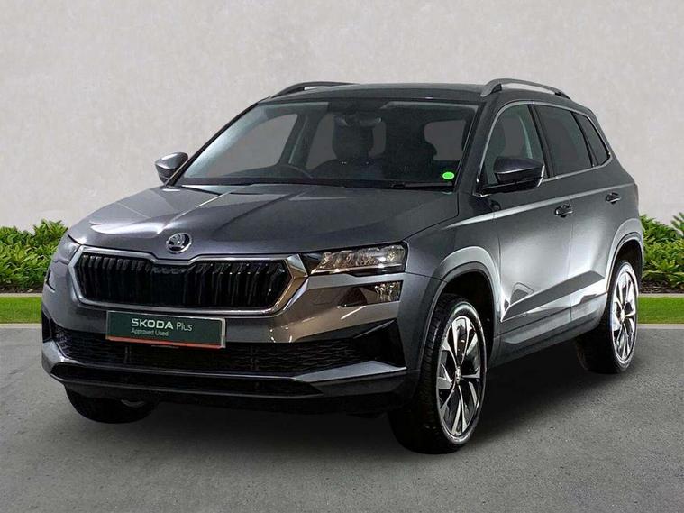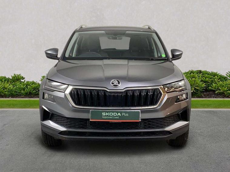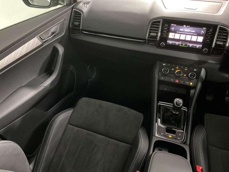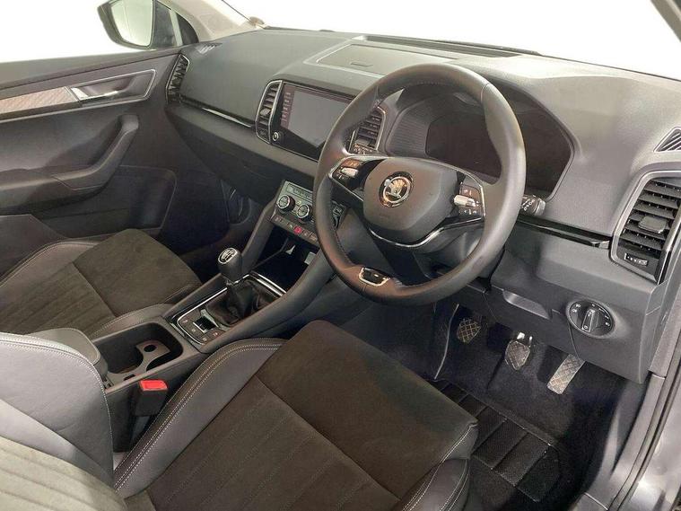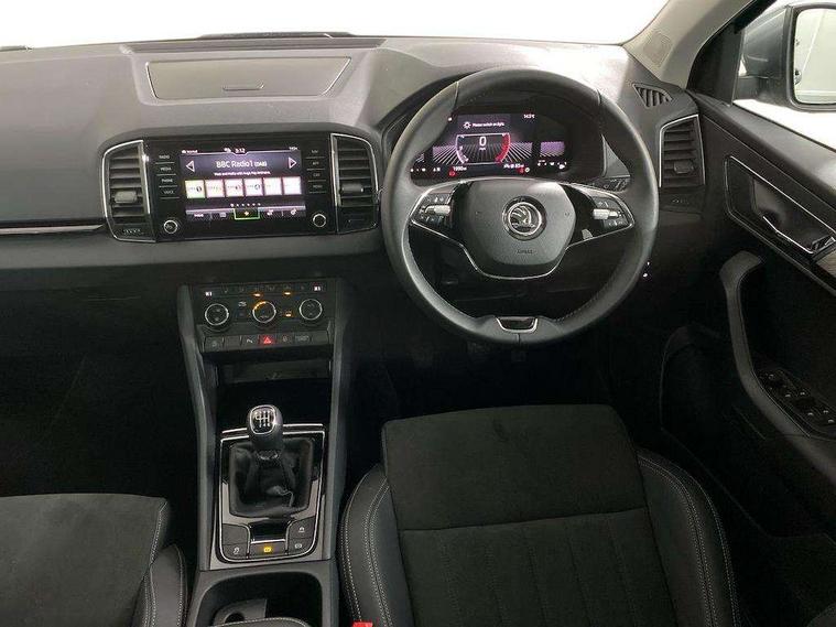 8" Digital display, Care connect, Driver fatigue sensor, Emergency services call system, Outside temperature gauge, Service interval indicator, SmartLink wireless for Apple and wired for Android, Start/stop system with regenerative braking, USB C Port x 2 in front centre console, 8 Speakers, DAB radio with Bluetooth, USB connection, Acoustic glass, Aero front windscreen wipers with intermittent function, Auto dimming rear view mirror with light and rain sensors, Black electric window control buttons, Body colour door mirrors and handles, Dynamic headlight range control with cornering light function, Electric front and rear windows with child proof lock, Heated rear windscreen, LED daytime running lights, LED rear lights with high functionality welcome effect and dynamic indicators, Light assistant (coming/leaving home/tunnel light), Plastic scuff plates, Privacy glass, Rear side wing doors, Rear spoiler, Rear window wiper with washer system and intermittent control, Safety reflectors on front doors, 1.5 litre bottle holders in driver and front passenger door panels, 12V socket in boot, 12v socket in front centre armrest with storage compartment and rear air vents, 2 spoke leather heated multifunction steering wheel, 2 x Tablet holder, 3 rear height adjustable headrests, 3 seat bench in 2nd row, 4 foldable roof handles with rear coat hooks, Black floor carpet, Chrome inner door handles, Double sided boot floor, Foldable hooks in the boot, Front head restraints, Height adjustable front three point seats belts with tensioners, Height/reach adjust steering wheel, Ice scraper, Illuminated glovebox, Illuminated luggage compartment, Isofix child seat preparation for front passenger seat, Isofix child seat preparation outer rear, Manual lumbar support for front seats, Pen holder, Pollen filter, Rear boot cover, Rear reading lights, Rubbish bin door, Safety vest holder, Single front passenger seat, Storage box in upper central dashboard closed, Sunvisors with illuminated vanity mirrors, Textile floor mats, Ticket holder, VarioFlex seats with standard rear seat release, Boot pack - Karoq, Design Pack - Karoq, Parking pack - Karoq, Automatic door unlocking in case of crash, Automatic fuel cut off in case of crash, Child locks on rear doors, Driver airbag, Electronic parking brake with auto hold function, Emergency rear braking signal, ESC including ABS, MSR, ASR, EDS, HBA, DSR, RBS, MKB and traction control, Front side airbags, Hill hold control, Knee airbags, Passenger airbag with switch-off function, Pedestrian monitor, Seatbelt reminder signalisation and pretensioner for all seats, Three point seatbelts rear, Two tone horn, Tyre pressure display, Tyre pressure monitor, Alarm with interior monitoring, back up horn and tilt sensor with safe function, Electronic engine immobiliser, Keyless entry and start/stop, Remote central locking with 2 remote folding keys, Chrome framed air vents, 18" Miran alloy wheels in black, Anti-theft wheel bolts protection, Tool kit,