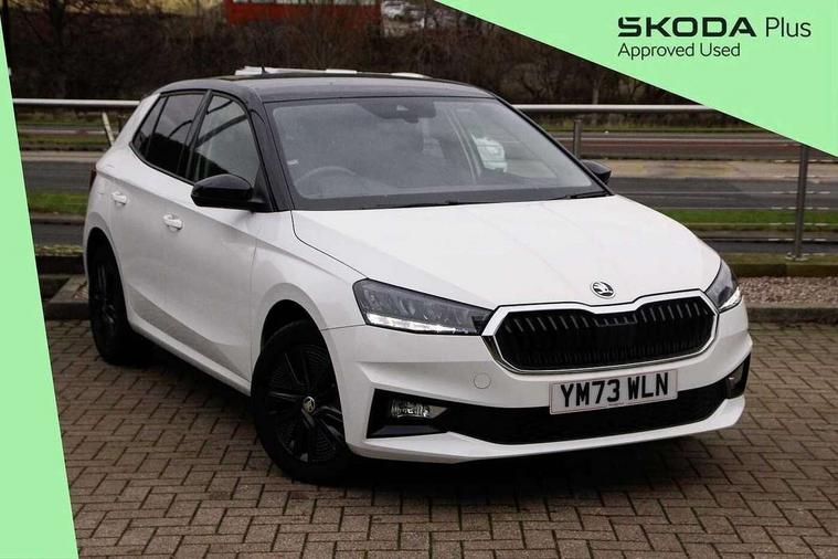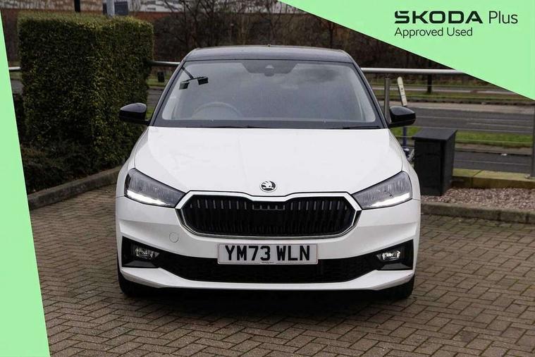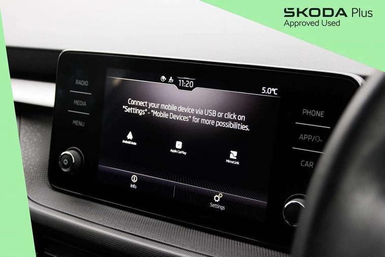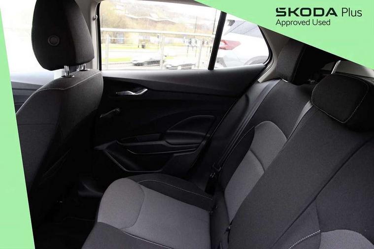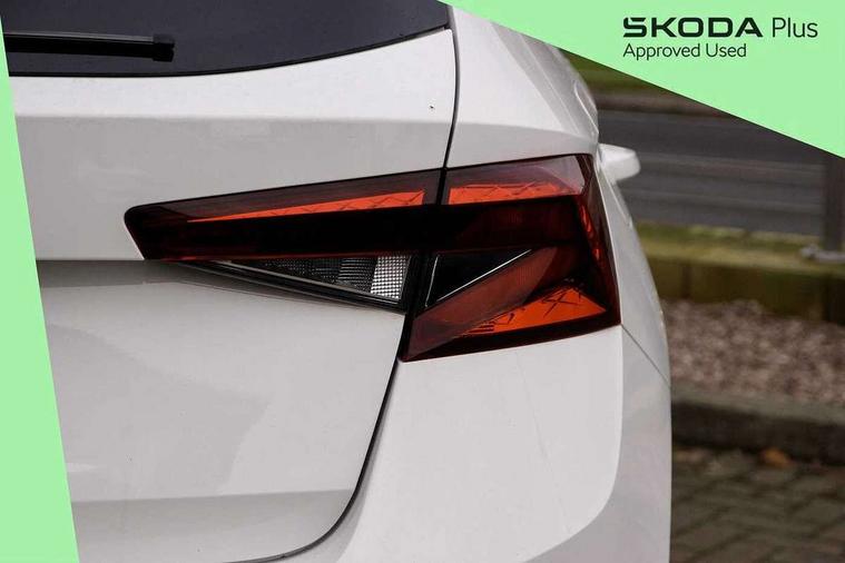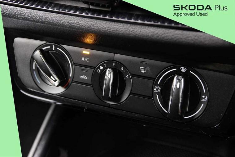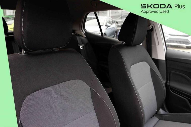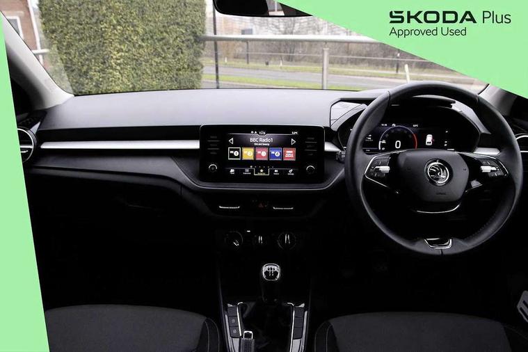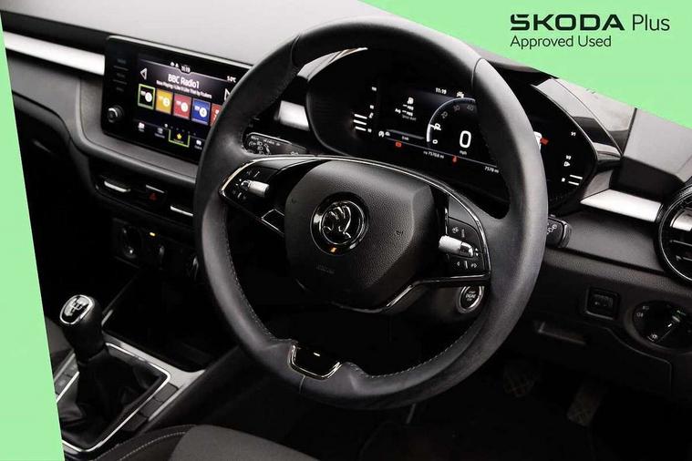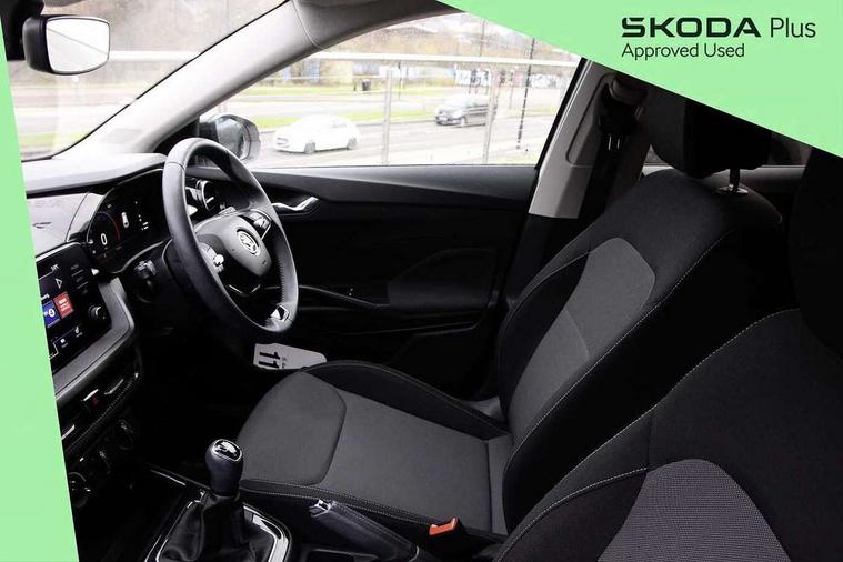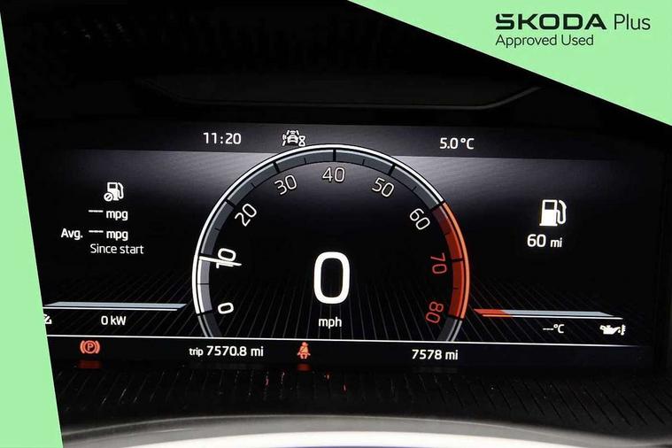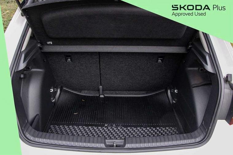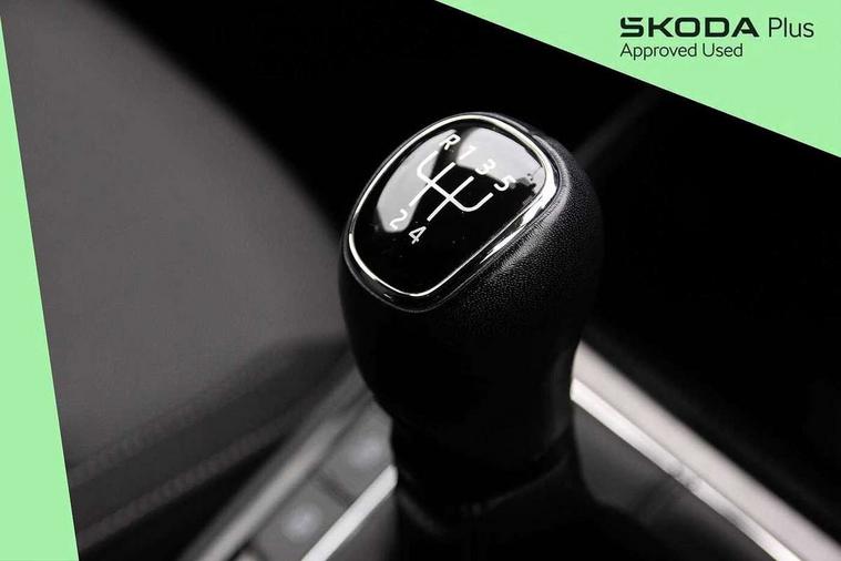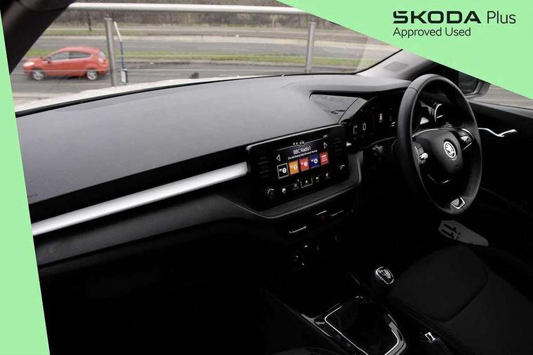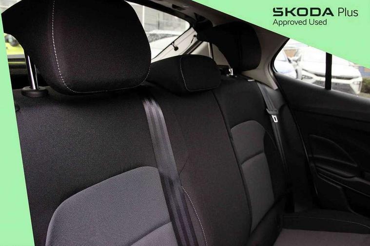 Bluetooth connection, Driver alert system - DAS, Electromechanical power steering, Exterior temperature gauge, Lane assist including road edge detection, Service interval indicator, Virtual cockpit with 10.25" colour display, 2x USB-C in the front (for data transmission and charging), 6 Speakers (4 in front and 2 in rear), Auxiliary socket for external MP3 player, Bolero radio with 8" colour display, DAB digital radio reception, Basic LED Headlights, Body coloured bumpers, Dimming rear view mirror with black frame, Door mirror integrated indicators, Electrically adjustable and heated door mirrors, Electrically adjustable front windows with function auto up/down, Front fog lights, Front window wiper intermittent control, Headlight range control - Automatic, Ice scraper in fuel cap, LED daytime running lights with coming and leaving home feature, Mechanical adjustable rear windows, Privacy glass, Rain sensor, Rear LED fog light, Rear side wing doors, Rear window wiper with washing nozzles, Roof mounted spoiler, SKODA tailgate lettering in chrome, Third brake light, 2 reading lights in front and 2 reading lights in rear, 3 rear headrests, Backrest split and folding, Central console with fixed cup holder and storage box, Chrome handbrake release button, Fabric upholstery, Gearshift knob/handle in leather, Grain satin black interior door handles, Hand brake lever handle in leather, Height adjustable drivers seat, Height adjustable front headrests, Height adjustable steering wheel, ISOFIX and TopTether anchorage points to the outer rear seats, ISOFIX and TopTether on the front passenger seat, Luggage compartment lighting, Pollen filter, Rear seat bench unsplit, Single front passenger seat, Storm grey headlining, Sun visors with mirror and airbag label on passenger side, Ticket holder, Umbrella in drivers door, 3-point height adjustable front seats belts with pretensioner and force limiter, Automatic warning lights in case of crash, Driver and passengers airbag with switch off function, e-Call+, ESC including ABS, MSR, ASR, EDS, HBA and XDS, Front and rear seat belt warning, FRONT ASSIST (AEB City and AEB Inter Urban), Front side airbags, Head airbags, One tone horn, Pedestrian protection, Three rear 3-points safety seat belts with pretensioner and force limiter including stop function for outer rear seat belts, Tyre pressure monitoring system, Anti-theft alarm system including immobiliser, interior monitoring, backup horn, and towing protection, Central locking with radio remote control, interior controls, SAFE function and 2 foldable keys, KESSY - Keyless engine start/stop, Anodized cross line upper decorative trim, Colour Edition air vents, Grain satin black central console cover, Grain satin black lower decorative trim, Satin black door and side trim panel in front, Anti-theft wheel bolts protection, Super-low rolling resistance tyres,