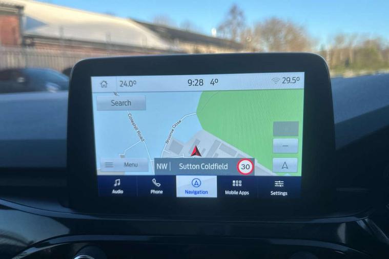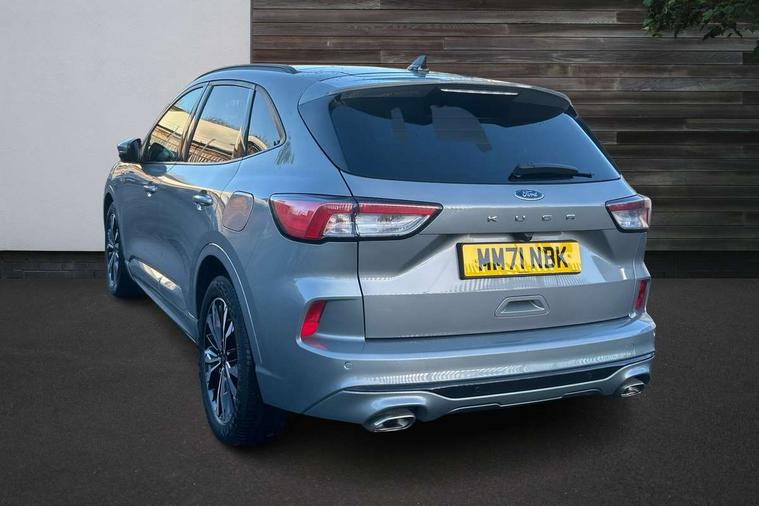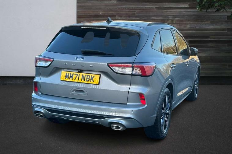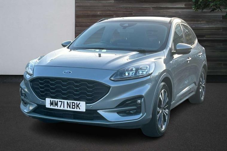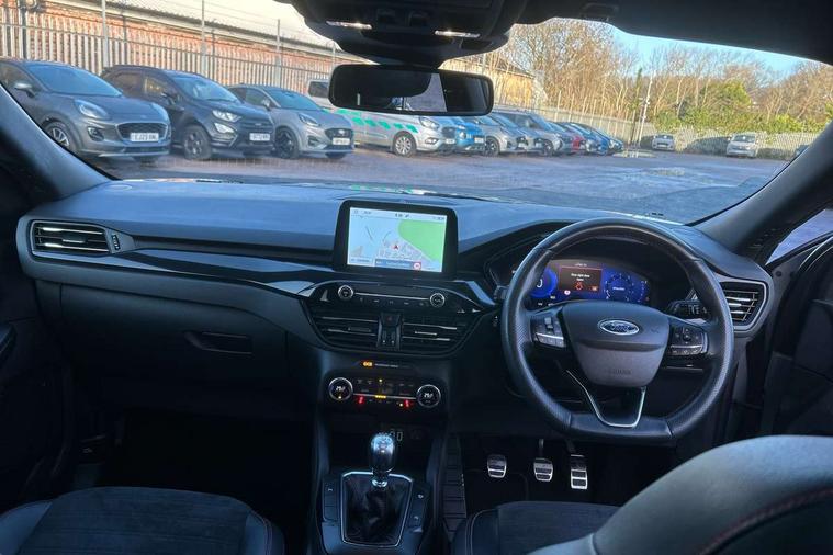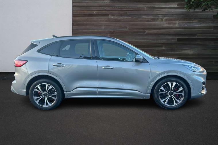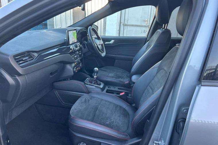 Driver impairment monitor, Ford easy fuel, Ford SYNC 3 with 8" colour touchscreen, App Link, andriod auto/apple carPlay and navigation with Ford pass connect, Front and rear parking sensors, Hands free power tailgate, Intelligent speed assist, Lane keeping aid with lane departure warning, Mobile phone wireless charging pad, Power assist steering, Selectable drive modes, Sports suspension, Auto dimming rear view mirror, Auto headlamps with high and low beam, Auto wipers, Black roof rails, Front LED fog lights with cornering function, Full LED headlamps, Large rear spoiler, LED daytime running lights, LED rear lights, Power folding heated door mirrors with puddle lights, Power front/rear windows with global close, Power opening panoramic roof, Privacy glass, Quickclear heated windscreen, ST Line body styling kit with unique front and rear fascia and bumper, rear painted diffuser, front painted skid plates, dark mesh upper grille, ST Line front scuff plates, Twin exhausts, 10 way power adjustable drivers seat, 2nd row sliding seats, 8 way manual passenger seat including lumbar support and height adjust, Alloy pedals, Ambient lighting, Centre console with electronic parking brake, Dark headlining and pillars, Dual electronic automatic temperature control, Flat bottomed leather steering wheel in sensico with red stitching, Front and rear head restraints, Heated passenger and driver seats, Rear charging point, Sensico partial premium leather upholstery, Sports seats, ST Line front and rear floor mats, Unique ST Line leather gear knob, B&O with large instrument cluster pack - Kuga, 3x3 point rear seatbelts, Airbags - front driver/passenger, front and rear curtain, Drivers knee airbag, Electronic stability control (ESC) and ABS, Ford MyKey Gen 2 safety system, Post collision braking, Powered child proof rear door locks, Pre collision assist with autonomous emergency braking, Red brake calipers, Tyre pressure monitoring system, Engine immobiliser, Keyless entry, Keyless start with 'Ford Power' starter button, Locking wheel nuts, Remote powered central double locking doors, Thatcham category 1 alarm,