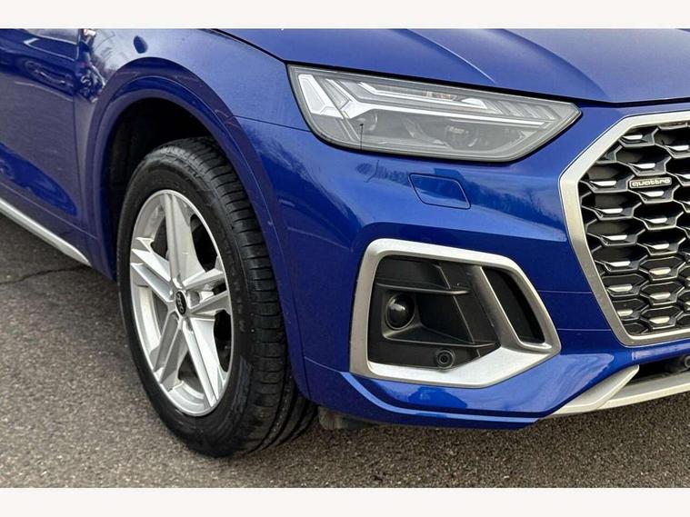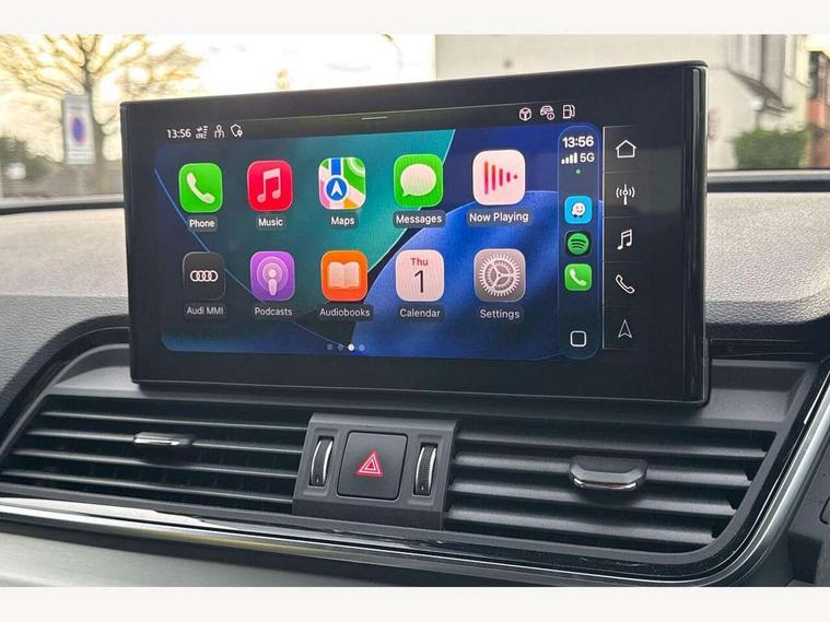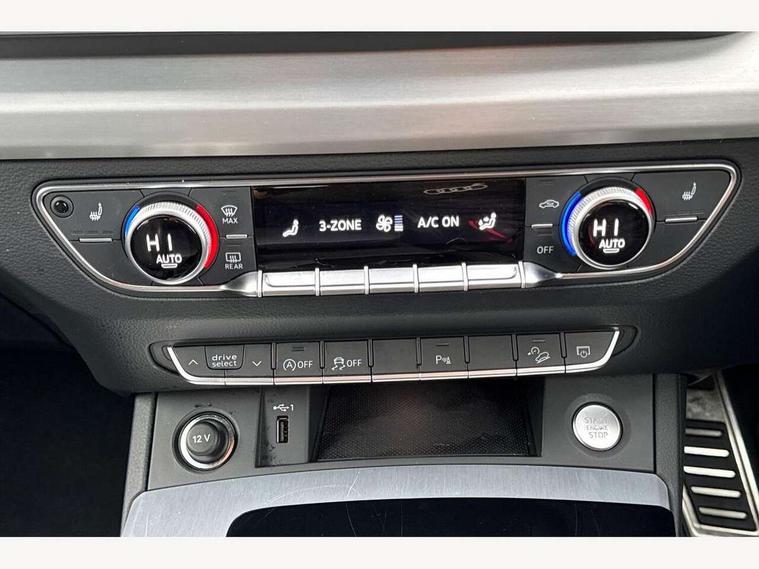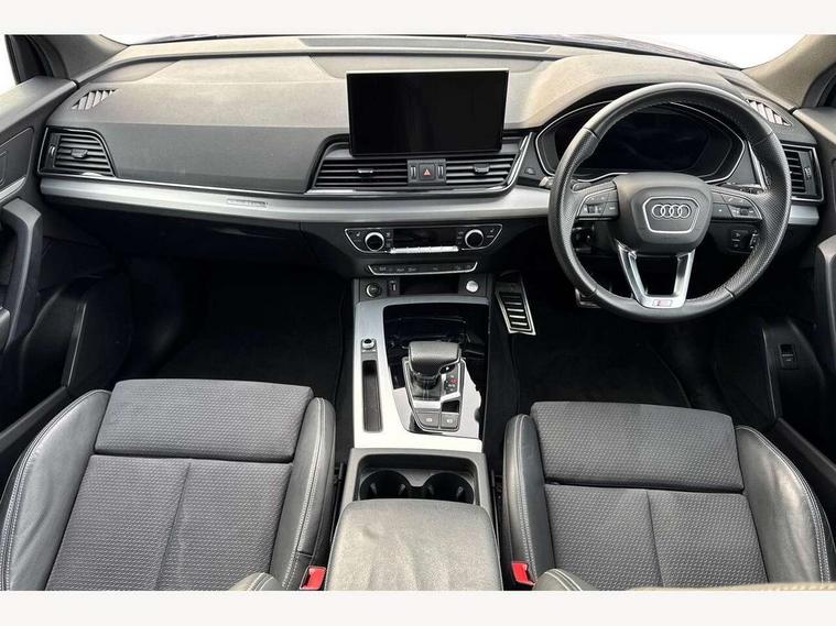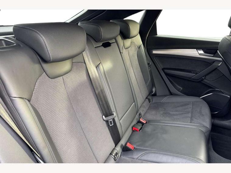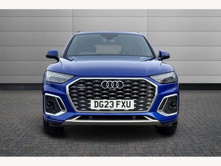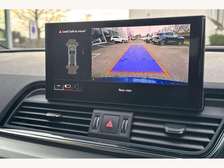 Acoustic front and rear parking sensor, Audi connect safety and service (e-call), Audi connect with Amazon Alexa Integration, Audi drive select, Audi virtual cockpit plus with 12.3" screen and three different layout designs, Audi wireless smartphone interface, Automatic start-stop system with coasting functionality and efficiency programme, Bluetooth interface, Electro - mechanical power assisted steering, MMI navigation plus with 10.1" touch screen, Power tailgate, Reversing camera, Service interval indicator, Voice control system with Audi hotword activation "Hey Audi", Diesel particulate filter, Quattro on demand, S line sports suspension, 8 loudspeakers, DAB Digital radio, Acoustic windscreen, Aluminium roof rails, Audi matrix LED headlights with dynamic front and rear indicators, Auto dimming door mirrors, Auto dimming frameless rear view mirror, Automatic headlight adjustment, Automatic headlights and windscreen wipers, Body colour door mirrors, Body colour rear diffuser with matt aluminium silver surrounds, Body colour underbody protection, Chrome plated exhaust trims, Daytime running lights, Door sills in Selenite silver, Electric adjustable/heated/folding door mirrors, Front air inlet surrounds in aluminium, Front and rear electric windows, Front radiator grille in honeycomb design, Headlight washers, High level LED brake light, Lower bumpers painted in contrast Manhattan grey, Rear chrome trim strip below lights, Rear privacy glass and rear side windows, Rear side wing doors, Rear wiper, Roof bars, S Line badges on the front wings, S Line front and rear bumpers, S Line rear spoiler, S Line side skirts, 2 x USB charging port with aux input socket, 3 rear headrests, 3 spoke leather multifunction steering wheel with S badging perforated leather grips, 40:20:40 split folding 3 rear bench seat in 2nd row with rear centre armrest, Black cloth headlining, Comfort front centre armrest, Contrast stitching on seats, steering wheel and gear lever gaiter, Deluxe 3 zone electronic climate control, Front head restraints, Front/rear floor mats, Gear lever in black leather, Heated front seats, Height/reach adjustable steering column, Illuminated door sill trims with S logo, Manual seat adjustment with 4-way electric lumbar support, Removable luggage compartment floor, Single front passenger seat, Stainless steel pedals, Sunvisors with vanity mirrors, Trunk roller cover, High gloss pack - Q5, LED interior light pack - Q5, 3 point seatbelts on all seats, 6 airbags - Driver, front passenger, curtain and side airbags, Electrically operated child locks on rear doors, Electromechanical parking brake, Electronic stabilisation control including ABS, ASR and EDL, First aid kit with warning triangle and vests, Front passenger airbag deactivation, Hill descent control, Hill hold assist, ISOFIX child seat mounting for front passenger seat and ISOFIX child seat mounting with Top Tether for outer rear seats, Multi collision brake assist, Pop-up bonnet for pedestrian protection, Pre sense city, Seat belt force limiter, Seatbelt monitoring, Tyre pressure warning, Anti theft alarm, Anti-theft wheel bolts, Keyless Go access/ignition system, Remote central locking, Air vents inserts and centre console in gloss black, Matt brushed aluminium inlays,