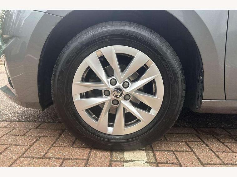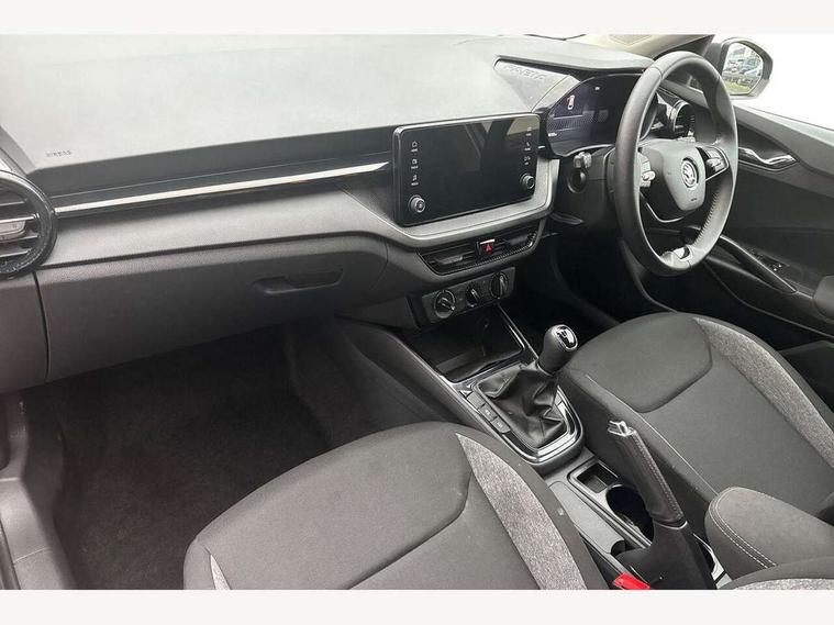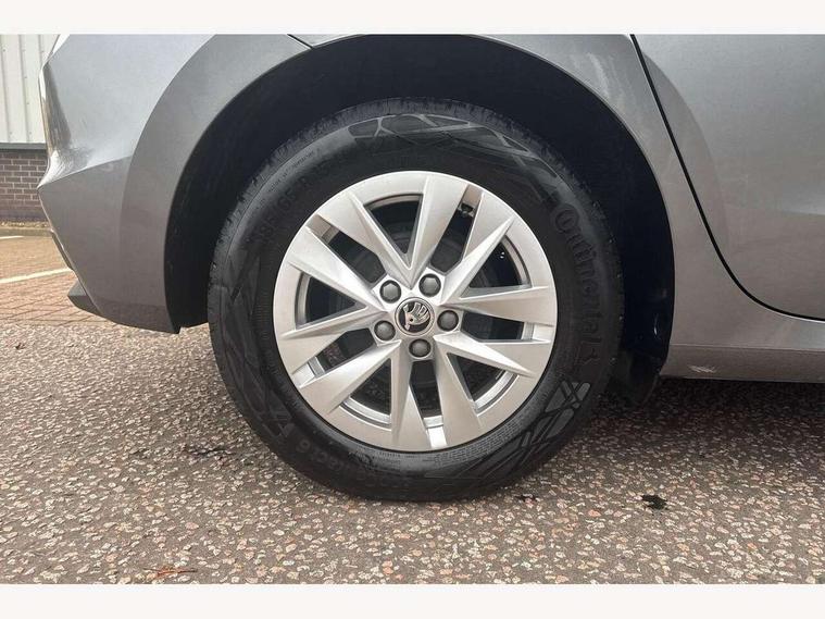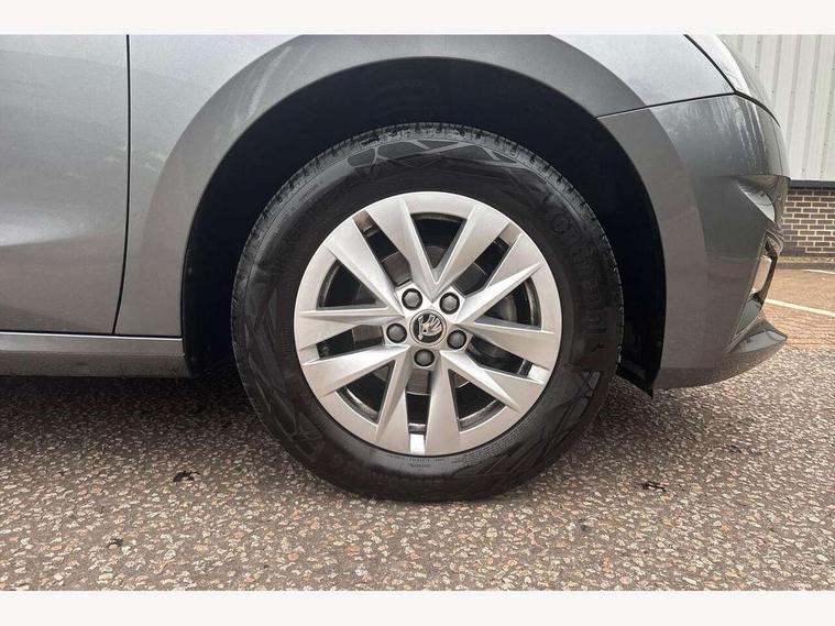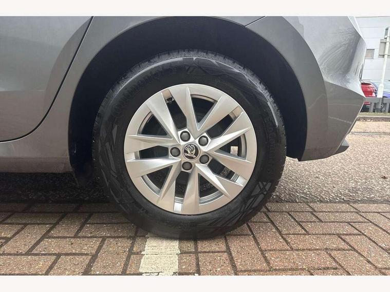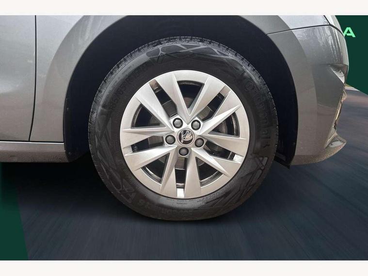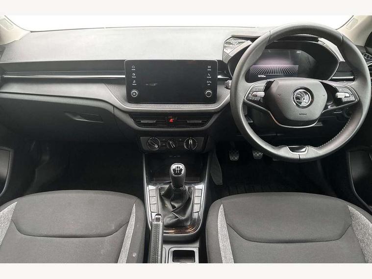 8" Digital instrument display, Advanced driver attention and drowsiness monitor, Bluetooth connection, Electromechanical power steering, Exterior temperature gauge, Lane assist including road edge detection, Rear parking sensors, Service interval indicator, Speed limiter, Traffic sign recognition, Wireless SmartLink for Apple CarPlay and Android Auto, 2x USB-C in the front (for data transmission and charging), 6 speakers (4 speakers/2 tweeters), 8.25" Skoda infotainment touchscreen display, Auxiliary socket for external MP3 player, DAB digital radio reception, Basic LED Headlights, Basic rear lights, Body colour door mirrors, Body coloured bumpers, Dimming rear view mirror with black frame, Door mirror integrated indicators, Electrically adjustable and heated door mirrors, Electrically adjustable front windows with function auto up/down, Front fog lights, Front window wiper intermittent control, Headlight range control - Automatic, Ice scraper in fuel cap, LED daytime running lights with coming and leaving home feature, Mechanical adjustable rear windows, Rain sensor, Rear LED fog light, Rear side wing doors, Rear window wiper with washing nozzles, Roof mounted spoiler, SKODA tailgate lettering in chrome, Third brake light, 2 reading lights in front and 2 reading lights in rear, 2 spoke leather multifunction steering wheel, 3 rear headrests, Backrest split and folding, Central console with removable cup holder and storage box, Chrome handbrake release button, Fabric upholstery, Front centre armrest, Gearshift knob/handle in leather, Grain satin black interior door handles, Hand brake lever handle in leather, Height adjustable driver seat, Height adjustable front headrests, Height adjustable steering wheel, ISOFIX and TopTether anchorage points to the outer rear seats, ISOFIX and TopTether on the front passenger seat, Luggage compartment lighting, Manual air conditioning, Pollen filter, Rear seat bench unsplit, Single front passenger seat, Storm grey headlining, Sun visors with mirror and airbag label on passenger side, Textile floor mats, Ticket holder, 3-point height adjustable front seats belts with pretensioner and force limiter, Automatic warning lights in case of crash, Driver and passengers airbag with switch off function, e-Call+, ESC including ABS, MSR, ASR, EDS, HBA and XDS, Front and rear seat belt warning, FRONT ASSIST (AEB City and AEB Inter Urban), Front side airbags, Head airbags, One tone horn, Pedestrian protection, Three rear 3-points safety seat belts with pretensioner and force limiter including stop function for outer rear seat belts, Tyre pressure monitoring system, Anti-theft alarm system including immobiliser, interior monitoring, backup horn, and towing protection, Central locking with radio remote control, interior controls, SAFE function and 2 foldable keys, Black painted air vents, Glossy black decorative trim, Grain satin black central console cover, Grain satin black lower decorative trim, Satin black door and side trim panel in front, Anti-theft wheel bolts protection, Super-low rolling resistance tyres,
