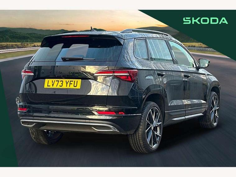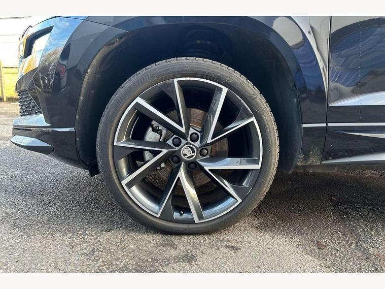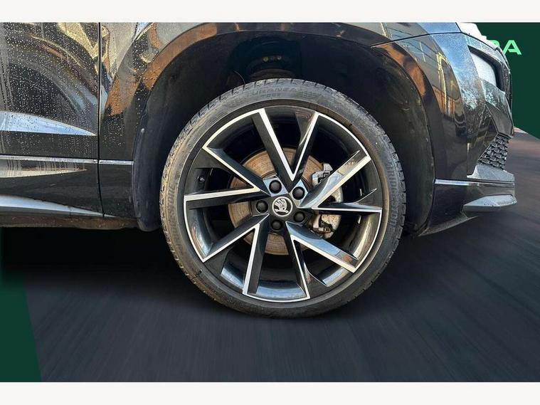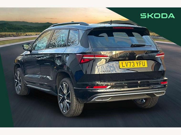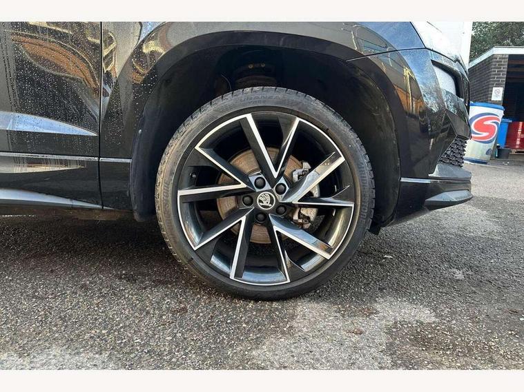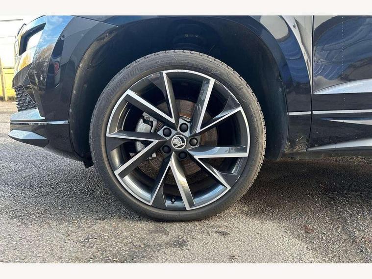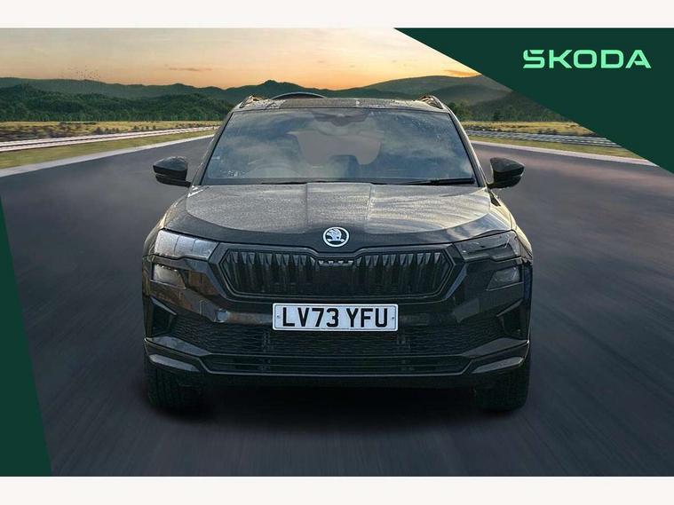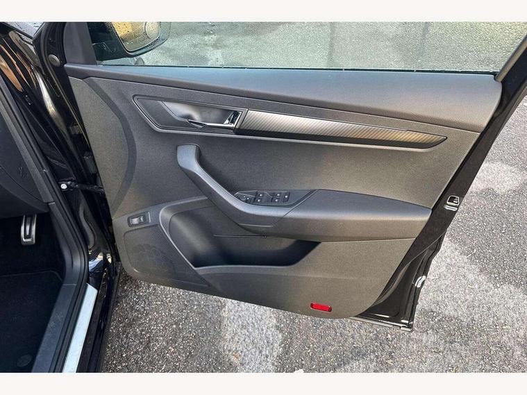 8" Digital display, Care connect, Driver fatigue sensor, Emergency services call system, Outside temperature gauge, Service interval indicator, SmartLink wireless for Apple and wired for Android, Start/stop system with regenerative braking, USB C Port x 2 in front centre console, Virtual cockpit, Virtual pedal with electrically operated boot door, 8 Speakers, DAB radio with Bluetooth, USB connection, Wireless charging without wireless aerial connection, Acoustic glass, Aero front windscreen wipers with intermittent function, Auto dimming rear view mirror with light and rain sensors, Black door mirrors, Black electric window control buttons, Black radiator grille, Black roof rails, Body colour door handles, Electric front and rear windows with child proof lock, Front door steps with SportLine logo, Heated rear windscreen, LED daytime running lights, LED rear lights with high functionality welcome effect and dynamic indicators, Light assistant (coming/leaving home/tunnel light), Panoramic sliding sunroof, Plastic scuff plates, Privacy glass, Protective door side sills in body colour, Rear diffuser, Rear side wing doors, Rear spoiler, Rear window wiper with washer system and intermittent control, Safety reflectors on front doors, Skoda lettering on tailgate in black, Sportline badge on front fender, Sportline decorative inserts with badging, Sports front and rear bumpers, 1.5 litre bottle holders in driver and front passenger door panels, 12V socket in boot, 12v socket in front centre armrest with storage compartment and rear air vents, 3 rear height adjustable headrests, 3 seat bench in 2nd row, 3 spoke leather sports multifunction steering wheel and silver stitching with gear shift paddles, 4 foldable roof handles with rear coat hooks, Black floor carpet, Black roof headlining, Chrome inner door handles, Double sided boot floor, Foldable hooks in the boot, Front head restraints, Height adjustable front three point seats belts with tensioners, Height/reach adjust steering wheel, Ice scraper, Illuminated glovebox, Illuminated luggage compartment, Isofix child seat preparation outer rear, Manual lumbar support for front seats, Pen holder, Pollen filter, Rear boot cover, Rear reading lights, Rear seats fixed folding and divided 60:40, Rubbish bin door, Safety vest holder, Single front passenger seat, Storage box in upper central dashboard closed, Sunvisors with illuminated vanity mirrors, Textile floor mats, Ticket holder, Titan black interior ceiling, Welcome animation with sportline logo, Boot pack - Karoq, Light Pack - Karoq, Parking pack - Karoq, Automatic door unlocking in case of crash, Automatic fuel cut off in case of crash, Child locks on rear doors, Driver airbag, Electronic parking brake with auto hold function, Emergency rear braking signal, ESC including ABS, MSR, ASR, EDS, HBA, DSR, RBS, MKB and traction control, Front side airbags, Hill hold control, Knee airbags, Passenger airbag with switch-off function, Pedestrian monitor, Seatbelt reminder signalisation and pretensioner for all seats, Three point seatbelts rear, Two tone horn, Tyre pressure display, Tyre pressure monitor, Alarm with interior monitoring, back up horn and tilt sensor with safe function, Electronic engine immobiliser, Keyless entry and start/stop, Remote central locking with 2 remote folding keys, Black air vent surround, Black centre console, Satin black dashboard, Satin black door trim, 19" Sagitarius anthracite alloy wheels with matt black aero inserts, Anti-theft wheel bolts protection, Matt black aero hub caps, Tool kit,