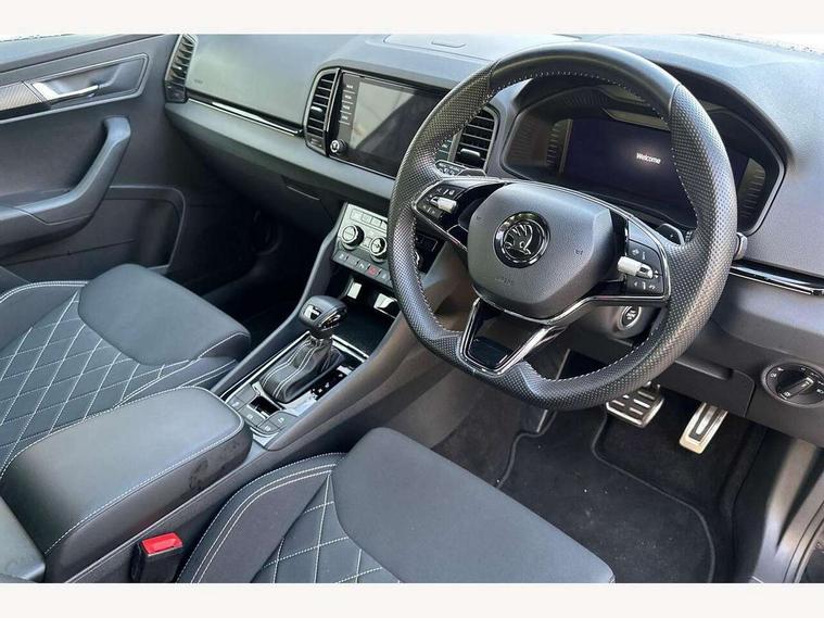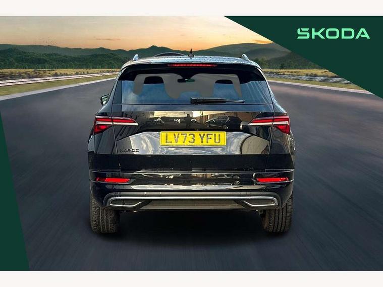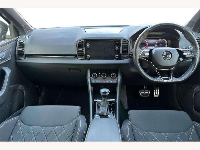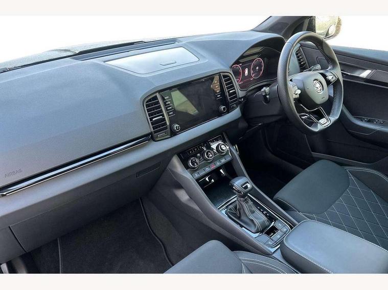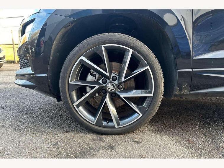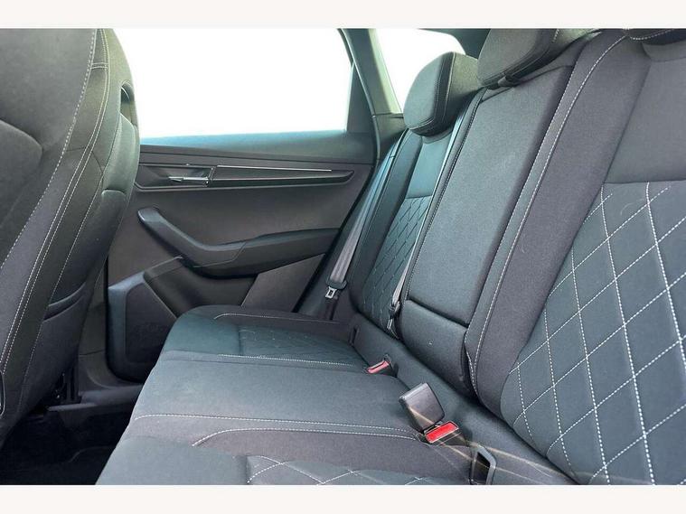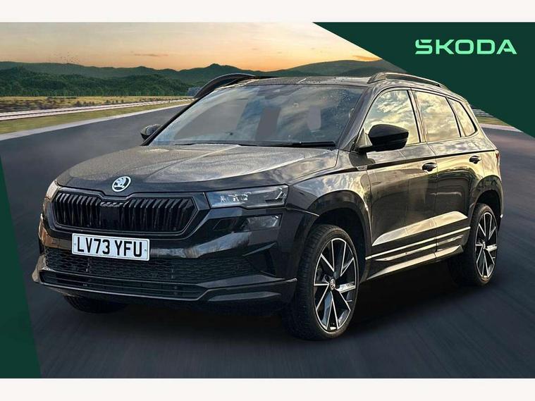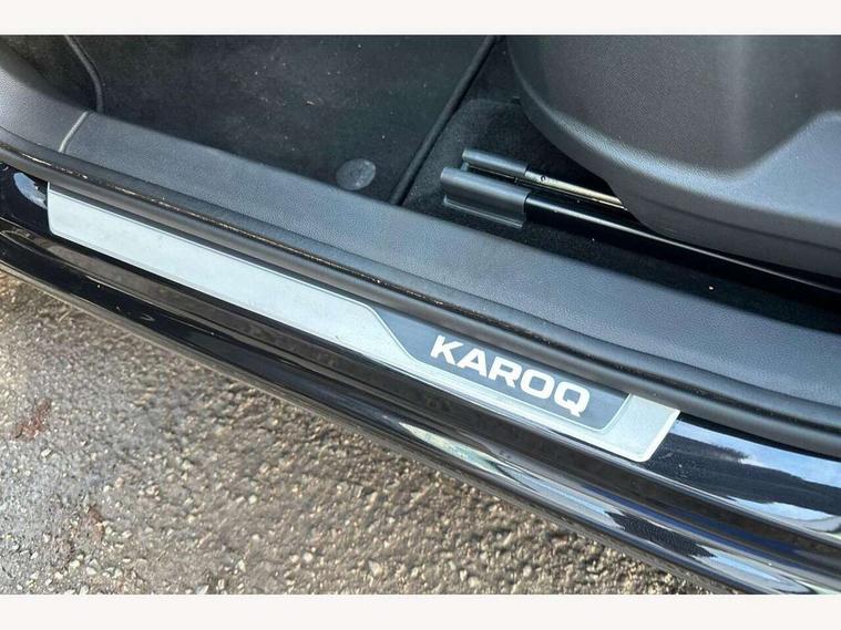 8" Digital display, Care connect, Driver fatigue sensor, Emergency services call system, Outside temperature gauge, Service interval indicator, SmartLink wireless for Apple and wired for Android, Start/stop system with regenerative braking, USB C Port x 2 in front centre console, Virtual cockpit, Virtual pedal with electrically operated boot door, 8 Speakers, DAB radio with Bluetooth, USB connection, Wireless charging without wireless aerial connection, Acoustic glass, Aero front windscreen wipers with intermittent function, Auto dimming rear view mirror with light and rain sensors, Black door mirrors, Black electric window control buttons, Black radiator grille, Black roof rails, Body colour door handles, Electric front and rear windows with child proof lock, Front door steps with SportLine logo, Heated rear windscreen, LED daytime running lights, LED rear lights with high functionality welcome effect and dynamic indicators, Light assistant (coming/leaving home/tunnel light), Panoramic sliding sunroof, Plastic scuff plates, Privacy glass, Protective door side sills in body colour, Rear diffuser, Rear side wing doors, Rear spoiler, Rear window wiper with washer system and intermittent control, Safety reflectors on front doors, Skoda lettering on tailgate in black, Sportline badge on front fender, Sportline decorative inserts with badging, Sports front and rear bumpers, 1.5 litre bottle holders in driver and front passenger door panels, 12V socket in boot, 12v socket in front centre armrest with storage compartment and rear air vents, 3 rear height adjustable headrests, 3 seat bench in 2nd row, 3 spoke leather sports multifunction steering wheel and silver stitching with gear shift paddles, 4 foldable roof handles with rear coat hooks, Black floor carpet, Black roof headlining, Chrome inner door handles, Double sided boot floor, Foldable hooks in the boot, Front head restraints, Height adjustable front three point seats belts with tensioners, Height/reach adjust steering wheel, Ice scraper, Illuminated glovebox, Illuminated luggage compartment, Isofix child seat preparation outer rear, Manual lumbar support for front seats, Pen holder, Pollen filter, Rear boot cover, Rear reading lights, Rear seats fixed folding and divided 60:40, Rubbish bin door, Safety vest holder, Single front passenger seat, Storage box in upper central dashboard closed, Sunvisors with illuminated vanity mirrors, Textile floor mats, Ticket holder, Titan black interior ceiling, Welcome animation with sportline logo, Boot pack - Karoq, Light Pack - Karoq, Parking pack - Karoq, Automatic door unlocking in case of crash, Automatic fuel cut off in case of crash, Child locks on rear doors, Driver airbag, Electronic parking brake with auto hold function, Emergency rear braking signal, ESC including ABS, MSR, ASR, EDS, HBA, DSR, RBS, MKB and traction control, Front side airbags, Hill hold control, Knee airbags, Passenger airbag with switch-off function, Pedestrian monitor, Seatbelt reminder signalisation and pretensioner for all seats, Three point seatbelts rear, Two tone horn, Tyre pressure display, Tyre pressure monitor, Alarm with interior monitoring, back up horn and tilt sensor with safe function, Electronic engine immobiliser, Keyless entry and start/stop, Remote central locking with 2 remote folding keys, Black air vent surround, Black centre console, Satin black dashboard, Satin black door trim, 19" Sagitarius anthracite alloy wheels with matt black aero inserts, Anti-theft wheel bolts protection, Matt black aero hub caps, Tool kit,