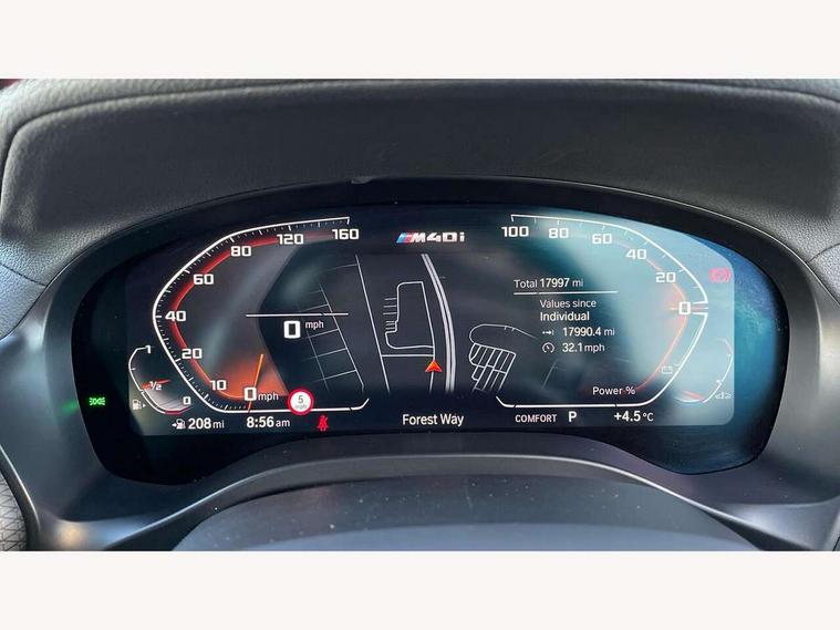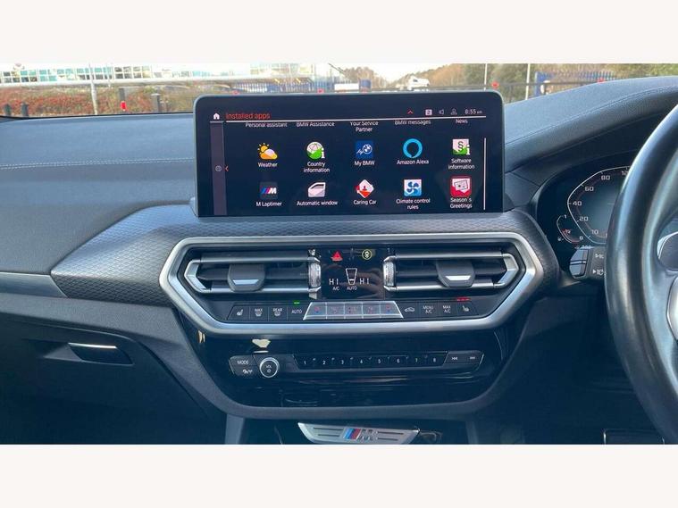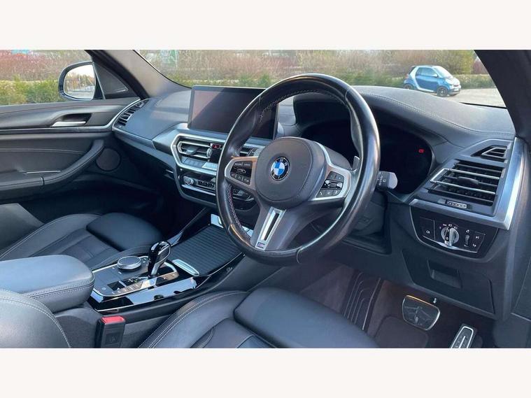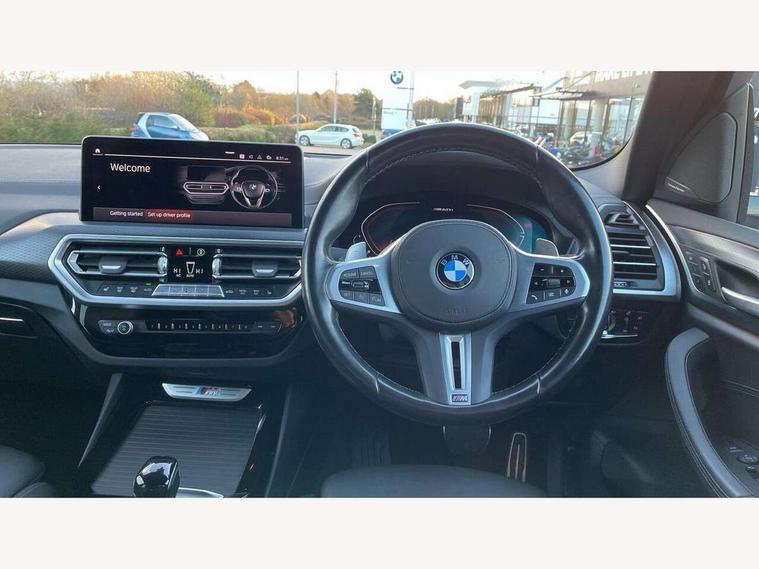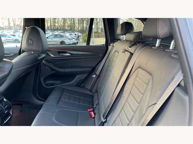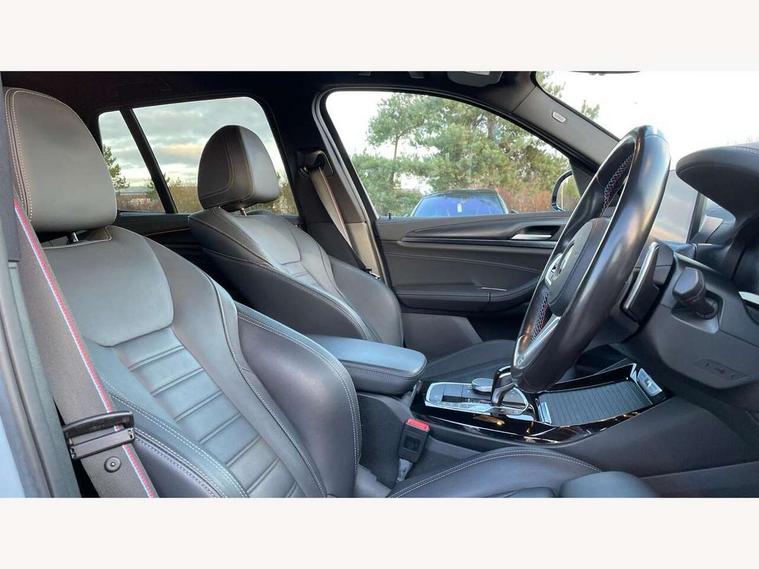 Active Guard, Attentiveness assist, BMW Live Cockpit Professional nav system including 12.3" instrument display + 12.3 high resolution control display, BMW Online services, BMW Teleservices, Brake pad wear indicator in front and rear, Check Control warning system for monitoring of lights and door/luggage compartment open warning, Condition based service - BMW service history, electronic service booklet, integrated owner's handbook, Connected drive services, Deletion of driving assistant professional, Electric boot lid, Front/rear Parking distance control, iDrive Controller with 8 favourite buttons, Instrument cluster with speedometer with mph readout, tachometer, fuel gauge and oil temperature gauge, Lights on warning by audio warning signal when ignition is switched off, Oil sensor for level and grade, warning by check control system, On board computer - average speed+fuel consumption, service interval, clock/date, odometer/trip meter, outside temperature display and ice warning, Optimum shift indicator, Personal Profile - automatic lock when driving away selectable, Run flat indicator, Stop/start system, Variable sports power steering with drive performance control Sport+ mode, Incorrect fuelling protection, M Adaptive suspension, M Sport differential, Multi-link rear suspension, Performance Control, Sport automatic transmission with gearshift paddles, BMW professional radio/CD/MP3, DAB tuner, Acoustic glazing, Automatic windscreen wipers and automatic headlight, Black finish on B pillars, BMW individual high gloss shadow line with extended content, Body colour door handles, Body colour roof mouldings, Body coloured bumpers, Direction indicator, side repeaters, integrated in exterior mirrors, Dynamic brake lights, Electric adjust heated aspherical door mirrors, Exhaust tailpipes - dual, round, split left and right with chrome finisher, Fingertip control / anti-trap function on electric window, Folding wing mirrors with auto dimming, Follow me home headlights, Front and rear bumper system with replaceable deformation elements, Front and rear electric windows, Green tinted heat insulating glass, Heated windscreen washer jets, High beam assistant, High gloss black shadow line roof rails, High gloss shadowline exterior trim in decorative moulding side frame/recess cover/guide rail/B, C pillars/mirror frame and triangle with mirror base, High level 3rd brake light incorporating LED Technology, Interior rear view electrochromatic mirror with automatic anti dazzle function, Kidney frame and struts painted in high gloss black, LED tail lights, Lightweight engineering, M aerodynamic bodystyling, M black mirror caps, M Sport entry door sill strips, Model designation, Rain sensor, Rear side wing doors, Rear wing door, Rear wiper, Shark fin antenna, Side exterior M designation badges, Sun protection glass, Visible VIN plate, Welcome lighting, Windscreen wipers with adjustable interval, 12V power point in luggage area, 12V power socket in front centre console, 3 rear headrests, 3 seat bench in 2nd row, 3 zone automatic air conditioning, 4 lashing points to secure luggage, 40:20:40 split folding rear seat with loading system, Ambient lighting, Anthracite headlining, Automatic interior light when door is opened/ignition switched off or via remote key, Electric adjustable seats with memory function, Floor mats in velour, Foldable storage floor with compartment, Four grab handles integrated in roof lining, Front and rear bottle holders integrated into door trim storage compartments, Front and rear side armrests integrated into door trim, Front centre armrest with storage compartment, Front footwell lights, Front head restraints, Front passenger seat, Front/rear courtesy lights with soft on/off dimming, Front/rear reading lights, Heated front seats, Isofix rear child seat preparation, Leather gear knob, Luggage area underfloor compartment, Luggage compartment lighting, M sport leather steering wheel, Multifunction steering wheel, Parcel shelf removeable and storable under boot floor, Reach and rake adjustable steering column, Rear centre armrest with 2 cupholders, Removable / retractable luggage cover, Slope adjustable rear seats, Storage compartment in rear centre console and front/rear door trims, Sun visors with vanity mirrors and ticket pocket, Toolkit located in luggage compartment, Two front cupholders with removable oddments tray/lid, Vernasca leather upholstery, Connected pro pack - X3, Active protection, ADB - Automatic Differential Brake, Anti-lock braking system (ABS) with brake assist, Automatic Stability Control (ASC), Battery safety cut-off, BMW emergency call, Brake drying, Brake energy regeneration, Braking pre-tensioning, Child locks on rear doors, Cornering brake control (CBC), Crash Sensor - activation of central locking release, hazard warning light and interior lighting, Deactivation of fuel pump in the event of a crash, Driver and front passenger front and side airbags with passenger deactivation and ITS front and rear head airbags, Driver and front passenger knee airbag, DSC+, Dynamic brake control, Dynamic Traction Control - DTC, Electromechanical parking brake, Hill descent control, Hill start assist, M sport seatbelt, Seatbelt security check for front seats, Side impact protection, Three point seatbelts to all seats with front and outer rear pyrotechnic belt tensioners and seat belt force limiters, Two tone horn, Tyre pressure sensor, Ventilated front and rear disc brakes, Warning triangle and first aid kit, Central locking switch for all doors, fuel filler cap and luggage compartment, Electronic engine immobiliser, Locking wheel nuts, Remote control including two integrated key - one button for open/close all lockable content, windows and separate button for open luggage compartment, Remote control Thatcham category 1 alarm, Start/stop button with Comfort Go keyless engine start and auto Start/stop deactivation button, Sensatec dashboard, Low rolling resistance tyres,