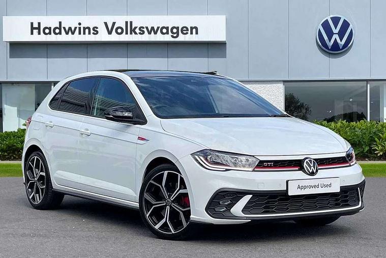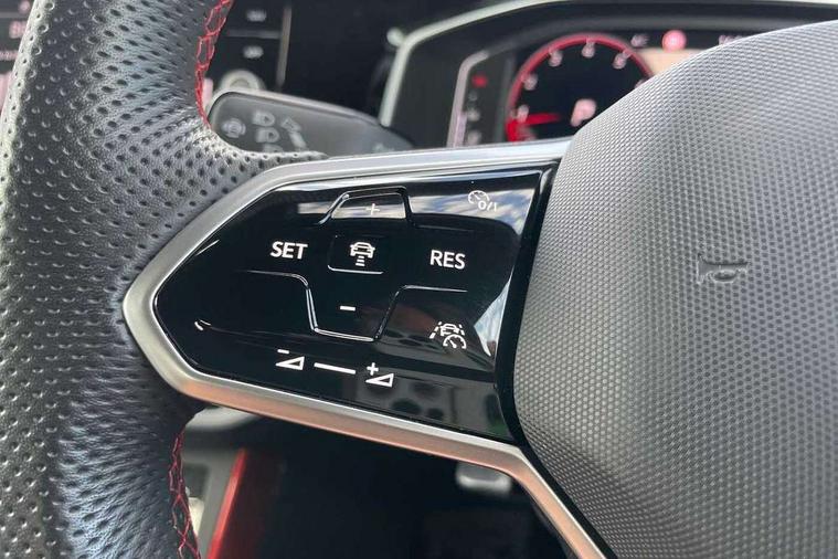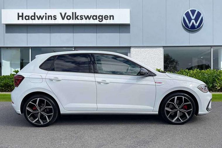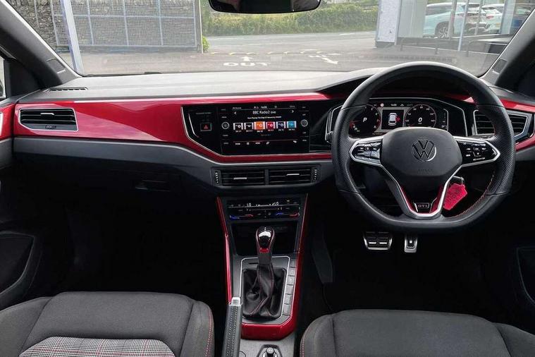 Adaptive cruise control with follow-to-stop and speed limiter, Bluetooth mobile phone interface, Digital Cockpit Pro with 10.25" Display, Driver alert system, Dynamic road sign display, Eco mode, Emergency call service, Power assisted speed sensitive steering, Preparation for We connect and We connect plus, Speedo and rev counter, electronic odometer, trip, service interval display and fuel gauge, Travel Assist - Lane keeping system and traffic jam assist, Travel assist including emergency assist, Trip computer, Warning signal and warning light for front and rear seatbelts not fastened, Washer fluid level indicator, Wireless app connect, Adaptive chassis control, Front wheel drive, Heavy duty rear axle, Rear shock absorpion sports version, Sports select suspension lowered by 15mm, Start-stop system with battery regeneration (recuperation - energy recovery during braking), DAB Digital radio, Diversity antenna for FM reception, Front and rear 6 speakers, Body colour bumpers, Body colour door handles, Electric front windows, Front scuff plates in aluminium with GTI logo, Heat insulating darkened glass in side and rear windows, Heat insulating glass windscreen, Power folding adjustable/heated exterior mirrors and front passenger exterior mirror lowering function, Rear electric windows, Rear fog light, Rear side wing doors, Rear windscreen washer and wiper with interval delay, Sport bumpers with air intakes with honeycomb structure, Third brake light, Twin chrome exhaust tailpipes, 12V power socket in centre console, 2 USB-C ports in the front, 2 USB-C charging sockets on the center console in the rear, 3 rear head restraints, 60/40 split folding rear seat and rear seat bench not split, Air care climatronic air conditoning system with active combination filter and 2-zone temperature control, Black roof lining, Ceramique headliner, Chrome plated radiator grille inserts, air vent surrounds and light switch surrounds, Door and side trim panel, Driver and front passenger seat height adjustment, Driver/passenger sunvisors with illuminated vanity mirrors, Front + rear carpet mats, Front centre armrest, Front footwell illumination, Front seat backrest storage pockets, GTI sports gearshift knob in aluminium leather, Handbrake lever handle in leather, Isofix child seat preparation easy-fit (for two outer rear seats, and front passenger seat) compatible with I-size, LED interior light with switch off delay and dimmer, 2 reading lights front and rear, Luggage compartment cover, Luggage compartment floor, Luggage compartment lighting, Single front passenger seat, Stainless steel pedals, Standard pedal cluster, Three spoke leather wrapped multifunction sports steering wheel with shifting paddles, IQ LED matrix headlights pack - Polo, Light and sight pack - Polo GTI, Sports suspension pack - Polo, 3 point height adj front seatbelts + pretensioners, 3x3 point rear seatbelts, ABS, Driver and front passenger airbag with front passenger airbag deactivation, Drivers and front passengers safety optimised head restraints, ESC (Electronic stability control) + EDL (Electronic Differntial lock) and ASR (Traction control), Extended and predictive pedestrian/ cyclist protection, Front and rear disc brakes with red brake calipers, Front curtain and side airbags with center airbag, Hill hold control, Manual child lock in rear doors, Two tone horn, Tyre pressure loss indicator, Alarm with interior protection, Anti-theft alarm system with interior monitoring, backup horn, and towing protection, Anti-theft wheel bolts, Electronic engine immobiliser, Chrome applications on rotary light, mirror adjustment, window regulator switches, outlet with frame in black, Low rolling resistance tyres,