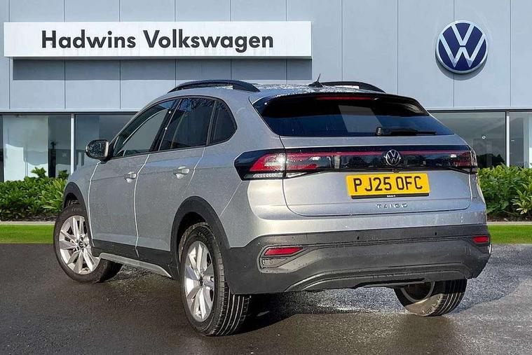 8" Digital cockpit basic display, Advanced driver attention and drowsiness monitor, Dynamic road sign display, e-Call (emergency call), Power Steering, Predictive adaptive cruise control, Rear view camera, Travel assist including emergency assist, Washer fluid level indicator, Wireless Charging including Bluetooth, Start-stop system with battery regeneration (recuperation - energy recovery during braking), Digital radio reception (DAB+), WeConnect plus, Ambient lighting with logo projection, Aspherical driver's exterior mirror, Body coloured bumpers, Body coloured exterior mirror housings and door handles, Electric windows, External USB type C socket and charging sockets, Heat insulating glass windscreen, LED rear combination lamp, LED third brake light, Left convex exterior mirror, Power folding adjustable/heated exterior mirrors and front passenger exterior mirror lowering function, Rear fog light on one side, reversing light on both sides, Rear side wing doors, Rear wash/wipe with intermittent wipe setting, Side windows in heat-insulating glass, from B-pillar and rear window dark tinted, 'Slash/ Austin' Cloth upholstery, 12V socket in centre console, 2 front reading lights, 3 rear head restraints, 3 seat bench in 2nd row, Black carpets, Ceramique headliner, Child seat anchor for child seat system i-Size, 2x top tether and child seat anchor in front on front passenger side, Door and side trim panels in titan black, Driver and front passenger seat height adjustment, Front centre armrest, Handbrake lever handle in leather, Height and reach adjustable steering wheel, Leather trimmed gear knob, Leather wrapped multifunction steering wheel, Luggage compartment floor, Luggage compartment light, Lumbar support for driver's and front passengers seat, Seat covers in titanium black, Single front passenger seat, Split folding backrest with centre armrest and unsplit rear seat bench, Storage compartment under front seats, Sun visors with illuminated vanity mirrors, Titanium black instrument panel, Chrome Package - Taigo, Drivers assistance package - Taigo, Light and sight pack - Taigo, 2 x 3-point seatbelts/outer rear seats with ECE label, 3-point seat belts in front with pretensioner and height adjustment, 3-point seatbelt for centre rear seat, Driver and front passenger airbag with front passenger airbag deactivation, Driver and front passenger safety-optimised head restraints, Electronic stability control, Extended and predictive pedestrian/ cyclist protection, Front and rear disc brakes, Front curtain and side airbags with center airbag, Hill start assist, Manual rear child locks, Single tone horn, Tyre pressure loss indicator, Anti-theft alarm system with interior monitoring, backup horn, and towing protection, Keyless locking and starting system keyless access with safelock, Black (slush) Dashboard, Lava stone black gloss/matt decorative inserts in dash and front door panels, Low rolling resistance tyres,
