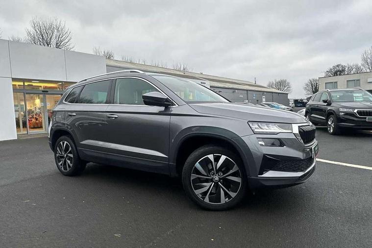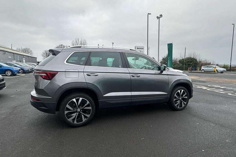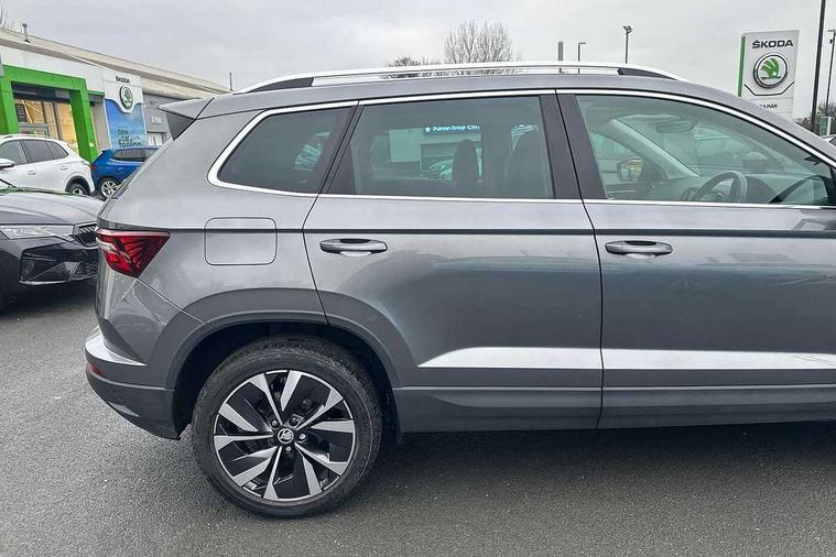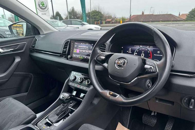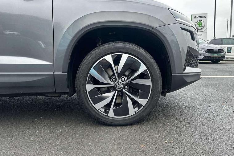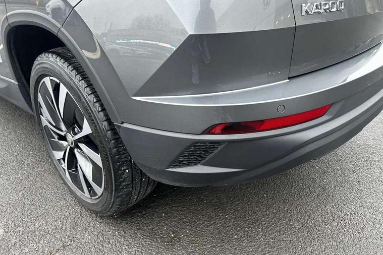 8" Digital display, Care connect, Colour multifunction trip computer, Driver fatigue sensor, Emergency services call system, Outside temperature gauge, Service interval indicator, SmartLink wireless for Apple and wired for Android, Start/stop system with regenerative braking, USB C Port x 2 in front centre console, 8 Speakers, DAB radio with Bluetooth, USB connection, Acoustic glass, Aero front windscreen wipers with intermittent function, Auto dimming rear view mirror with light and rain sensors, Automatic headlight control system, Black electric window control buttons, Body colour door mirrors and handles, Electric front and rear windows with child proof lock, Heated rear windscreen, LED daytime running lights, LED rear lights with high functionality welcome effect and dynamic indicators, Light assistant (coming/leaving home/tunnel light), Plastic scuff plates, Privacy glass, Rear side wing doors, Rear spoiler, Rear window wiper with washer system and intermittent control, Safety reflectors on front doors, 1.5 litre bottle holders in driver and front passenger door panels, 12V socket in boot, 12v socket in front centre armrest with storage compartment and rear air vents, 2 Folding hooks and nets in boot, 2 spoke leather heated multifunction steering wheel with DSG paddles, 2 x Tablet holder, 3 rear height adjustable headrests, 3 seat bench in 2nd row, 4 foldable roof handles with rear coat hooks, Black floor carpet, Chrome inner door handles, Decorative door sills with KAROQ badging, Double sided boot floor, Foldable hooks in the boot, Front head restraints, Height adjustable front three point seats belts with tensioners, Height/reach adjust steering wheel, Ice scraper, Illuminated glovebox, Illuminated luggage compartment, Isofix child seat preparation for front passenger seat, Isofix child seat preparation outer rear, Manual lumbar support for front seats, Pen holder, Pollen filter, Rear boot cover, Rear reading lights, Rubbish bin door, Safety vest holder, Single front passenger seat, Storage box in upper central dashboard closed, Sunvisors with illuminated vanity mirrors, Textile floor mats, Ticket holder, VarioFlex seats with standard rear seat release, Chrome roof rails + chrome pack - Karoq, Parking pack - Karoq, Automatic door unlocking in case of crash, Automatic fuel cut off in case of crash, Child locks on rear doors, Driver airbag, Electronic parking brake with auto hold function, Emergency rear braking signal, ESC including ABS, MSR, ASR, EDS, HBA, DSR, RBS, MKB and traction control, Front side airbags, Hill hold control, Knee airbags, Passenger airbag with switch-off function, Pedestrian monitor, Seatbelt reminder signalisation and pretensioner for all seats, Three point seatbelts rear, Two tone horn, Tyre pressure display, Tyre pressure monitor, Alarm with interior monitoring, back up horn and tilt sensor with safe function, Electronic engine immobiliser, Keyless entry and start/stop, Remote central locking with 2 remote folding keys, Chrome framed air vents, Anti-theft wheel bolts protection, Storage on wheel cover, Tool kit,