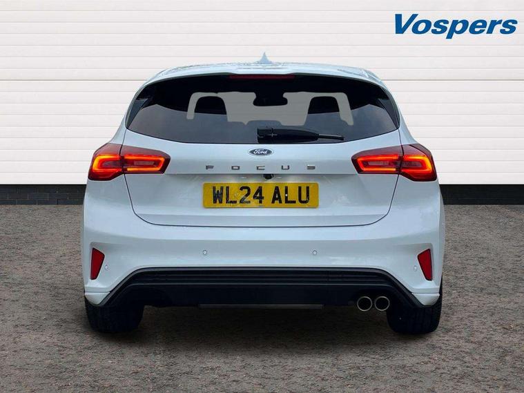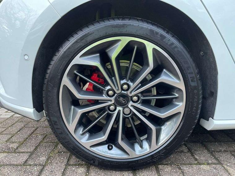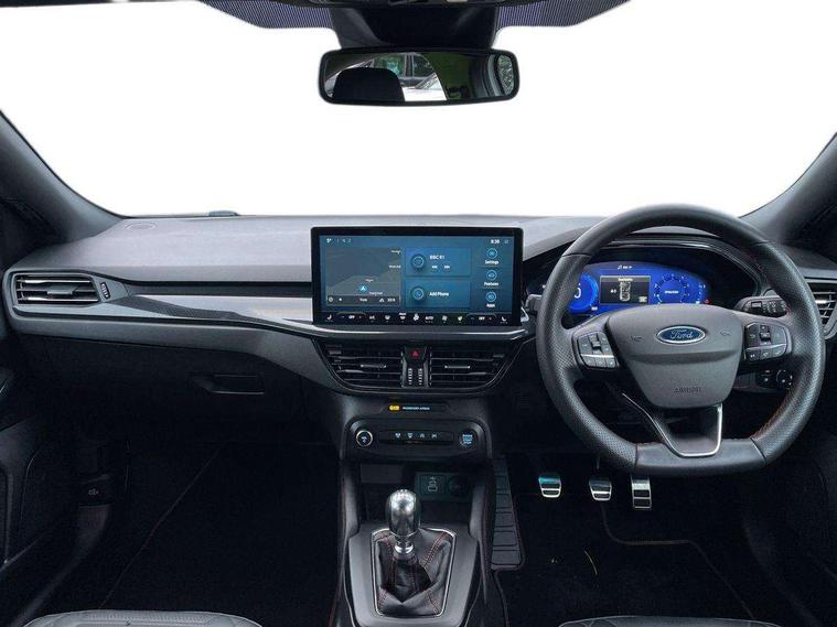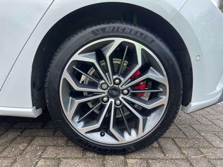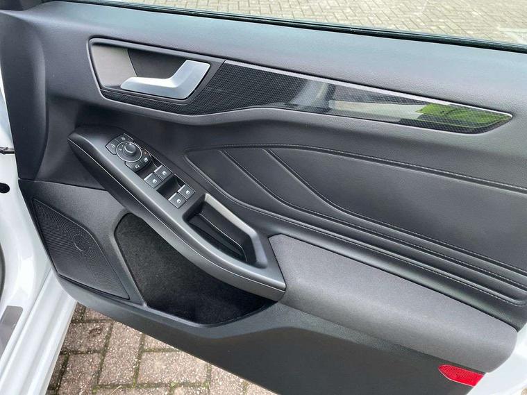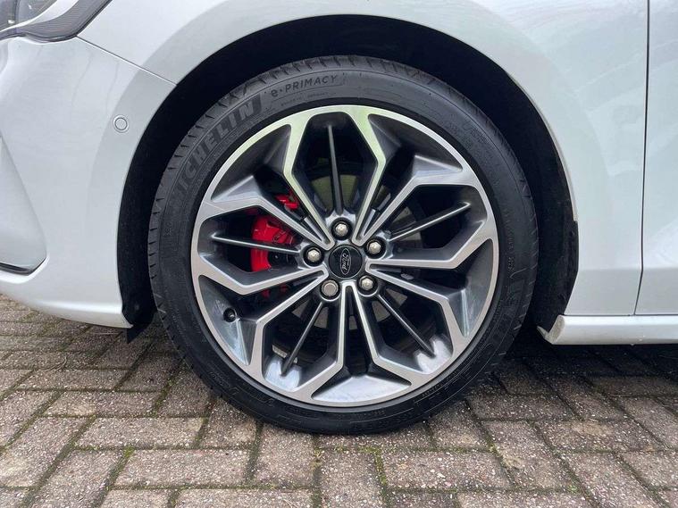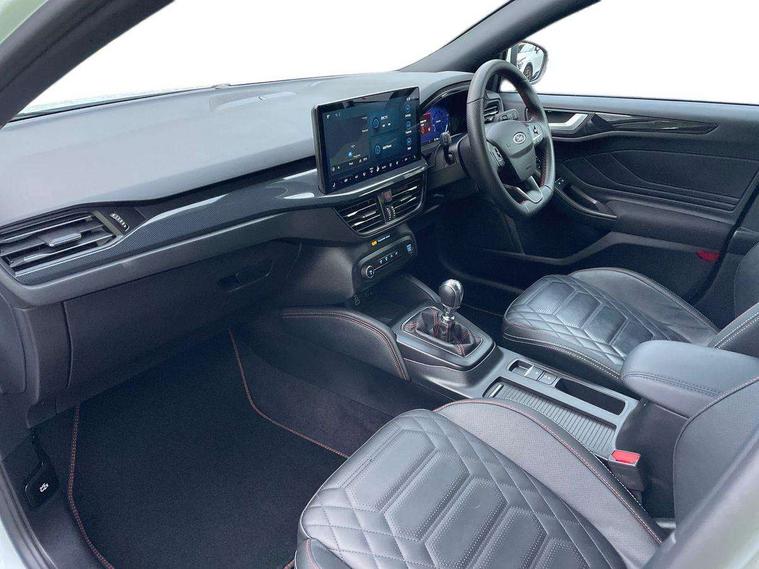 12.3" Digital instrument cluster, Bluetooth system, Digital clock, Easy fuel capless refuelling system, Eco mode, Ford SYNC4 Nav with 13.2'' touchscreen, DAB, Emergency Assistance, Apple Carplay & Android Auto, B&O Premium Audio with 10 speakers, FordPass Connect, Lane keeping system - lane keeping alert and lane keeping aid, PAS, Rev counter, Selectable drive mode, Service interval indicator, Trip computer, Wireless charging pad, Sports tuned suspension, 2 USB ports, Auto headlamps (on/off), Body coloured door handles, Electrically operated front and rear windows with one touch opening and closing, Electrically operated heated power fold door mirrors with puddle lamp with side indicators, Front variable intermittent wipers with electric wash, Heated rear window, LED daytime running lamp, LED rear lamps, LED third brake light, Polished twin tailpipe, Privacy glass, Quickclear heated windscreen, Rain sensor, Rear side wing doors, Tailgate wash/wipe, Unique ST-Line grille, full bodystyling kit, and large body coloured rear roof spoiler, 3 rear headrests, 3 seat bench in 2nd row, Dual zone electronic air temperature control, Full sensico premium upholstery, Height adjustable front headrests, Isofix child seat preparation, Load through ski hatch, Manual 2-way passenger seat adjust, Power 4-way driver seat adjust, with power lumbar adjust, Reach + rake adjustable steering column, Single front passenger seat, ST-Line Design pack - Focus, Winter pack - Focus, 3x3 point rear seatbelts, ABS+Electronic Brake force Distribution, Auto hold function, Driver airbag, EDL traction control, Electronic parking brake, Electronic stability control, Front and rear seatbelt reminder, Front inertia reel height adjustable seatbelts with pre-tensioners, Front passenger airbag, Front side airbags, Passenger airbag deactivate switch, Post collision braking, Pre collision assist with autonomous emergency braking and pedestrian/cyclist detection, Remote/power child rear door locks, Side curtain airbags, Three rear inertia reel lap/diagonal seatbelts, Tyre pressure monitoring system, Keyless entry and keyless start, MyKey system, Remote central locking & engine immobiliser, Thatcham alarm with power door dead locks, 18" 5x3 spoke pearl grey high gloss machined finish alloy wheels with mini spare wheel,