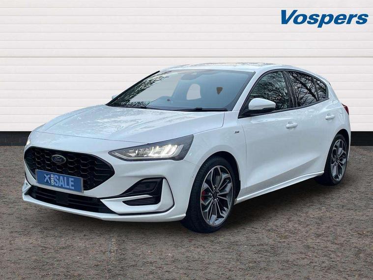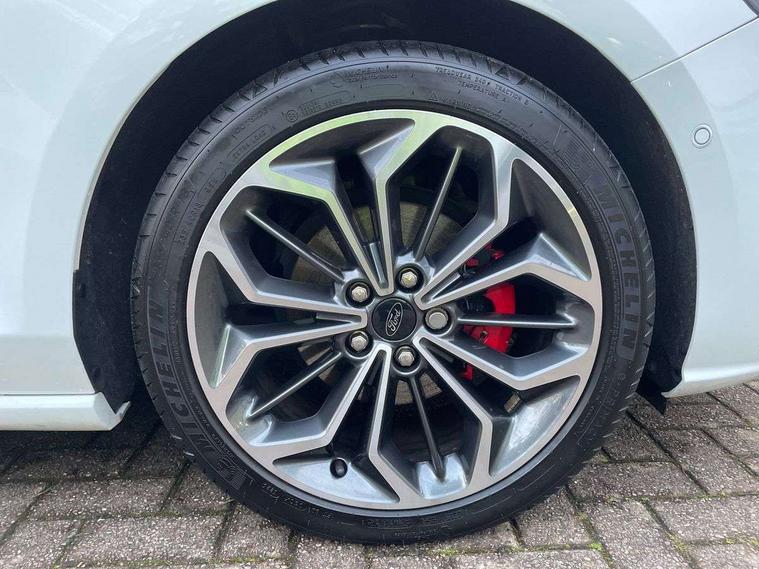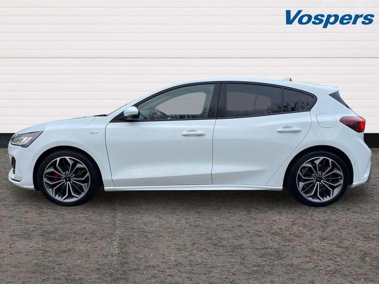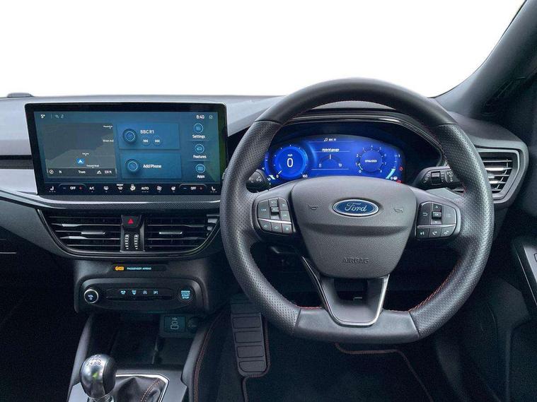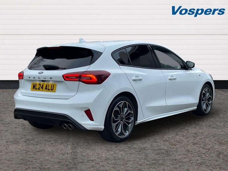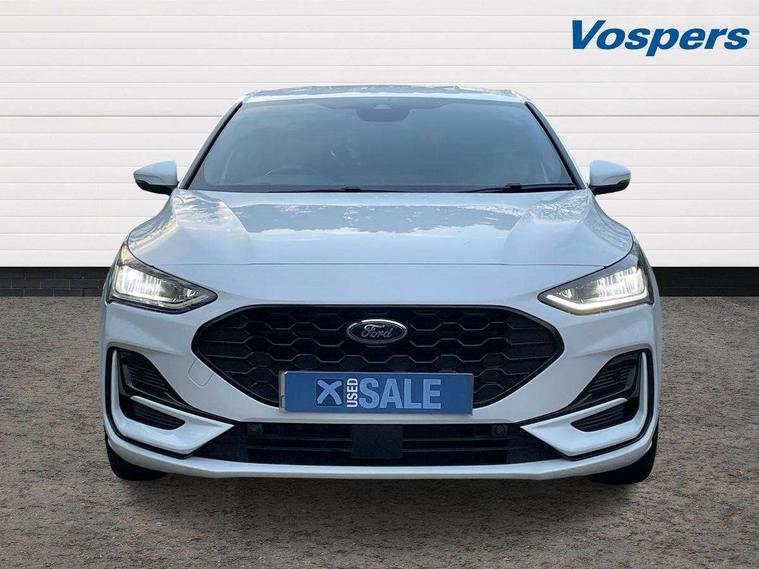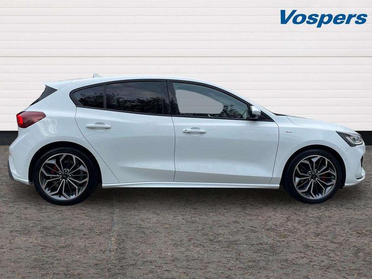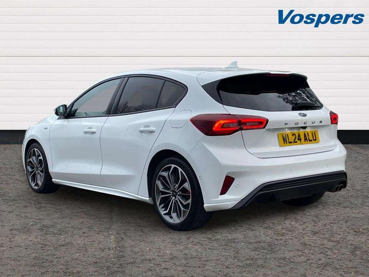 12.3" Digital instrument cluster, Bluetooth system, Digital clock, Easy fuel capless refuelling system, Eco mode, Ford SYNC4 Nav with 13.2'' touchscreen, DAB, Emergency Assistance, Apple Carplay & Android Auto, B&O Premium Audio with 10 speakers, FordPass Connect, Lane keeping system - lane keeping alert and lane keeping aid, PAS, Rev counter, Selectable drive mode, Service interval indicator, Trip computer, Wireless charging pad, Sports tuned suspension, 2 USB ports, Auto headlamps (on/off), Body coloured door handles, Electrically operated front and rear windows with one touch opening and closing, Electrically operated heated power fold door mirrors with puddle lamp with side indicators, Front variable intermittent wipers with electric wash, Heated rear window, LED daytime running lamp, LED rear lamps, LED third brake light, Polished twin tailpipe, Privacy glass, Quickclear heated windscreen, Rain sensor, Rear side wing doors, Tailgate wash/wipe, Unique ST-Line grille, full bodystyling kit, and large body coloured rear roof spoiler, 3 rear headrests, 3 seat bench in 2nd row, Dual zone electronic air temperature control, Full sensico premium upholstery, Height adjustable front headrests, Isofix child seat preparation, Load through ski hatch, Manual 2-way passenger seat adjust, Power 4-way driver seat adjust, with power lumbar adjust, Reach + rake adjustable steering column, Single front passenger seat, ST-Line Design pack - Focus, Winter pack - Focus, 3x3 point rear seatbelts, ABS+Electronic Brake force Distribution, Auto hold function, Driver airbag, EDL traction control, Electronic parking brake, Electronic stability control, Front and rear seatbelt reminder, Front inertia reel height adjustable seatbelts with pre-tensioners, Front passenger airbag, Front side airbags, Passenger airbag deactivate switch, Post collision braking, Pre collision assist with autonomous emergency braking and pedestrian/cyclist detection, Remote/power child rear door locks, Side curtain airbags, Three rear inertia reel lap/diagonal seatbelts, Tyre pressure monitoring system, Keyless entry and keyless start, MyKey system, Remote central locking & engine immobiliser, Thatcham alarm with power door dead locks, 18" 5x3 spoke pearl grey high gloss machined finish alloy wheels with mini spare wheel,