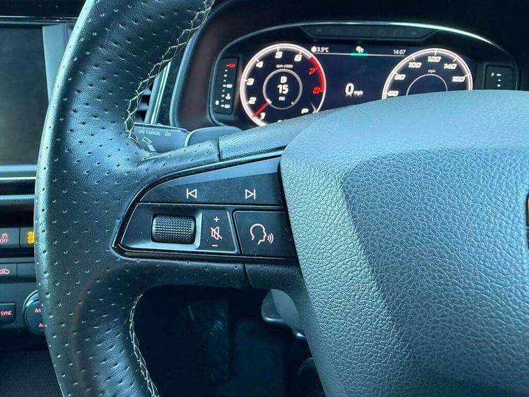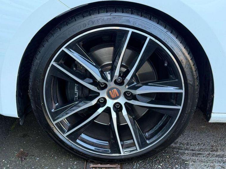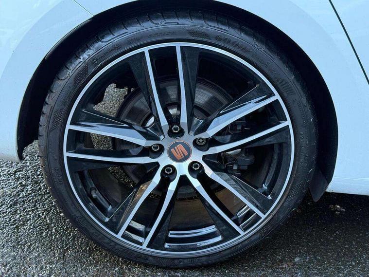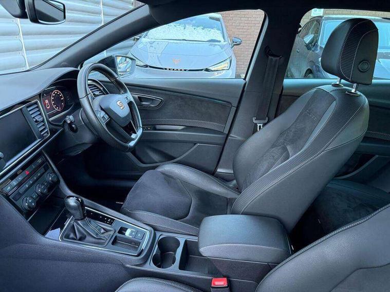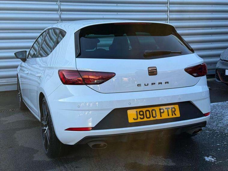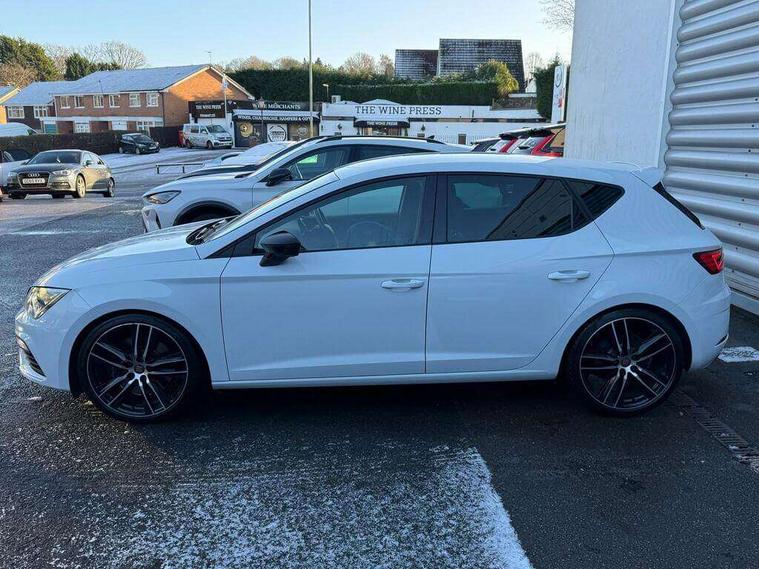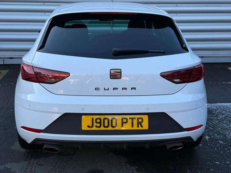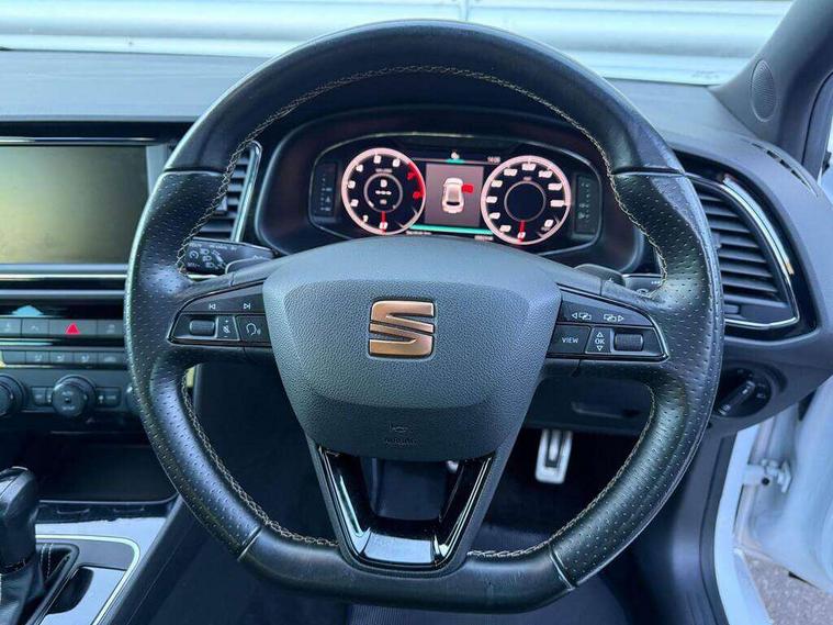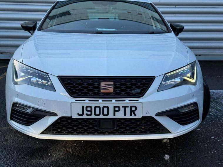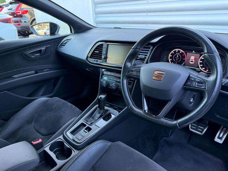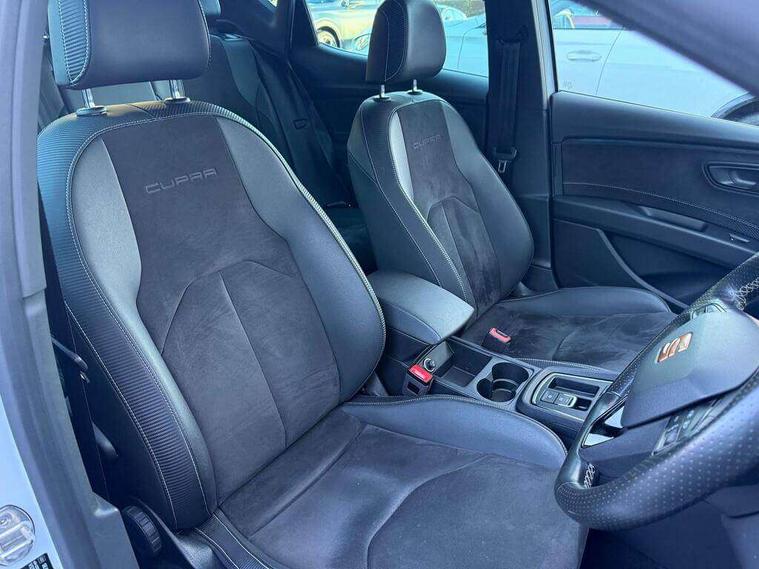 CUPRA performance interface, Digital cockpit, Electro-mechanical progressive power assisted steering, Front and rear parking sensors, Front assist with pedestrian protection, Full Link Smartphone Integration with Mirror Link, Apple Car Play, Google Android Auto with USB Type C cable for Apple and Android compatibility, Media system plus with 8" display, 4 USB, 8 speakers, CD, voice control, DAB, bluetooth and handsfree, steering wheel mounted audio and phone control, Navigation system 3D map display, high resolution colour driver display, two SD card slots, RPM, trip computer, outside temp gauge, instrument light brightness, low fuel warning light, lights on reminder, gearshift indicator, SEAT drive profile CUPRA with 4 mode (Cupra/Normal/Sport/Individual), throttle response, sound actuator and gearshift, SEAT logo boot release, Service interval indicator, Dynamic chassis control, Lowered sports suspension, Auxiliary input socket, SEAT USB media cable, Black front grille, Body colour door handles, Body coloured bumpers, Dark tinted rear windows, Electric folding door mirrors, Electric front/rear windows, Electrically adjustable and heated door mirrors, Exclusive Cupra front and rear bumpers, Full LED headlights with LED day time running lights + LED rear tail lights + LED licence plate lights and LED front and rear fog lights, Gloss black exterior mirrors with integrated LED indicators, Gloss black front grille frame, High gloss black finish B and C pillars, Illuminated aluminium front door sill with CUPRA logo, Rear wash/wipe, Visible dual exhaust pipes, 12v power point in centre console, 60/40 split folding rear seat with armrest, Additional heating and ventilation outlet in rear of centre console, Aluminium pedals, Black interior roof, Boot storage net, Cargo rings in boot, Driver and passenger seat height adjust, Driver and passenger sun visor, covered and illuminated mirror, driver sun visor with card holder, Driver seat lumbar adjustment, Dual zone climate control, Dust/pollen filter, Flat bottomed perforated leather steering wheel with white stitching and CUPRA logo and leather gear knob, Front and rear head restraints, Front centre armrest with storage compartment, Front cupholders x 2, Front passenger seat lumbar adjustment, Front seatback storage pockets, Front sport seats in microsuede, Front/rear floor mats, Height adjustable front and rear headrests and third rear headrest, Height/reach adjust steering wheel, High centre console with integrated box & cup holder, rear air outlet, with armrest in front seats, Interior copper and black detailing, ISOFIX points in outer rear seats with top tether anchorage points, Luggage tie-down hooks, Multi-colour ambient interior lighting, Steering wheel gearshift paddles, Storage box under drivers and passenger seat, Convenience pack+ - Leon, 3 point seatbelts on all rear seats, ABS, traction control system and front differential lock system, Child proof door locks, Driver and front passenger airbags with front passenger airbag de-activation, front side, curtain, driver knee airbags, EBA, Electric handbrake, Electronic parking brake with auto hold, ESC with switch off key, Front and rear black brake calipers with cupra logo, Front seatbelt pretensioners, Front seatbelt reminder, Hill hold control, Multi-Collision braking, Tyre pressure monitoring system, 2 folding remote keys with window open/close function and boot opening/door mirror folding function, Central locking fuel filler cap, Engine immobiliser, Locking wheel bolts, Remote central locking + deadlocks, Volumetric alarm with back up horn, Gloss black interior detailing, 19" Cupra Machined alloy wheels 30/2, Space saver spare wheel,