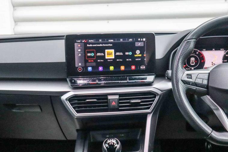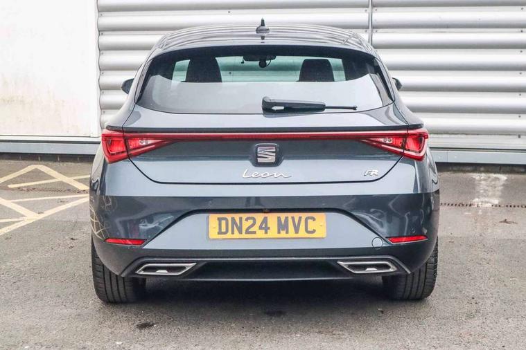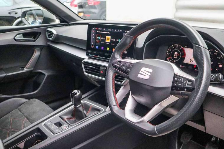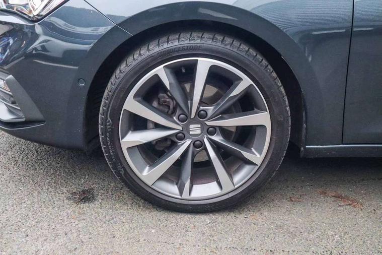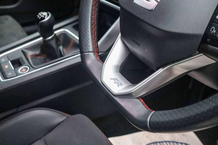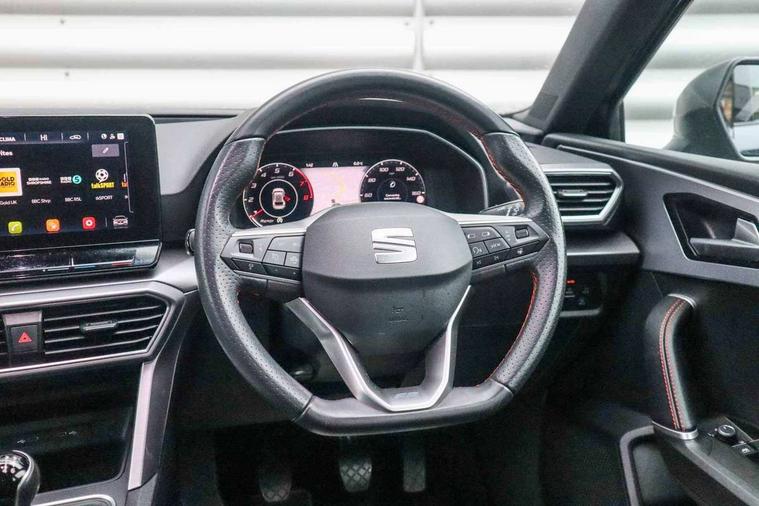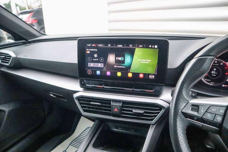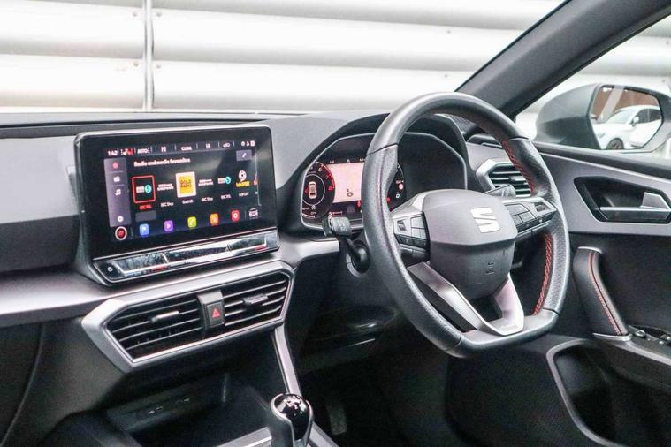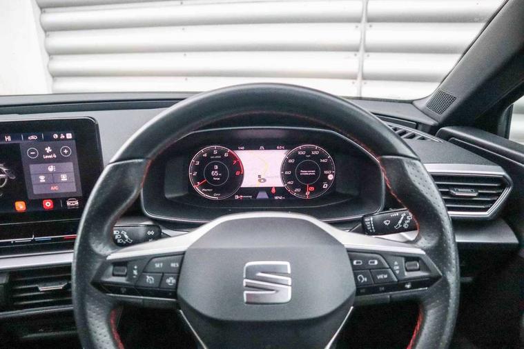 Digital cockpit, E-call, Four x USB Type C ports, Front assist with forward collision warning braking reaction to vehicles, pedestrians and cyclists, Full link smartphone integration with Mirror Link, wireless Apple CarPlay and wired Google Android Auto, Lane assist, Lockable tailgate, Park assist (inc front/rear parking sensors), Power assisted speed sensitive electro-mechanical steering, Rear view camera, RPM, trip computer, outside temp gauge, instrument light brightness, low fuel warning light, lights on reminder, gearshift indicator, SEAT drive profile with 4 modes (Eco/Normal/Sport/Individual), throttle response, Service interval indicator, Start/stop system with regenerative braking, Sports suspension, XDS electronic differential lock and dynamic traction support, 7 speakers, Auxiliary input socket, Auto dimming rear view mirror, Body colour door handles, Body coloured bumpers, Dark tinted rear windows, Door mirror LED indicator lights, Dynamic headlight range control, Electric adjustable/heated/folding door mirrors with memory, Electric front/rear windows, FR sports bumper, Illuminated front door sill, LED front fog lamps, LED Headlights with dynamic turn signals, LED tail lights and rear fog lights with rear coast to coast lighting, Rear side wing doors, Rear wash/wipe, Separate daytime running light with automatic headlight control and coming home feature, Third brake light, Welcome light silhouette from exterior mirrors, Windshield wiper intermittent control with light/rain sensor, 12v power point in centre console, 3 seat bench in 2nd row, 60/40 split rear bench seat with armrest, Ambient lighting with glovebox, footwell and single monocolour, Black headlining, Dust/pollen filter, Electric driver lumbar support + passenger manual lumbar support, Folding boot cover, Front and rear height adjustable headrests, Front and rear reading lights X 4, Front centre armrest, Front seatback storage pockets, Heated front seats, Heated leather steering wheel with leather gearstick, Height/reach adjust steering wheel, Interior wraparound lighting (FR), ISOFIX points in outer rear seats with top tether anchorage points, Luggage tie-down hooks, Microsuede cloth upholstery, Power driver seat with memory and manual height adjustable passenger seat, Single front passenger seat, Sunvisors with covered illuminated mirror, Three zone climate control, Media system plus with navigation - Leon, 3 point seatbelts on all rear seats, ABS, Brake control system - ESC and brake booster, Child proof door locks, Driver and front passenger airbags with front passenger airbag de-activation, front side and curtain airbags, Electronic parking brake, Extended safety system - seat belt tensioner, window closure and hazard lights, Hill hold control, Rear disc brakes, Seat belt reminder for front and rear seats, Tiredness recognition system, driver alert system, Tyre pressure monitoring system, Anti theft alarm system with interior monitoring in cab, backup horn and towing protection, KESSY Go (Keyless start), Locking wheel bolts, Wireless phone charging, Chrome interior detailing, 18" Performance machined alloy wheels with 92Y tyres, Tool kit,