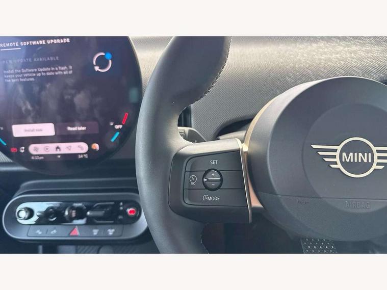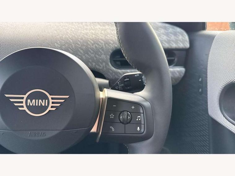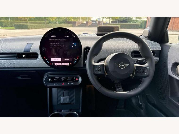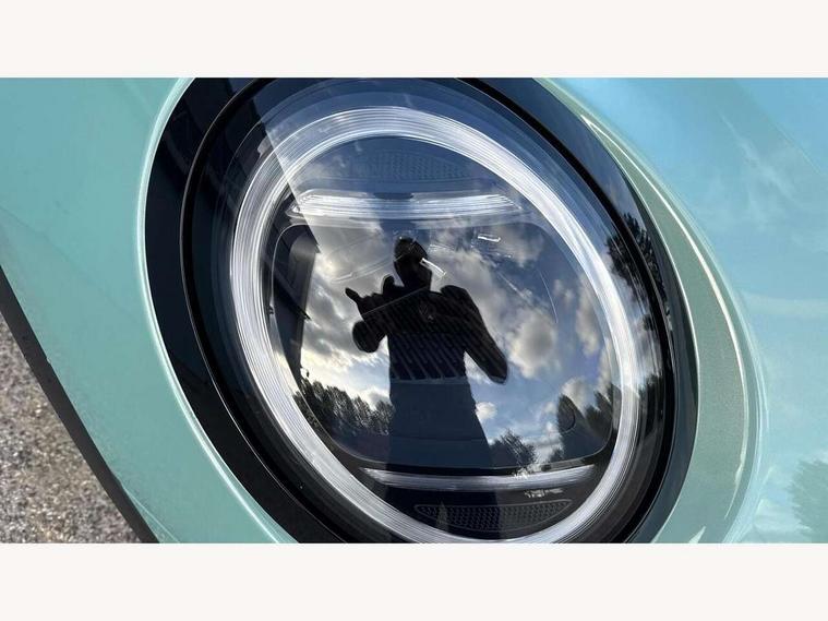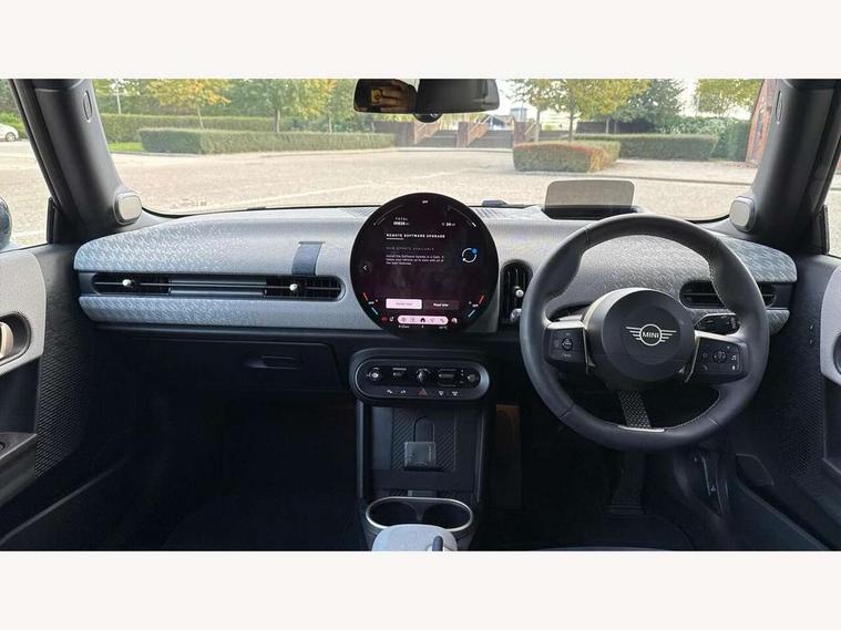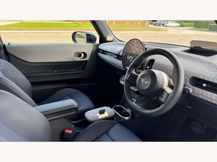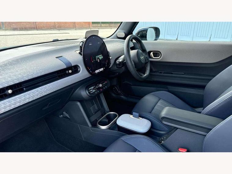 Central toggle bar, Circular OLED Screen, Compatible mobile phone bluetooth with audio streaming, Cruise control, Digital instrument cluster, Electro-mechanical speed dependant steering assistance, Emergency call service, Gaming controller with intelligent personal assistant voice update, MINI Experience Modes, Mini navigation system, On board computer, Service interval indicator, Tailgate, 7 speed steptronic transmission with double clutch, DAB Digital radio, Personal eSim, Rear USB charger, Auto headlights, Electric adjustable heated door mirrors, Electric front windows, Heated rear window, Heated windscreen washer jets, LED 3rd brake light, LED daytime running lights, LED Headlights, LED indicator lights, LED rear lights, Logos in Vibrant Silver, Rain sensor window wipers, Rear fog lights, Rear window wiper, Vibrant silver grille surround, 2 seat bench in second row, 2 zone automatic air conditioning, 60/40 rear seat bench, Ambient lighting, Cupholders, Dark headliner, Floor mats, Front and rear head restraints, Front compact armrest, Heated steering wheel, Height adjustable passenger seat, Lidded storage box in grey knit, Luggage compartment lighting, Single front passenger seat, Sport Vescin Steering Wheel black with vibrant silver accents, Sunvisors with vanity mirrors, Vescin synthetic leather upholstery includes dash knit in beige with grey accents, Driving assistant pack - Cooper Hatchback, Park assistant pack - Cooper Hatchback, 3 point seatbelts on all four seats, 6 Airbags - front, side, head and seat belt tensioners, Anti-lock braking system (ABS), DSC - Dynamic Stability Control, Electronic parking brake, Front and rear disc brakes, Front ISOFIX (iSize), Front passenger airbag deactivation, Traction control, Tyre pressure monitoring system, Alarm, Immobiliser, Remote central locking, Blue decorative dash strap, Tyre repair kit,