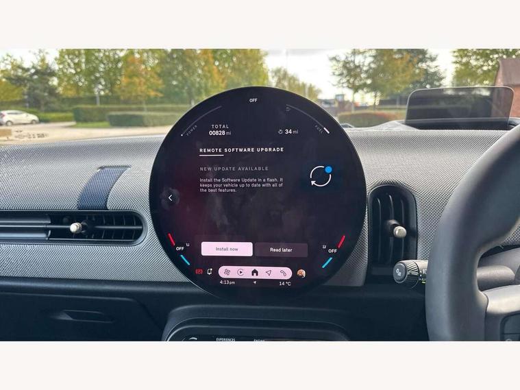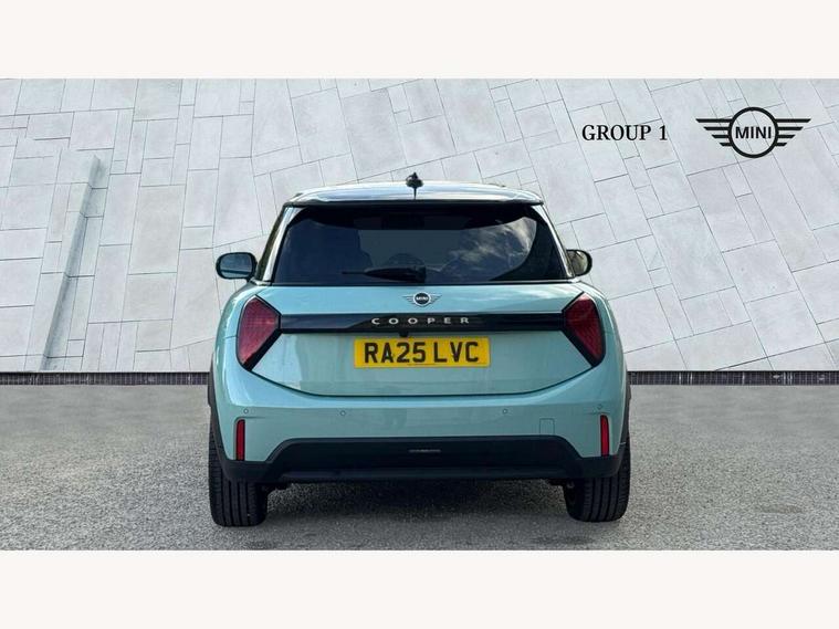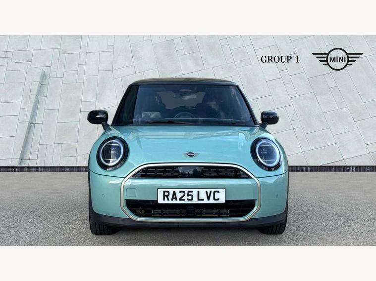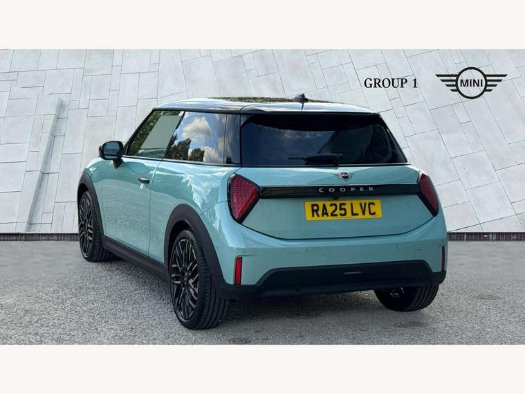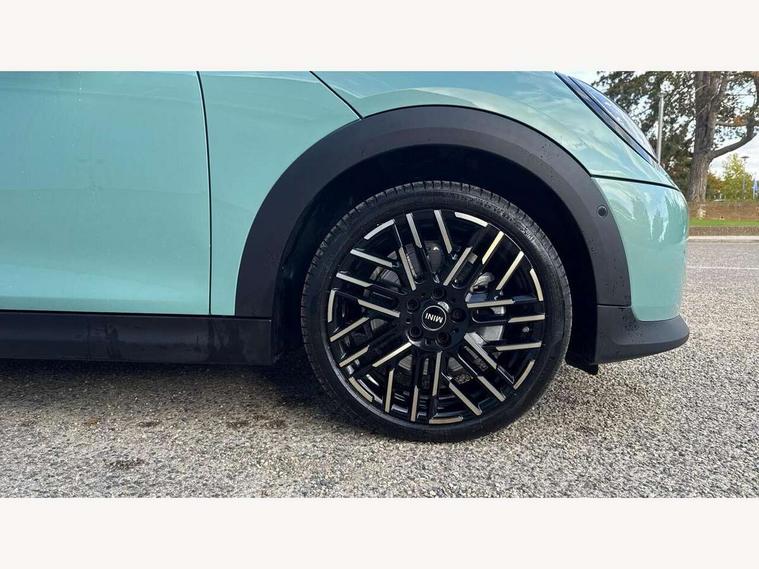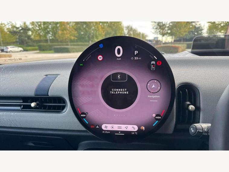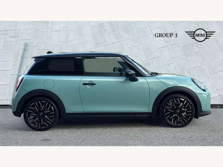 Central toggle bar, Circular OLED Screen, Compatible mobile phone bluetooth with audio streaming, Cruise control, Digital instrument cluster, Electro-mechanical speed dependant steering assistance, Emergency call service, Gaming controller with intelligent personal assistant voice update, MINI Experience Modes, Mini navigation system, On board computer, Service interval indicator, Tailgate, 7 speed steptronic transmission with double clutch, DAB Digital radio, Personal eSim, Rear USB charger, Auto headlights, Electric adjustable heated door mirrors, Electric front windows, Heated rear window, Heated windscreen washer jets, LED 3rd brake light, LED daytime running lights, LED Headlights, LED indicator lights, LED rear lights, Logos in Vibrant Silver, Rain sensor window wipers, Rear fog lights, Rear window wiper, Vibrant silver grille surround, 2 seat bench in second row, 2 zone automatic air conditioning, 60/40 rear seat bench, Ambient lighting, Cupholders, Dark headliner, Floor mats, Front and rear head restraints, Front compact armrest, Heated steering wheel, Height adjustable passenger seat, Lidded storage box in grey knit, Luggage compartment lighting, Single front passenger seat, Sport Vescin Steering Wheel black with vibrant silver accents, Sunvisors with vanity mirrors, Vescin synthetic leather upholstery includes dash knit in beige with grey accents, Driving assistant pack - Cooper Hatchback, Park assistant pack - Cooper Hatchback, 3 point seatbelts on all four seats, 6 Airbags - front, side, head and seat belt tensioners, Anti-lock braking system (ABS), DSC - Dynamic Stability Control, Electronic parking brake, Front and rear disc brakes, Front ISOFIX (iSize), Front passenger airbag deactivation, Traction control, Tyre pressure monitoring system, Alarm, Immobiliser, Remote central locking, Blue decorative dash strap, Tyre repair kit,