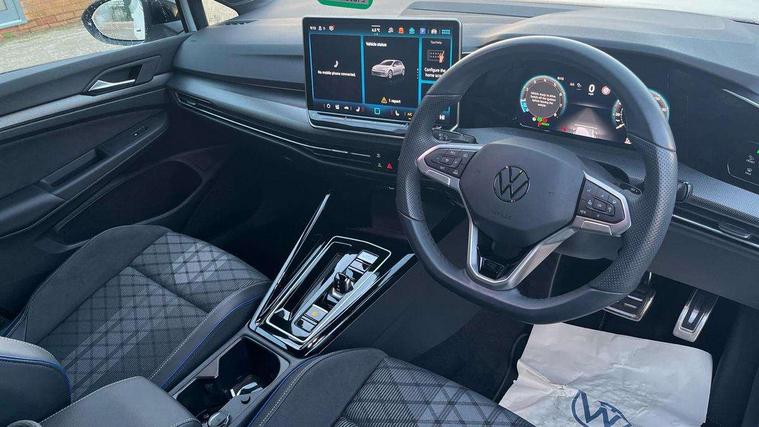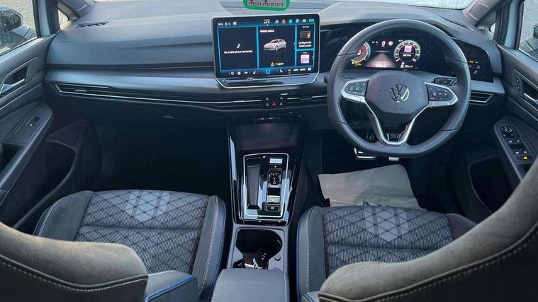 Activated carbon canister, Adaptive cruise control (ACC), Advanced driver attention and drowsiness monitor, Dynamic road sign display, Dynamic steering, E-Sim card for online connectivity, eCall emergency call system, Emergency assist, Lane keeping system Lane Assist, Multi-color Digital cockpit pro, selection of different info profile possible, Multifunction front facing camera for distance control, Navigation system, Oncoming vehicle braking when turning including swerve support, Preparation for light assist system, Speed limiter, Speedo, rev counter, electronic odometer, trip, service interval display, exterior temperature and fuel gauge, Traffic jam assist, Voice enhancer and voice control, Warning signal and warning light for front and rear seatbelts not fastened, We connect plus preparation, We connect preparation, Wireless app connect, Hybrid propulsion system, Petrol Particulate Filter, Start-stop system with battery regeneration (recuperation - energy recovery during braking), XDS electronic differential lock for improved traction and handling, 2 USB C ports in front, 2 USB charging sockets on the centre console in the rear charging capacity upto 45W, Comfort telephony + wireless charging, without wireless aerial connection, Digital radio reception (DAB), Diversity antenna for FM reception, Gaming platform via car app, Infotainment system with 12.9" display, Mobile phone interface with inductive charging feature, 3rd brake light, Auto dimming rear view mirror, Auto headlights, Automatic headlamp activation with Coming home and Leaving home feature, Body colored bumpers in R-Line style, Body colour door handles, Exterior mirrors convex on the left and aspherical on the right, Front and rear electric windows, Heat insulating windshield made of laminated glass, LED daytime running lights, Rain sensor, Rear exhaust tailpipe, Rear fog light on one side and reversing lights on both sides, Rear side wing doors, Rear windscreen washer and wiper with interval delay, Remote electrically foldable door mirrors, puddle lights and reverse activated passenger's door mirror, Volkswagen logo in front, illuminated lighting animation with wake up/goodbye scenario and illuminated door handles, Welcome light with surround lighting, 12V socket in front centre console, 12V socket in luggage compartment, 3 rear head restraints, 3 seat bench in 2nd row, Ambient lighting with 30 colour including LED light unit in front footwell with selectable light colour, Brushed stainless steel pedals, Carpet mats, front and rear, Chrome plated radiator grille inserts, air vent surrounds and light switch surrounds, Front centre armrest, Front seat lumbar support adjuster, Heated front seats, Integrated front head restraints, ISOFIX anchors for child seats on outer rear bench seats and on front passanger seat compatible for i-Size, Luggage compartment lighting, Manual height adjustable front seats, Plastic gear knob, Premium sports seats in front, Rear cupholder and loadthough, Sardegna cloth upholstery with front and outer rear seats Art Velour inner sides of bolsters, Single front passenger seat, Soul black instrument panel, Split folding backrest with centre armrest and unsplit rear seat bench, Storm grey roof lining, Sun visors with illuminated vanity mirrors, Black exterior Styling package with Matrix LED headlights - Golf, Winter package - Golf DSG Estate/Hatchback, 3 point height adj front seatbelts + pretensioners, 3 rear three point seatbelts, ABS, Autonomous emergency braking front assist with pedestrian and cyclist monitoring, Child locks on rear doors, Driver and front passenger airbag with front passenger airbag deactivation, Electronic parking brake with auto hold, ESC (Electronic Stability Control), Extended pedestrian protection measures, Hill start assist, Rear disc brakes, Two tone horn, Tyre pressure loss indicator, Volkswagen roadside assistance, Anti theft wheel bolts, Preparation for alcohol interlock, Decorative inserts carbon grey for dashboard and front door trim panels, 18" Leeds alloy wheels,