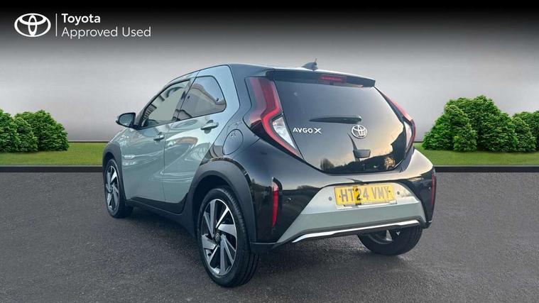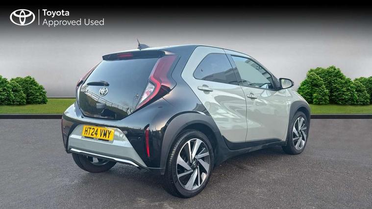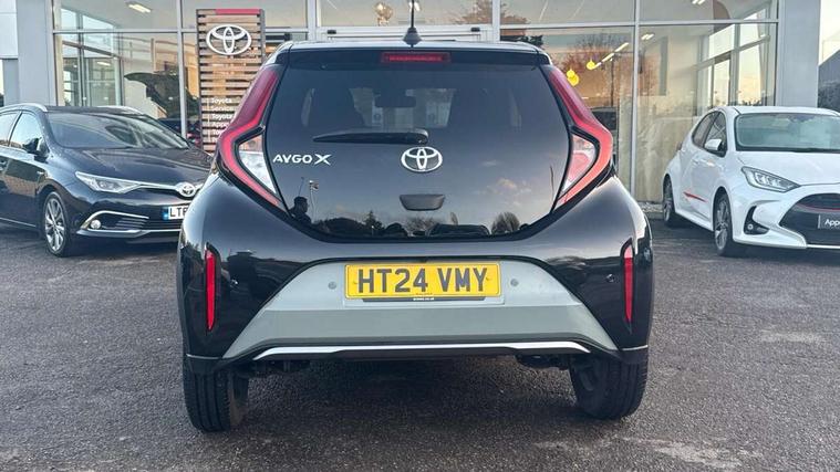 4.2" TFT colour screen, Adjustable speed limiter, Analogue speedometer, Bluetooth connectivity, Digital tachograph, Driver attention alert system, eCall emergency call system, Electric power steering, Front and rear parking sensors with auto brake, Intersection turn assist, Key reminder warning, Noise reduction kit, Pre collision system with emergency steering assist, Remote boot door release on key, Reversing camera with static guide lines, Smart entry and push button start, Smart phone integration with Apple car play/Android Auto, Speed limit display, Start and stop, Wireless charger, Vehicle Stability Control (VSC), 10.5" HD multimedia display touch screen with Toyota smart connect, 4 speakers, DAB digital audio broadcast, USB connector, Auto headlights, Auto wipers, Automatic headlights cut-off, Automatic high beam On/Off switch, Bicycle towing hook, Black contrast roof, Black fog light surrounds, Black side protection mouldings, Black wheel arch mouldings, Body colour door handles, Body coloured front bumper, Boot door scuff plate, Eclipse black rear bumper, Electric heated door mirrors, Follow me home headlights, Front and rear underruns in silver, Front fog lights, Front power windows, Gloss black door mirrors, Gloss black upper front grille, Headlight cut-off reminder, LED daytime running lights guide, LED front light guide, LED High mounted stop lamp, LED projector headlights, Manual day/night rear view mirror, Manual headlight levelling, Pagoda roof, Power adjustable door mirrors, Power back door, Privacy glass, Rain sensor, Rear combination lights LED bulb type, Rear side wing doors, Rear windscreen defogger, Rear windscreen wiper, Remote hazard lights system, Short antenna, Variable intermittent windscreen wipers, 12v power outlet - front, 2 seat bench in 2nd row, 3 spoke leather steering wheel, 50/50 split folding rear seat, Adhesive roof headlining, Adjustable speed limiter switch on steering wheel, Audio and telephone switches on steering wheel, Auto air conditioning, Black roof lining, Body colour satin anodised insert on steering wheel, Boot light, Centre room light, Chrome interior door handles, Chrome surround on air conditioning buttons, Clean air filter, Console box storage, Floor mats, Front and rear cup holders, Front head rest deco art, Front head restraints, Height adjustable driver seat, Intelligent adaptive cruise control switch on steering wheel, ISOFIX child restraint system on rear seats, Lane departure alert switch on steering wheel, Leather gearshift knob, Light blue ambient lighting in centre console, Manual tilt steering wheel, Manually reclining and sliding driver seat, Manually reclining and sliding front passenger seat, Multimedia switches on steering wheel, Partial synthetic leather upholstery, Pollen filter, Rear door pockets, Rear head restraints, Satin silver insert on gear shift knob, Single compartment glovebox with lights, Single front passenger seat, Soft tonneau cover, Sun visors with mirror on driver and passenger side, Voice recognition switch on steering wheel, Toyota safety sense pack - Aygo X, Anti lock braking system + Electronic brake force distribution, Child safety door lock, Emergency brake light signal (EBS), Hill start assist control (HAC), Passenger airbag on/off switch, Seat belt reminder for front and rear seats, Supplement restraints system (SRS) - 6 airbags, Traction control, Tyre pressure warning system, Immobiliser, Remote power door locks, Black wheel centre caps, Tyre repair kit,