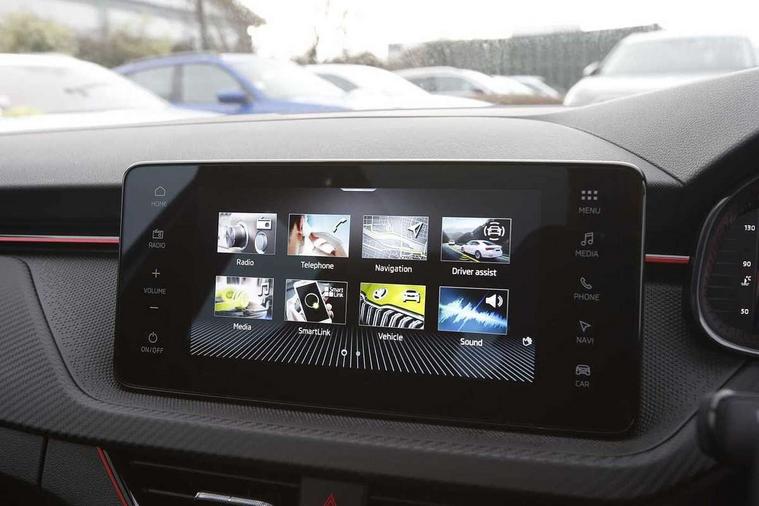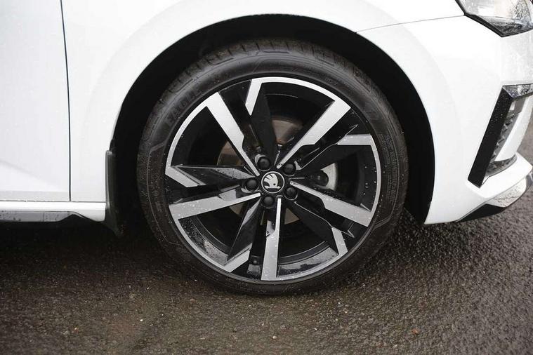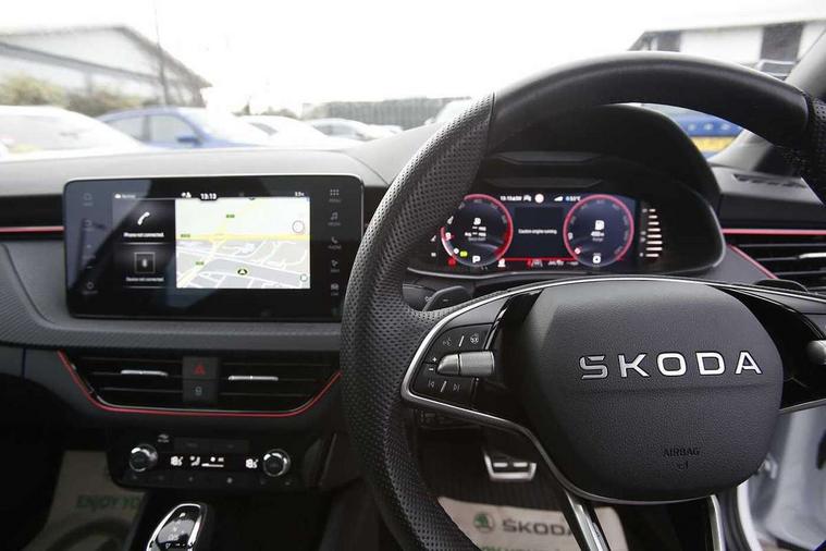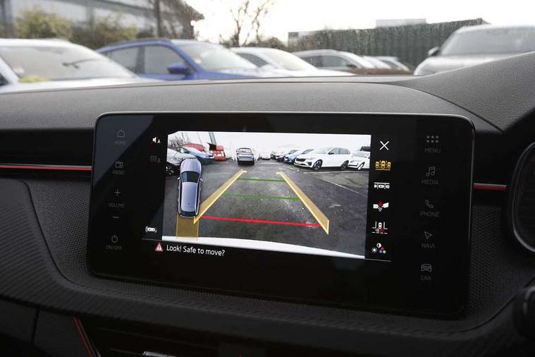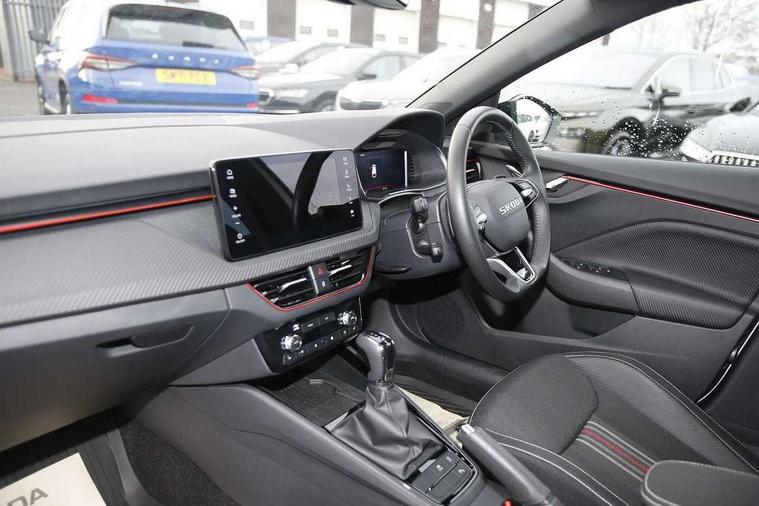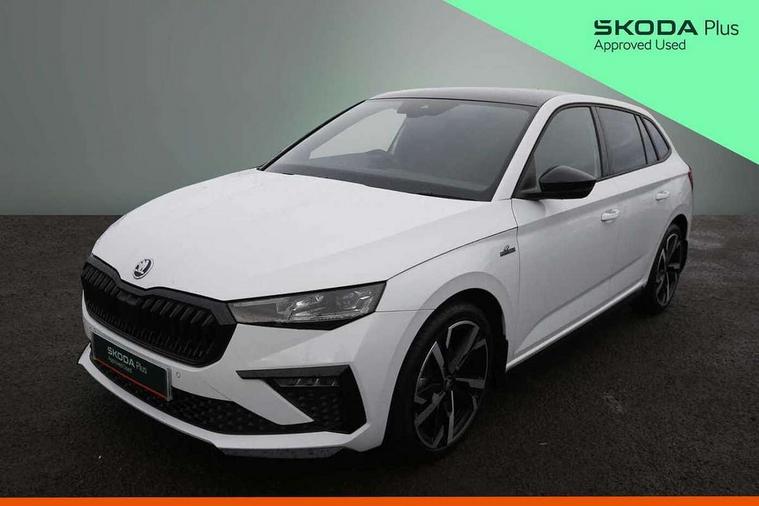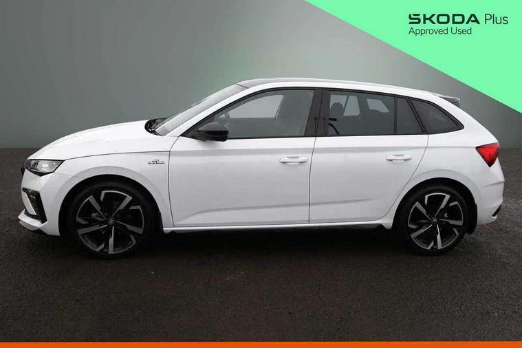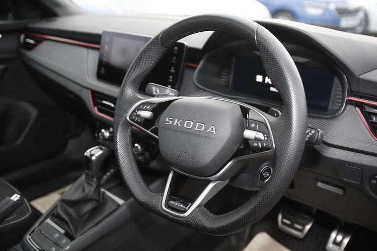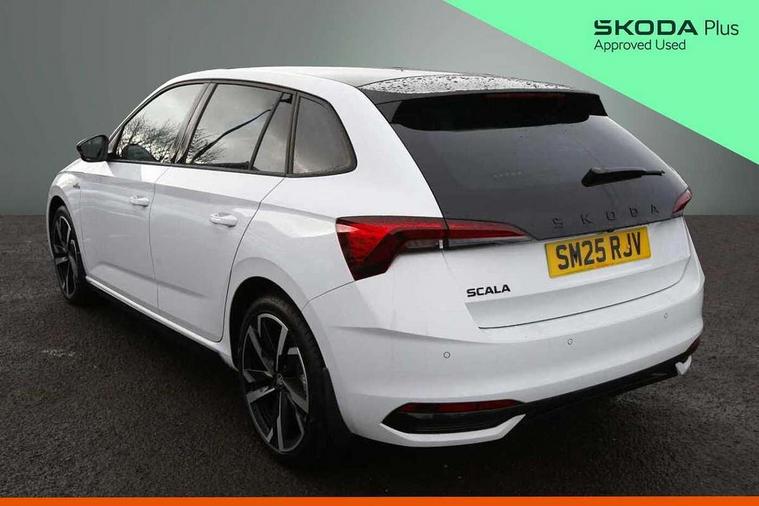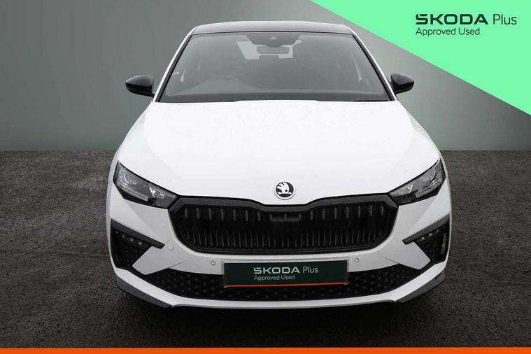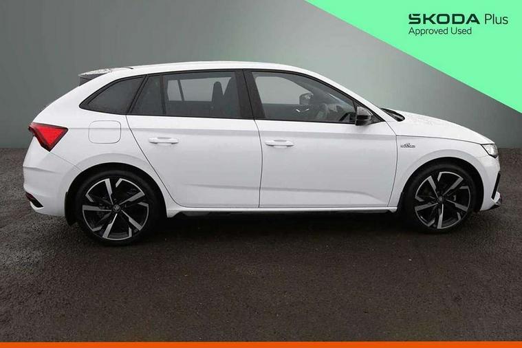 Advanced driver attention and drowsiness monitor, Bluetooth, e-Call (emergency call), Front assist system, PAS, Rear parking sensors, Rear view camera, Speed limiter, Tailgate, Traffic sign recognition, Virtual Cockpit - 10.25" digital display, Voice control system, Wireless smartlink, 4 USB C ports, 8 Speakers, 9.2" Skoda navigation display, DAB radio, Auto dimming rear view mirror, Automatic headlamp activation with Coming home and Leaving home feature, Automatic high/low beam, Automatic intermittent wipers, Black door mirrors, Black lettering on boot lid, Black radiator grille, Black rear diffuser, Black roof spoiler, Body colour bumpers, Body colour door handles, Chrome moulding around grille, Extended tailgate glass, Front and rear electric windows, Heated rear window, LED 3rd brake light, LED brake lights, LED daytime running lights, LED high beam, LED low beam, Light sensors, Monte carlo plaque, Panoramic glass roof, Privacy glass, Rear LED fog light, Rear side wing doors, Rear wiper, Tinted windows, Unique dark chrome design logo on alloy wheels, 12V socket in luggage compartment, 3 seat bench in 2nd row, Aluminium pedals, Ambient lighting in white/red, Black / White armrest stitching, Black ceiling, Black roof headlining, Cargo elements, Chrome inner door handles, Door inserts in art.leather carbon, Driver and passenger sun visors with vanity mirror, Dual zone climate control, Front and rear roof lights, Front centre armrest, Front head restraints, Height adjustable driver seat, Height adjustable passenger seat, Ice scraper, Illuminated glove compartment, Inner circulation control with pollen filter, ISOFIX for front passenger seat, Isofix preparation for back seats, Leather gearknob and handbrake lever, Luggage net under rear parcel shelf, Manual lumbar support for front seats, Monte Carlo cloth upholstery, Net package and top tether hooks in boot space, Pocket on the back of both front seats, incl. mobile phone pockets, Rear centre armrest, Red hotstamping, Single front passenger seat, Skoda lettering on steering wheel, Sport seats, Textile floor mats, Third rear headrest, Ticket holder, Top tether for front passenger seat, Umbrella in driver's door, Light and view plus pack - Scala, 3x3 point rear seatbelts, ABS, Child locks, Curtain airbags and front side airbags, Disc brakes, Driver and front passenger airbags, ESP, Hill hold control, Manual leather parking brake, One tone horn, Passenger airbag switch off function, Seatbelt reminder for driver and front passenger, Tyre pressure monitoring system, Anti theft alarm system with interior monitoring, backup horn and towing protection, Anti-theft wheel bolts, Remote central locking with 2 remote folding keys, SAFE function for remote central locking, Carbon effect decorative inserts, 18" Ursa black diamond cut alloy wheels,