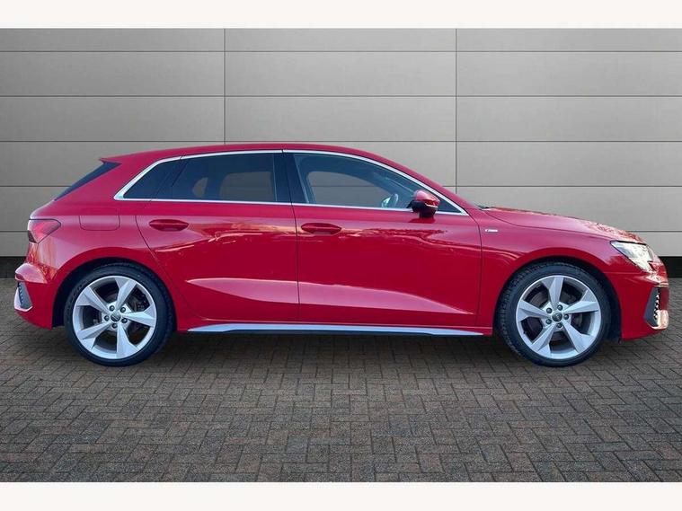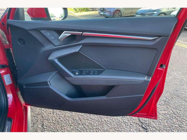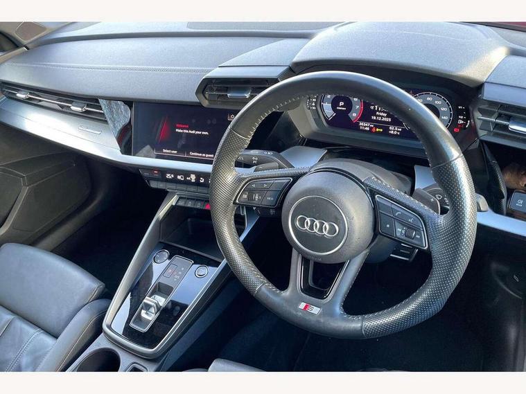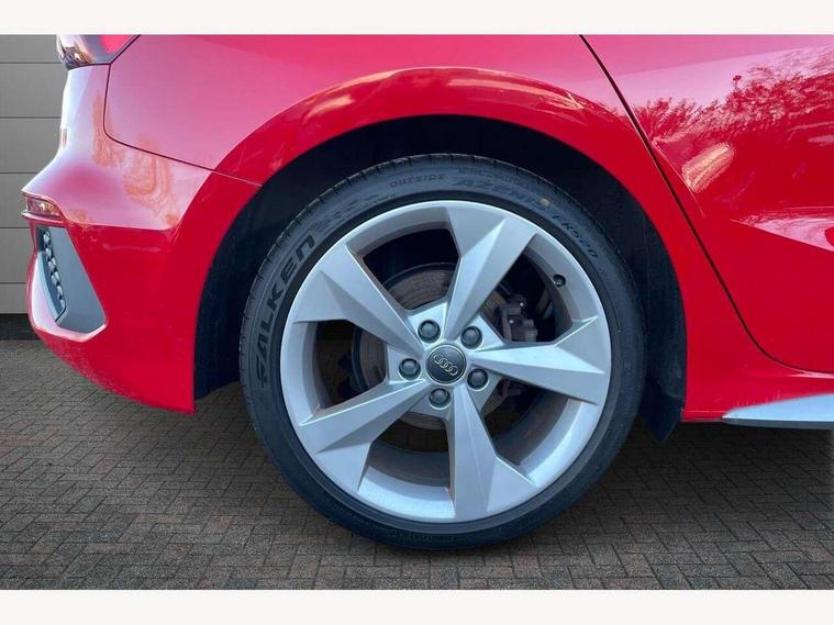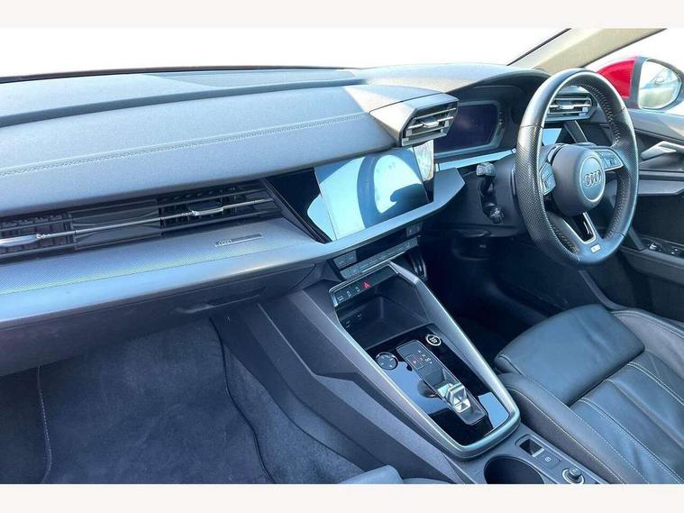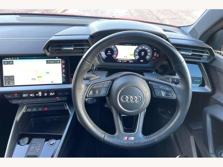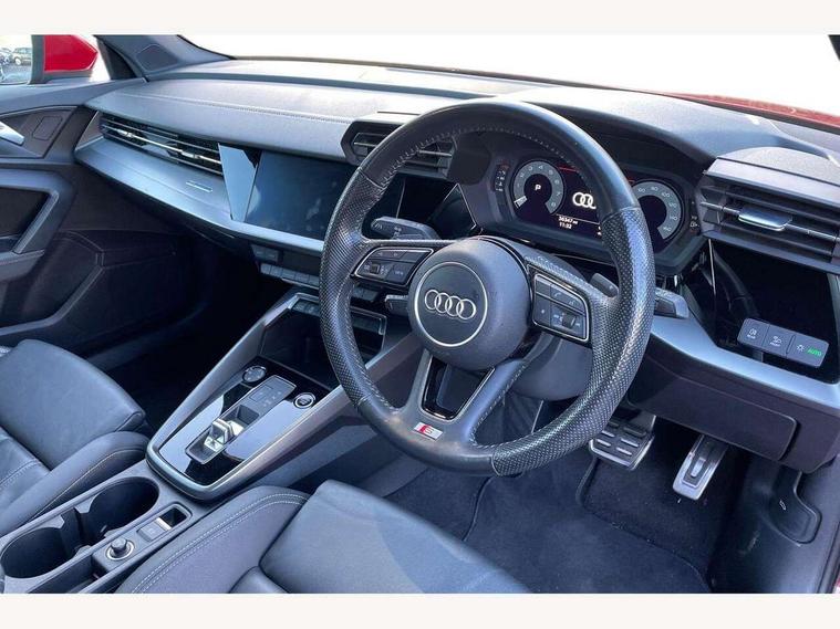 Audi connect emergency call and service, Audi drive select (Auto, Comfort, Dynamic, Efficiency and Individual), Audi smartphone interface, Audi Virtual Cockpit - 10.25" digital and colour instrument cluster, Automatic start/stop system with recuperation, Bluetooth interface, Collision avoidance assistant, Electromechanical power speed sensitive steering, Lane departure warning system, MMI Navigation Plus with high resolution 10.1" colour touch screen display, Service indicator, Trip computer, Voice control system with natural language interaction, 1xUSB-A and 1xUSB-C connection, 6 passive loudspeakers, DAB Digital radio, Acoustic glass windscreen, Aluminium window trim, Auto dimming frameless rear view mirror, Body colour exterior mirrors, Electrically adjustable/heated/folding/dimming door mirrors with kerb view includes integrated LED indications + kerb view function for passenger side, Front electric windows, Illuminated aluminium inserts front door sills with S logo, LED daytime running lights, Light and rain sensors, Privacy glass - dark tinted rear window, rear door and side windows, Rear electric windows, Rear side air outlets in grained matt black, Rear wiper, S line bumpers, S roof spoiler, 12V socket and storage compartment in front centre console, 40/20/40 split folding rear seat bench with cupholder, Black cloth headlining, Dual zone electronic climate control, Front and rear centre armrest in leather, Front and rear headrests, Front/rear floor mats, Height and reach adjustable steering wheel, Interior lighting - glove compartment light and right hand side, Luggage compartment floor covering, Manual boot compartment lid, Manually adjustable front seats, Seat side bolsters, Stainless steel pedals and front footrest, Twin leather upholstery with front sports seats S embossed logo, Aluminium interior elements pack - A3 Sportback, S line styling pack - A3 Sportback, 3x3 point rear seat belts, Driver and front passenger airbag with passenger airbag deactivation, Electronic Stabilisation Control (ESC) including ABS, ASR and EDL, First aid kit with warning triangle and 2 safety vests, Hill hold assist, Pre-sense front with pedestrian and cyclist detection, Seatbelt monitoring, Tyre pressure loss indicator, Anti theft alarm, Anti-theft wheel bolts, Electronically operated child lock, Immobiliser, Remote control central locking, Accent surfaces in the dashboard and centre console in platinum grey silk effect paint finish, Dark spectrum aluminium inlays,